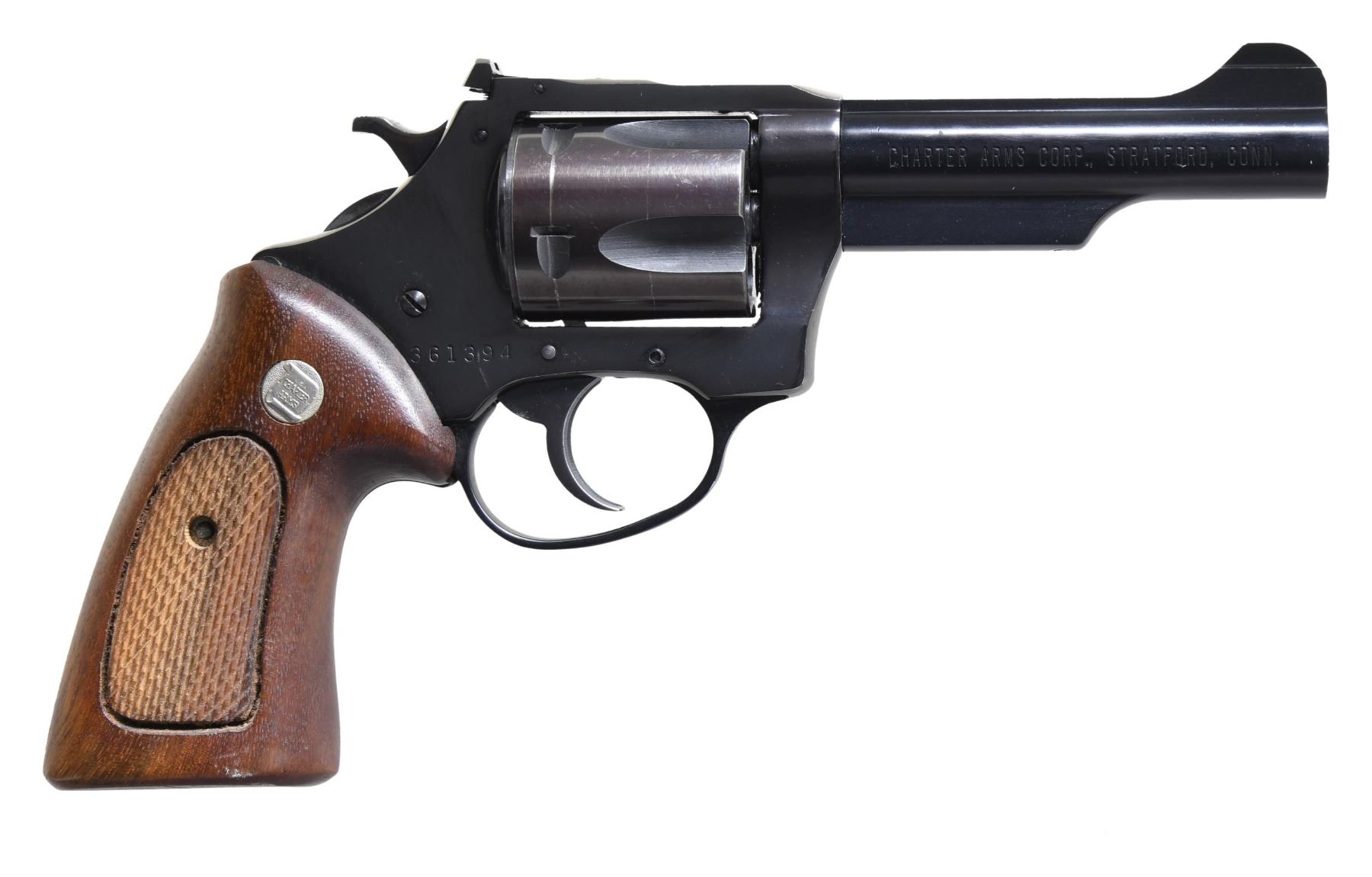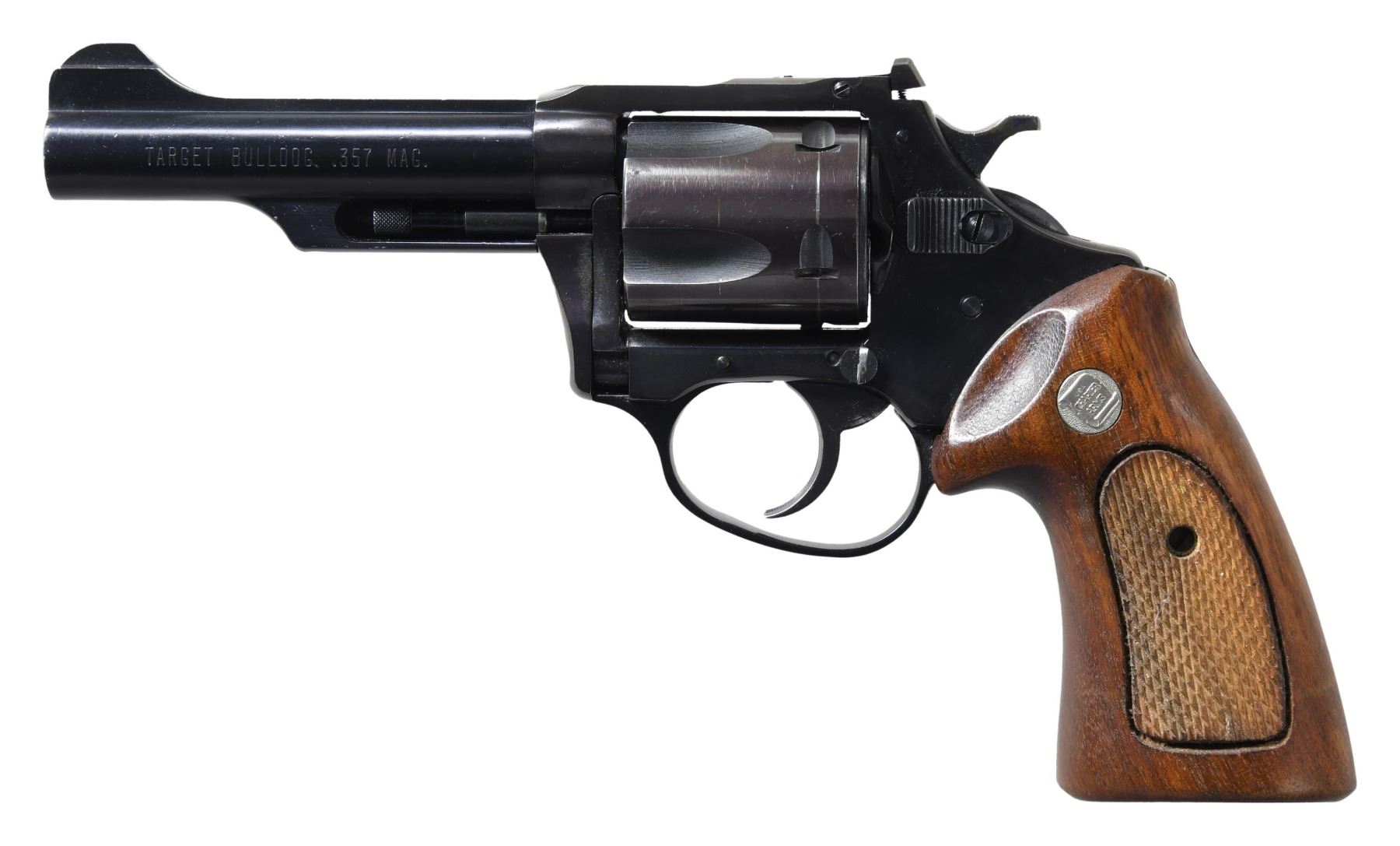 REVOLVER WITH LEATHER CASE. Cal. 357. S# 361394. Bbl. 4". Target Bulldog double action revolver mfg. by Charter Arms. Left side of the alloy bbl. sleeve is marked "TARGET BULLDOG .357 MAG.", with Charter Arms' mfg. information marked on the right. Steel frame, cyl., trigger, and other small parts exhibit a blue finish, with the aluminum bbl. sleeve and trigger guard exhibiting a black enamel type finish. Hammer exhibits a case color hardened finish. Frame is mounted with 2-piece Charter Arms silver medallion checkered wood grips. Ramped blade front sight, with square notch rear sight. UNATTACHED ACCESSORIES: brown leather soft case. CONDITION: good, with metal components retaining the majority of their original factory finishes, exhibiting scattered superficial handling marks and some light wear overall. Mirror bore, exhibiting strong rifling throughout. Grips are good, showing some scattered superficial marks from handling and storage. Leather case exhibits wear, but otherwise remains sturdy and serviceable. (25-1575/MLW). MODERN. $200-300.