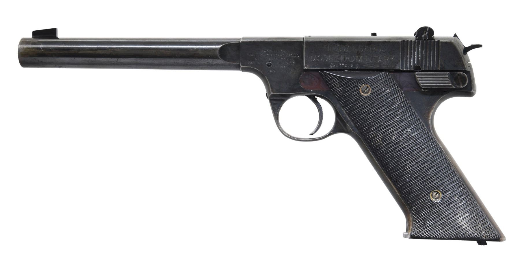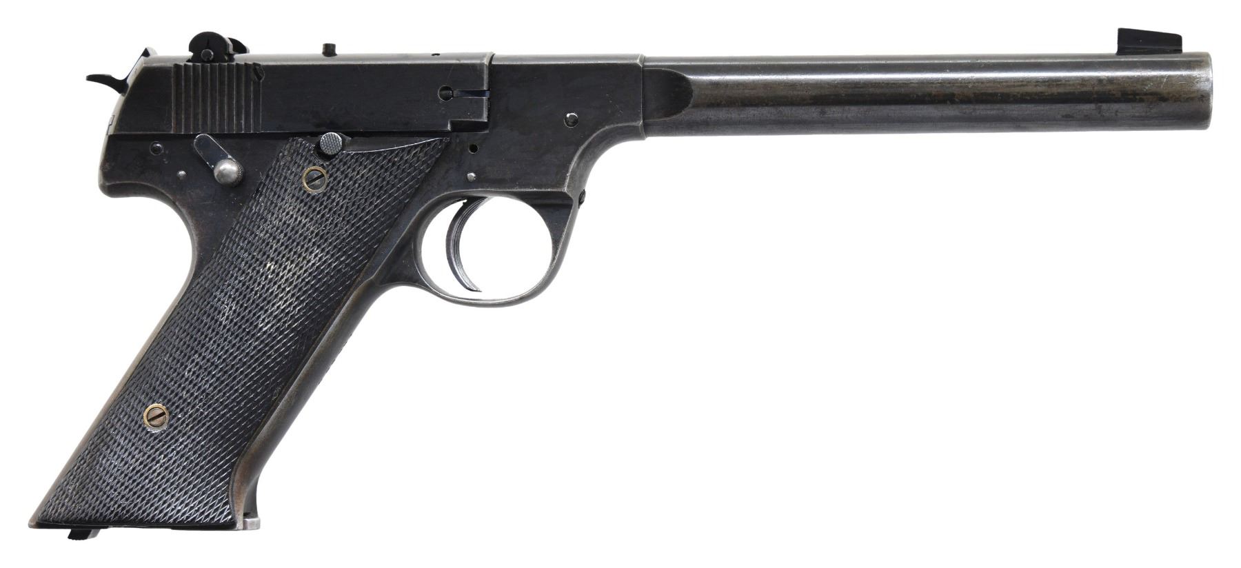 SEMI AUTO PISTOL. Cal. 22 LR. S# 166850. Bbl. 6 3/4". Blade front sight. Adjustable square notch rear sight. Left side of slide marked "CHATTA, P.D." for Chattanooga, TN police department. Blued finish. Checkered hardwood grips. MAGS: 1-10 rd. CONDITION: grips have a dark appearance with some chipping, dirt staining & handling marks. Metal retains 50% blue with overall fading to gray throughout, some handling marks, edge wear & moderate oxidation. Slide is sluggish & loose but functional when hand cycled. Safety & trigger are functional when hand cycled. Bright near excellent bore. (25-2079/MJC). CURIO. $400-600.