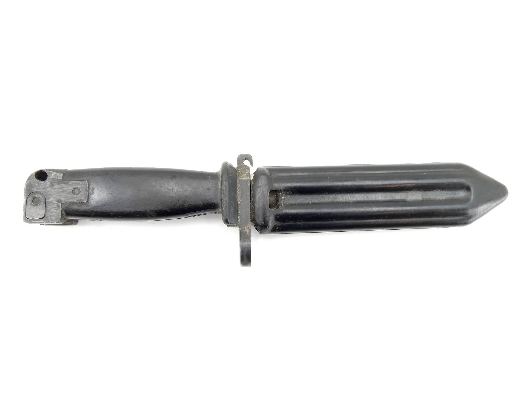 (1) FITS SEMI-AUTOMATIC 7.62MM AKM ASSAULT RIFLES, 2-PIECE BLACK POLYMER GRIP, STEEL POMMEL, NO VISIBLE MARKINGS, BLACK FIBERGLASS SCABBARD, NO VISIBLE MARKINGS, BLADE APPROX. 6" & OVERALL LENGTH APPROX. 10 7/8". SEE PHOTOS.