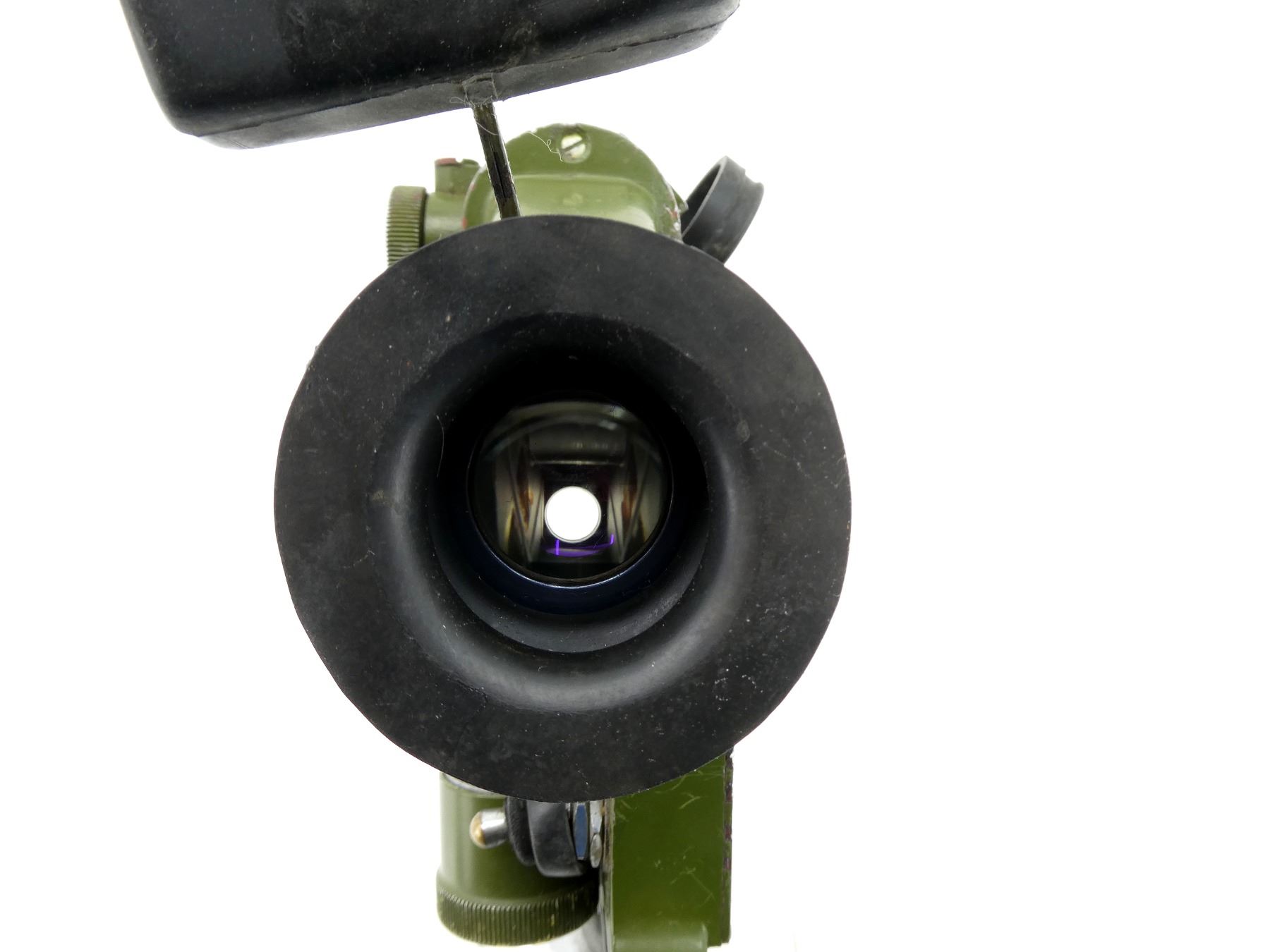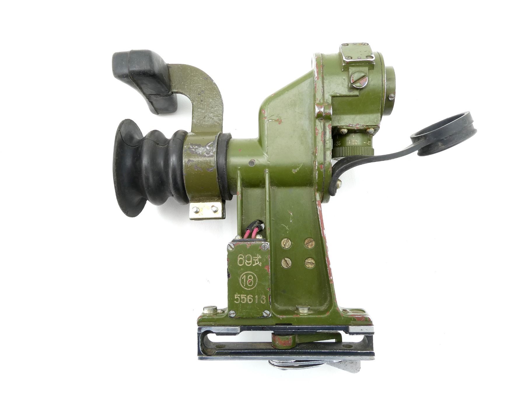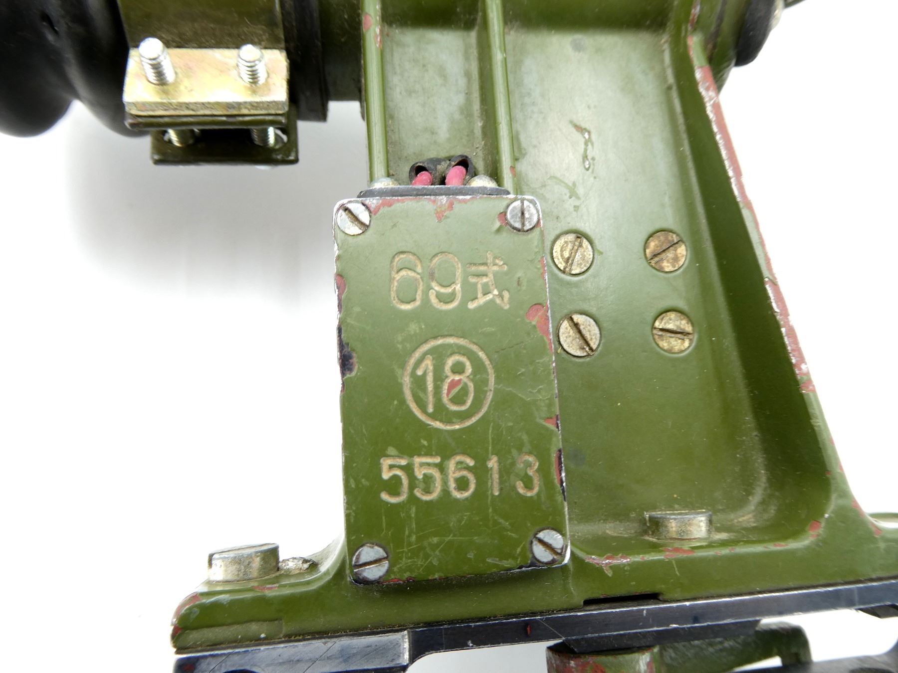 (1) FITS RPG-7 ROCKET LAUNCHERS, GREEN PAINTED METAL / POLYMER CONSTRUCTION WITH QUICK RELEASE RAIL BASE, CLEAR OPTICS WITH RETICLE, BLACK RUBBER EYE CUP & CAP, MARKED: "69" WITH CHINESE CHARACTER, "18" IN A CIRCLE, "55613", VARIOUS OTHER MARKINGS, APPROX. 6" X 2" X 7.5". SEE PHOTOS.