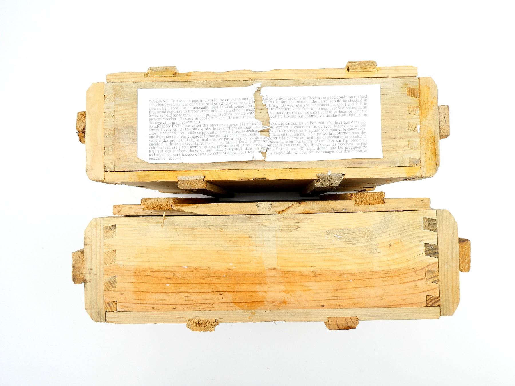 LOT INCLUDES; (2) WOODEN AMMO CRATES WITH LIDS (EMPTY), ONE HAS CRACKED HANDLE, VARIOUS MARKINGS, APPROX. 18.25" X 13.25" X 6.25". SEE PHOTOS.