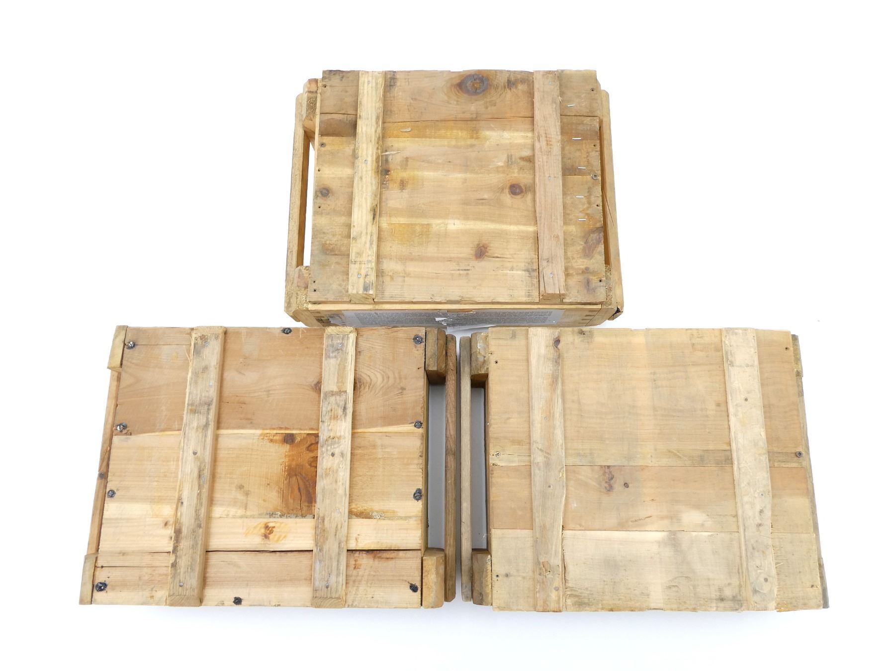 LOT INCLUDES; (3) WOODEN AMMO CRATES WITH LIDS (EMPTY), TWO HAVE CRACKED HANDLES, VARIOUS MARKINGS, APPROX. 18.25" X 13.25" X 6.25". SEE PHOTOS.