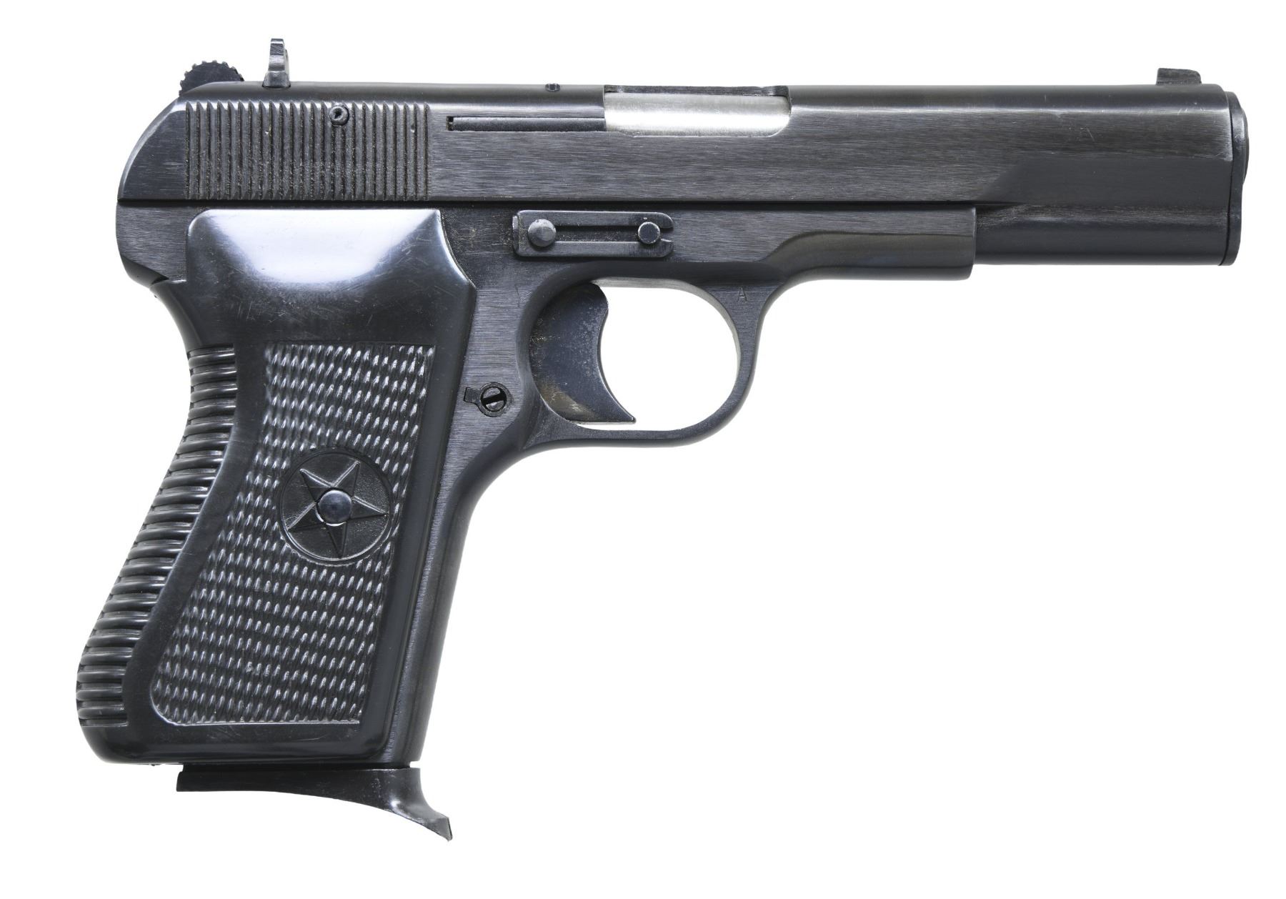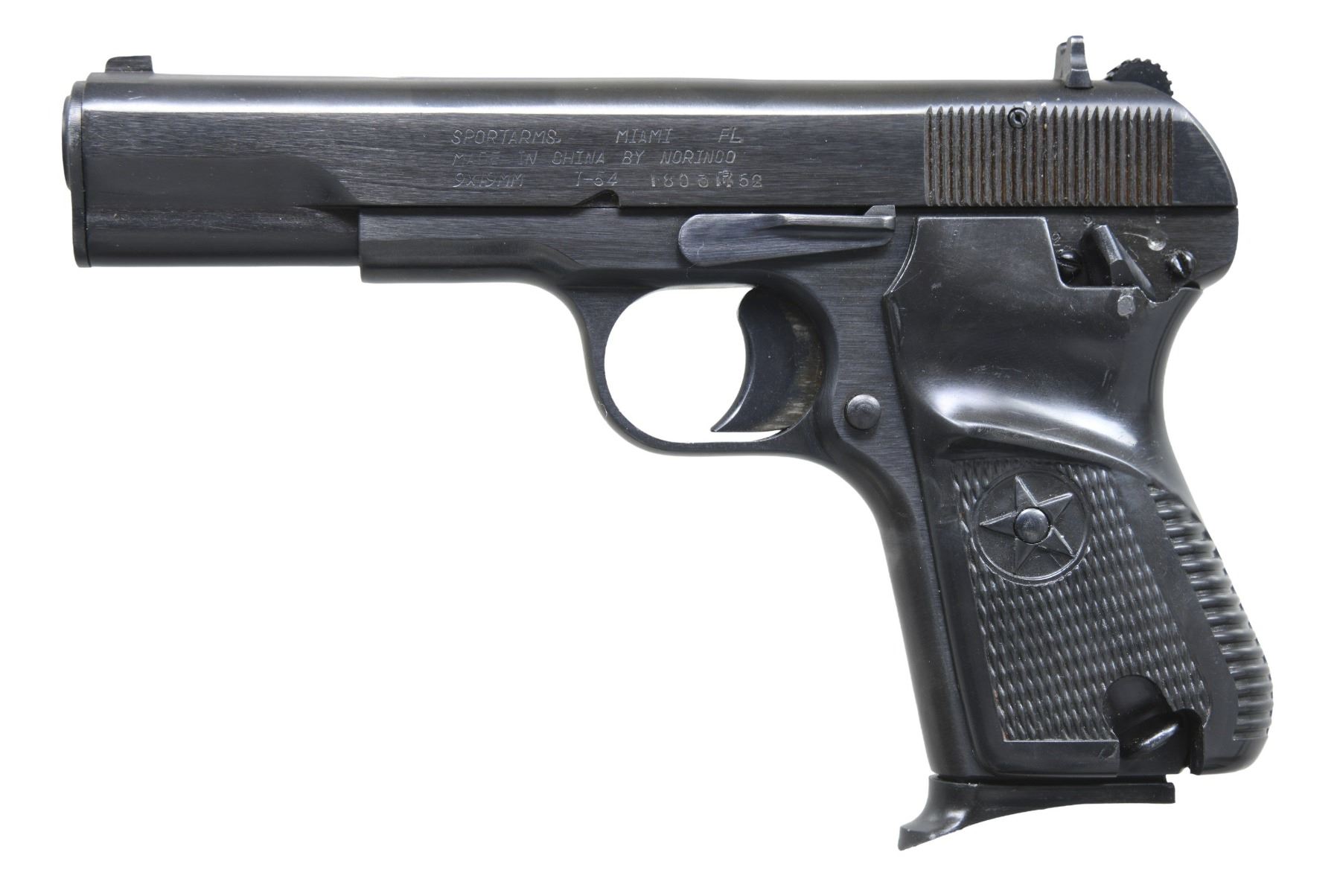 Cal. 9x19mm. S# 18031752. Bbl. 4 1/2". T-54 semi-automatic pistol mfg. in China by Norinco and imported by Sportsarms. Left side of the slide is marked with Sportsarms' importer information, above "MADE IN CHINA BY NORINCO", the model and cal. designations, as well as the S#. Metal components exhibit a blue finish overall. Frame is mounted with 2-piece checkered black synthetic grips. Fixed blade front sight, with dovetailed U-notch rear sight. Left side of frame features a safety lever. Matching numbers are present on the frame (left side beneath grip panel), slide, as well as on the bbl. Hammer housing is numbered "6249" and bbl. bushing is numbered "7227". MAGS: 1 8-rd. CONDITION: excellent, with metal components retaining the vast majority of their original factory blue finish, exhibiting a few spots of light edge wear, with some light wear present on the trigger from use. Brilliant mirror bore, retaining well defined rifling throughout. Grips show some superficial marks from handling and storage, but otherwise remain sturdy and serviceable. (25-2374/MLW). MODERN. $200-400.