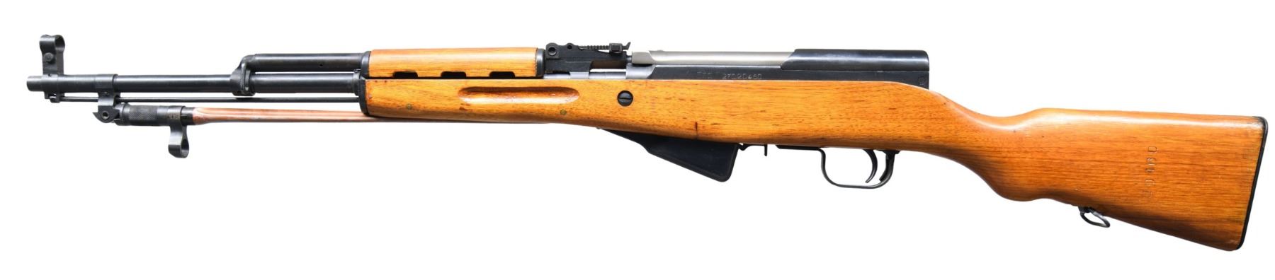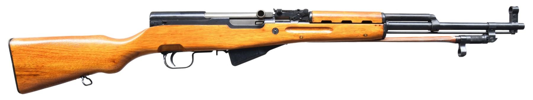 Cal. 7.62x39. S# 27020460. Bbl. 20" with Century import marking. Post front sight with hood. Tangent rear sight graduated to 1000m. All visible matching numbers. 1980's produced SKS rifle. Left side of receiver has triangle 26 marking with Chinese characters & serial number. Blued finish. Folding spike bayonet present. Asian hardwood stock set. Cleaning rod present. CONDITION: stock set shows a small patch repair to right of action, a few dings, some minor flaking finish & handling marks. Buttplate shows storage oxidation. Balance of metal retains 92% arsenal blue with some light oxidation & edge wear. Action functions properly when hand cycled. Bright near excellent bore. (25-3786/MJC). MODERN. $300-500.