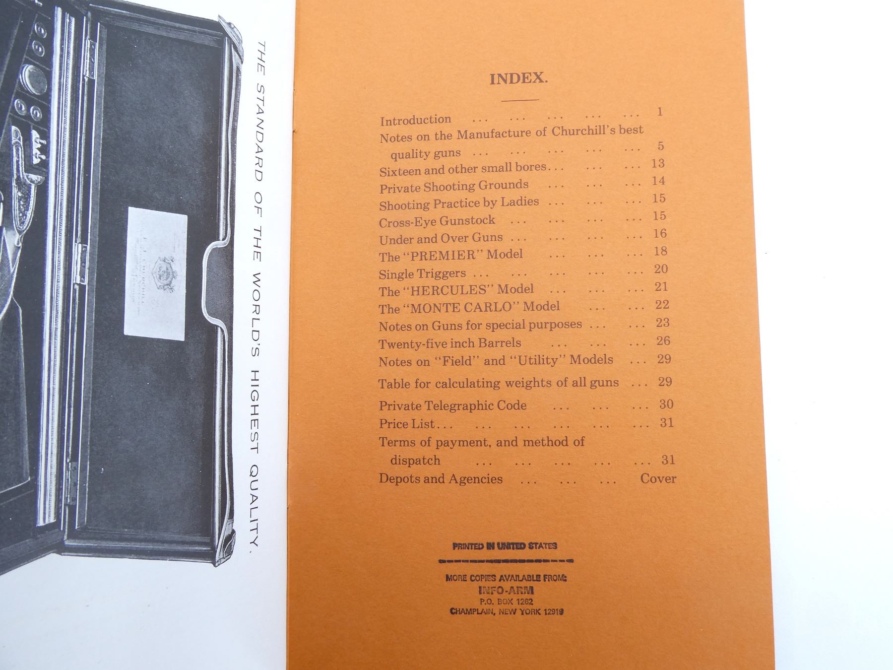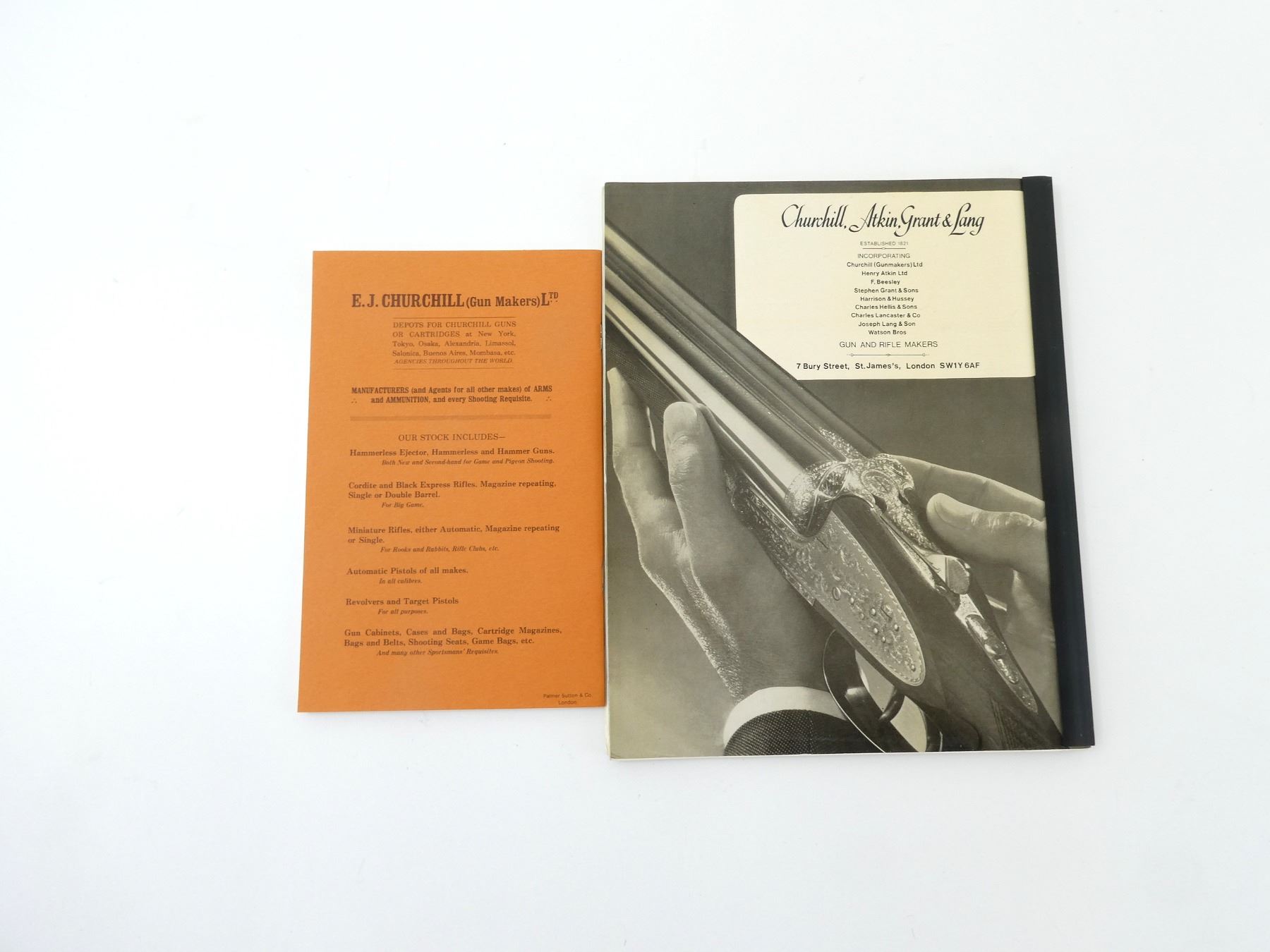 LOT INCLUDES; (1) "CHURCHILL, ATKIN, GRANT & LANG" CATALOGUE, BY CHURCHILL, ATKIN, GRANT & LANG, SOFT COVER & (1) "SOME NOTES ON CHURCHILL BEST GUNS", BY E.J. CHURCHILL (GUN MAKERS) LTD., SOFT COVER, DATED 1922. SEE PHOTOS.