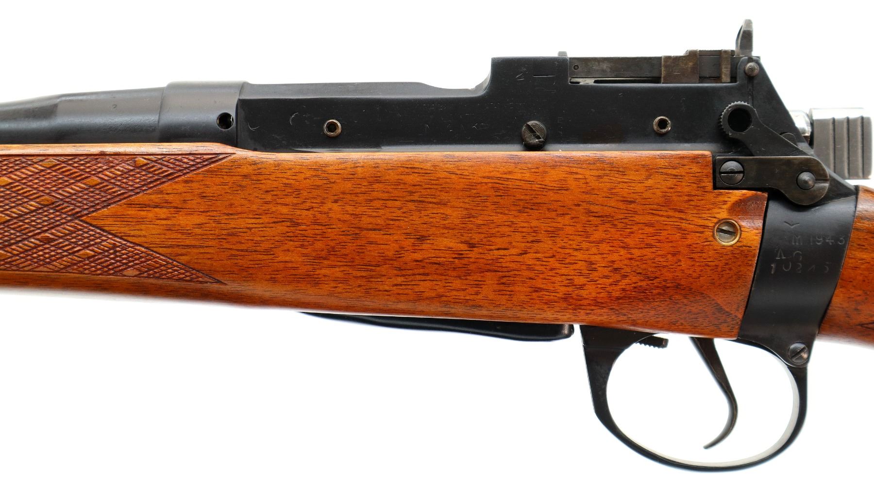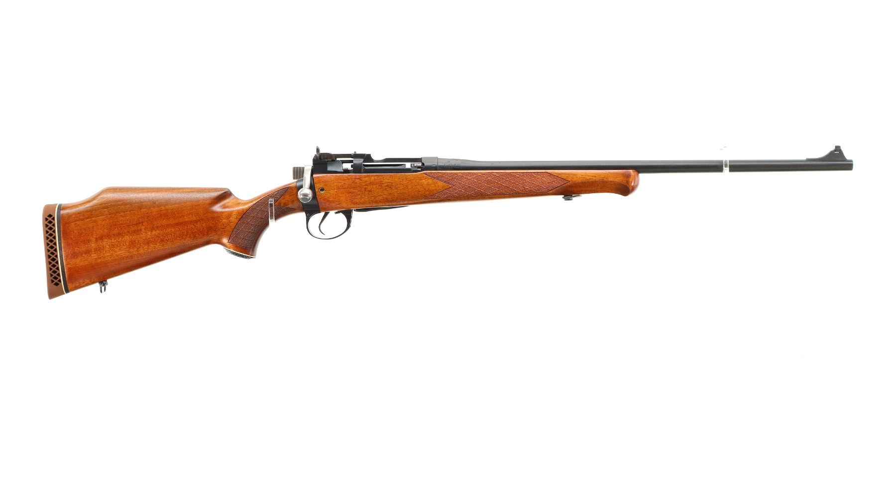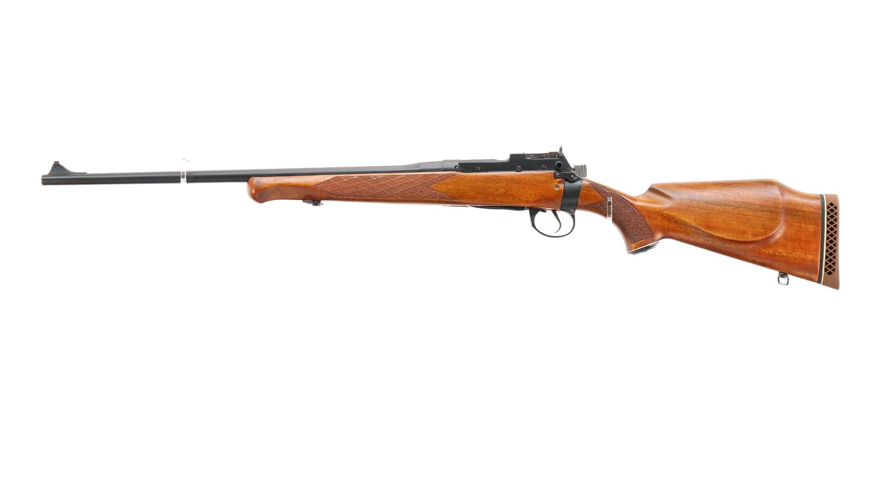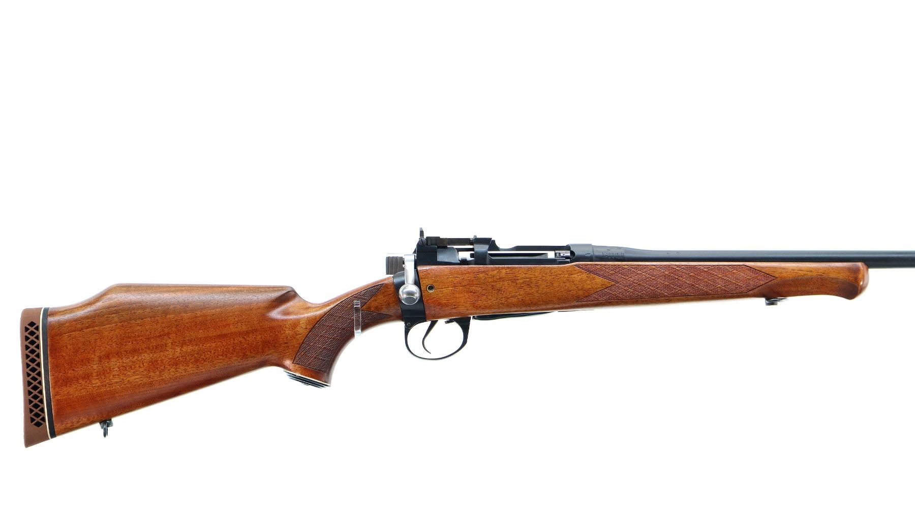 Main Description: Manufactured by Maltby 1943, bolt unnumbered. Blade front sight with ramp, adjustable milled rear peep sight, Satin blued metal finish, receiver drilled and tapped with plug screws installed, bolt polished silver. Two piece Monte Carlo sporter stocks, Schnabel forend tip, checkered forearm and pistol grip, cheek rest, brown vented rubber recoil pad, grip cap, sling swivels.