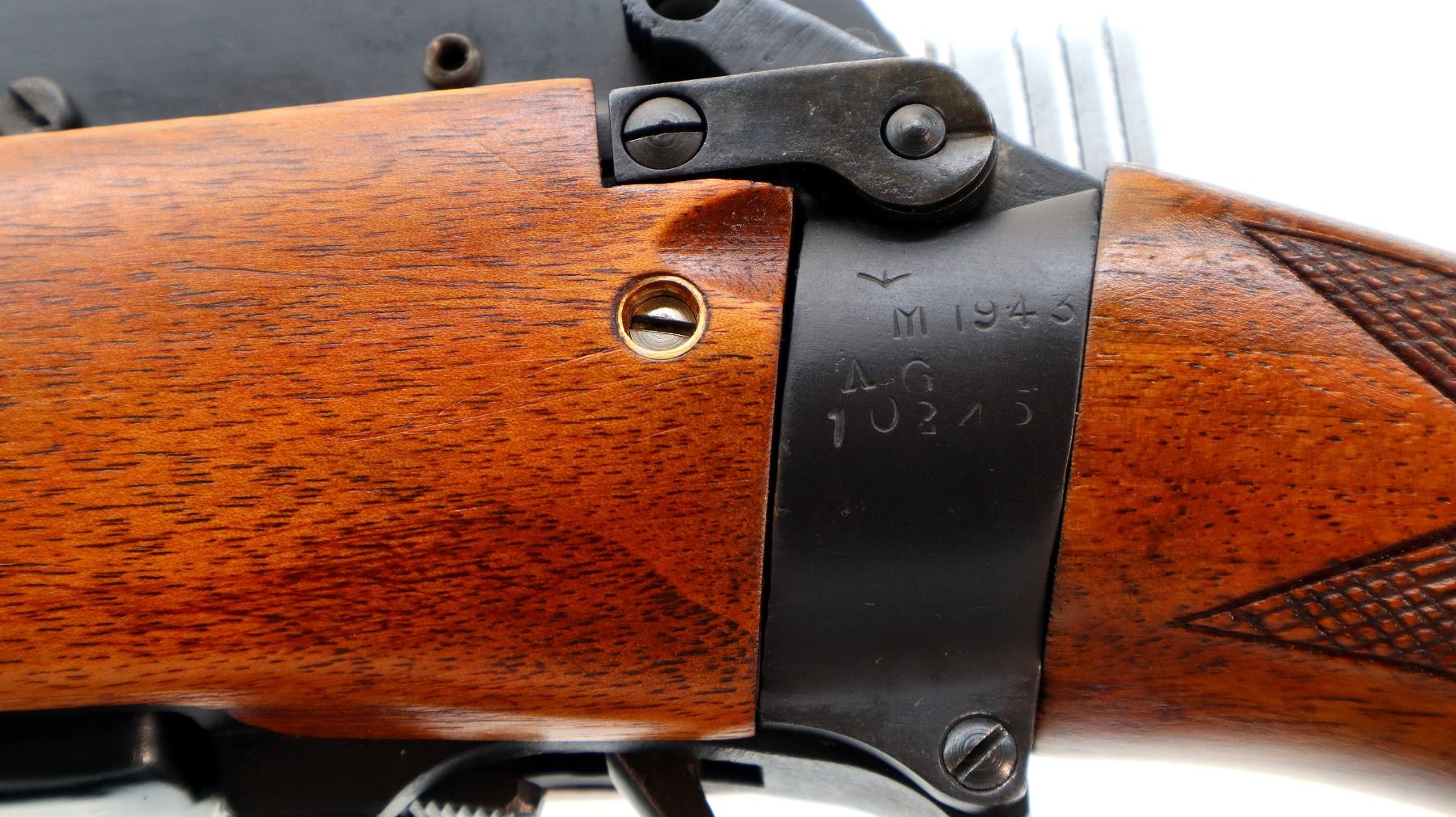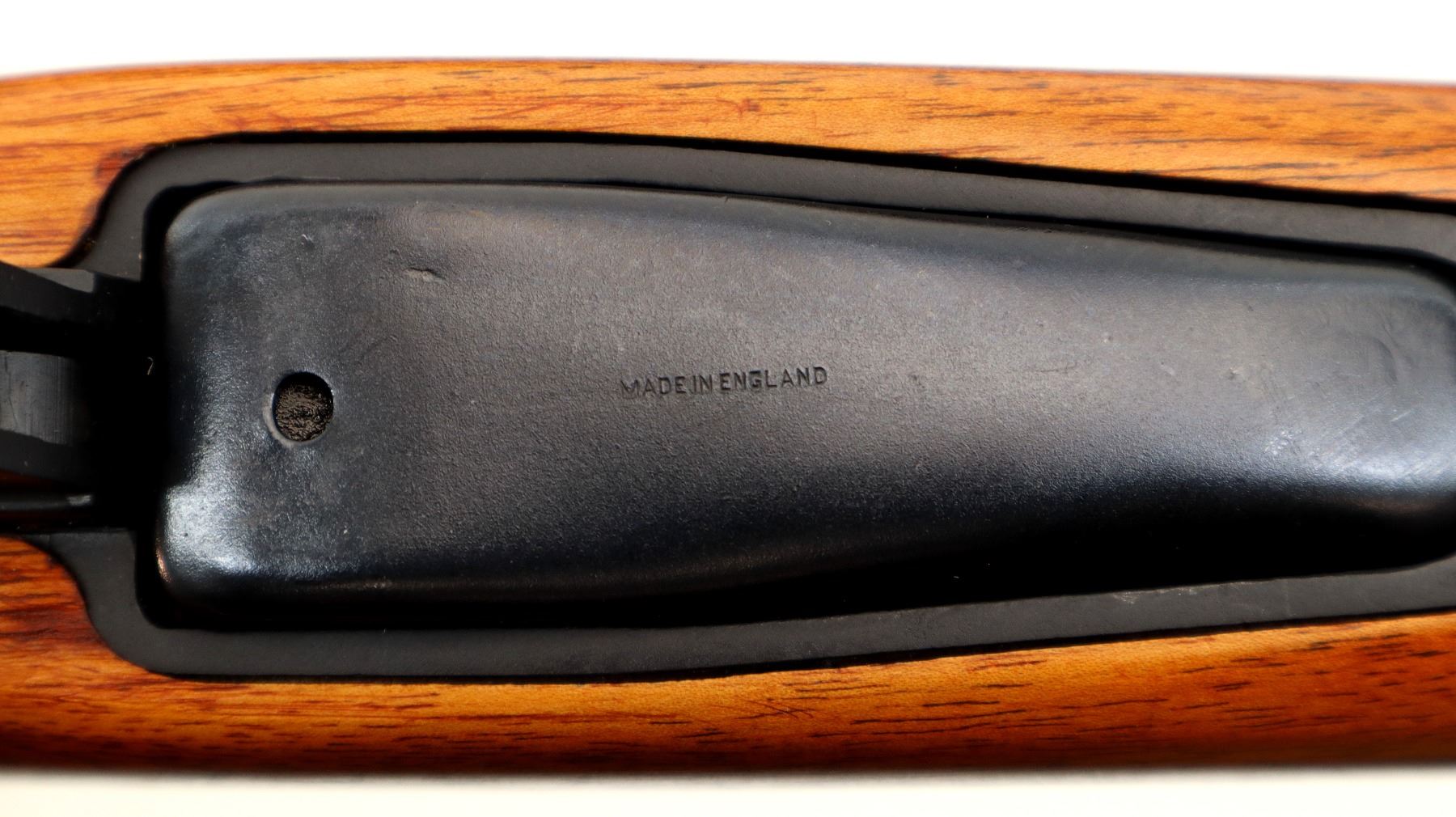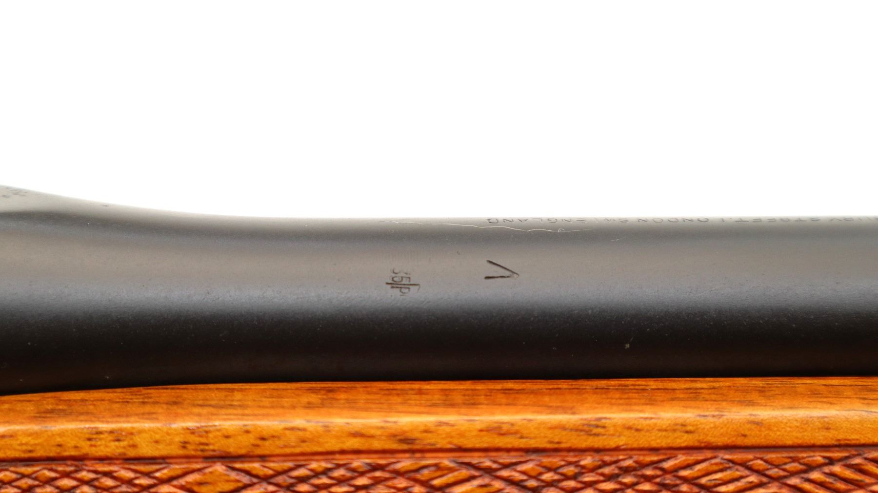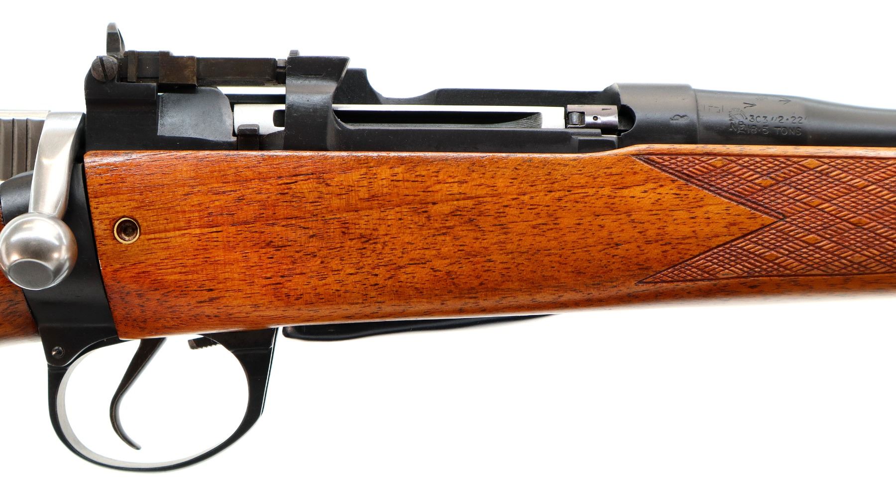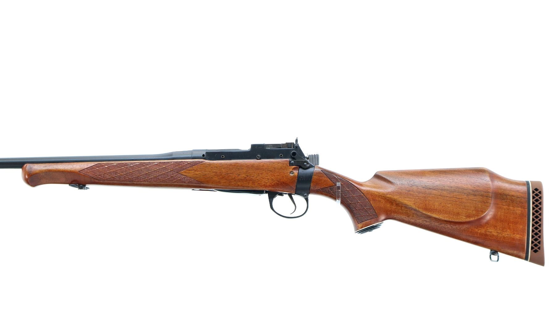 Main Description: Manufactured by Maltby 1943, bolt unnumbered. Blade front sight with ramp, adjustable milled rear peep sight, Satin blued metal finish, receiver drilled and tapped with plug screws installed, bolt polished silver. Two piece Monte Carlo sporter stocks, Schnabel forend tip, checkered forearm and pistol grip, cheek rest, brown vented rubber recoil pad, grip cap, sling swivels.