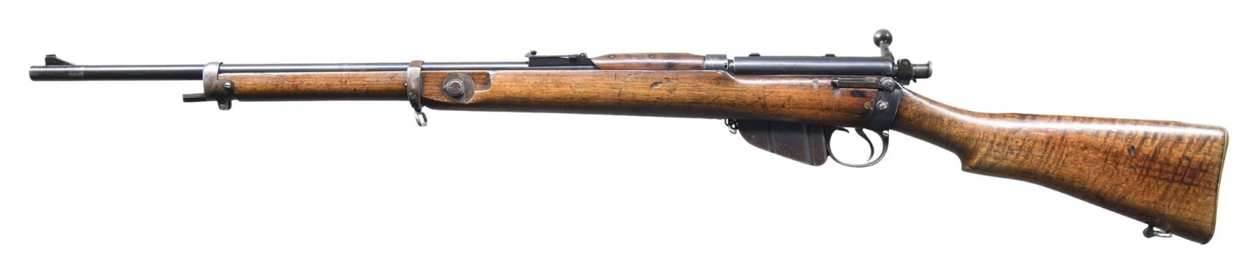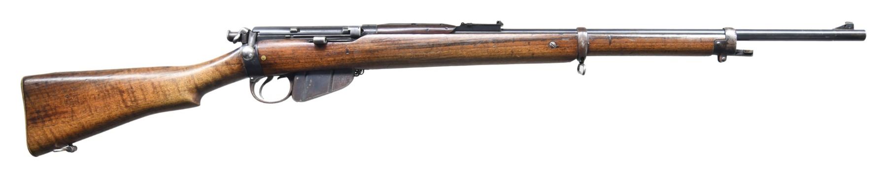 Cal. 303 Brit. S# 8983. Bbl. 27" shortened. Ramped blade front sight. Ladder rear sight graduated to 1700yds. Front volley sight broken off & missing but rear volley sight is present. Bolt handle is scrubbed with no discernable number. Rifle appears to be a MKII Metford that was modified into a "Club Pattern" or period competition modified rifle. Left side of receiver has "N (Broad Arrow) Z" New Zealand marking. Receiver top has sold out of service marking. Right side of socket has Enfield & "II" markings with 1892 date. Left side of socket marked "99". Bbl. top marked "E". Dust cover & mag cutoff both present. Blued finish. Walnut stock set with bottom mounted sling swivels. Right side of butt has faint Enfield roundel. Tang of brass buttplate marked "N (Broad Arrow) Z/470/C14". Ramrod missing. Vacant hole on underside of stock ahead of mag. MAGS: 1-10 rd. with chain. CONDITION: stock set has older added finish with a couple handguard cracks, a small crack behind front band, scattered dings, handling marks & scratches. Metal retains 50% arsenal blue with scattered fading to gray, oxidation & edge wear. Action functions properly when hand cycled. Worn bore with scattered oxidation & frosting that may clean up better. (01-27375/MJC). ANTIQUE. $700-1000.