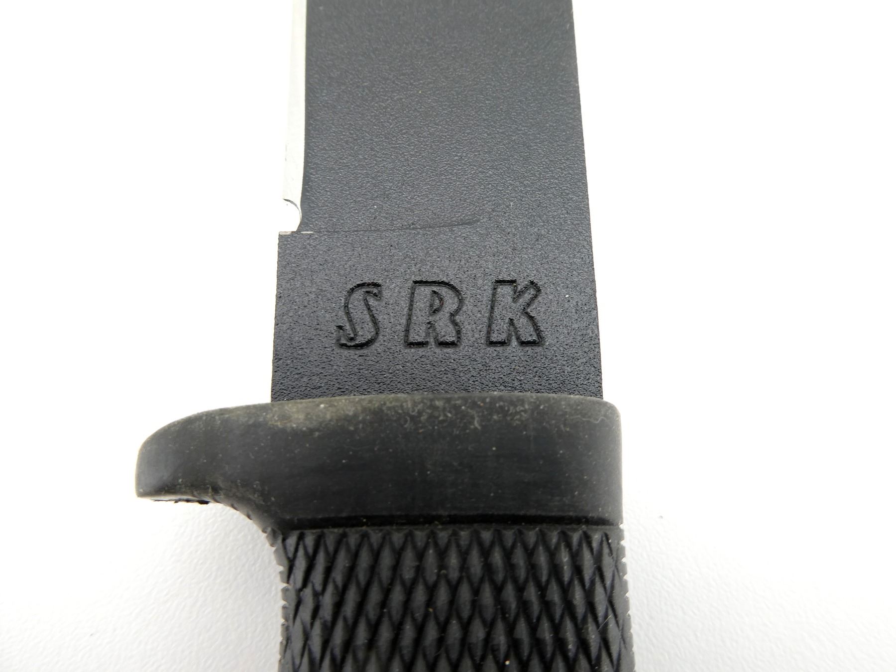 (1) STEEL BLADE, MARKED "SRK", ETC., RUBBER HANDLE, UNMARKED, SHOWS LIGHT WEAR & TEAR / USE MARKS, BLADE OVERALL LENGTH APPROX. 6", OVERALL LENGTH APPROX. 10.75", WITH POLYMER SHEATH. SEE PHOTOS.