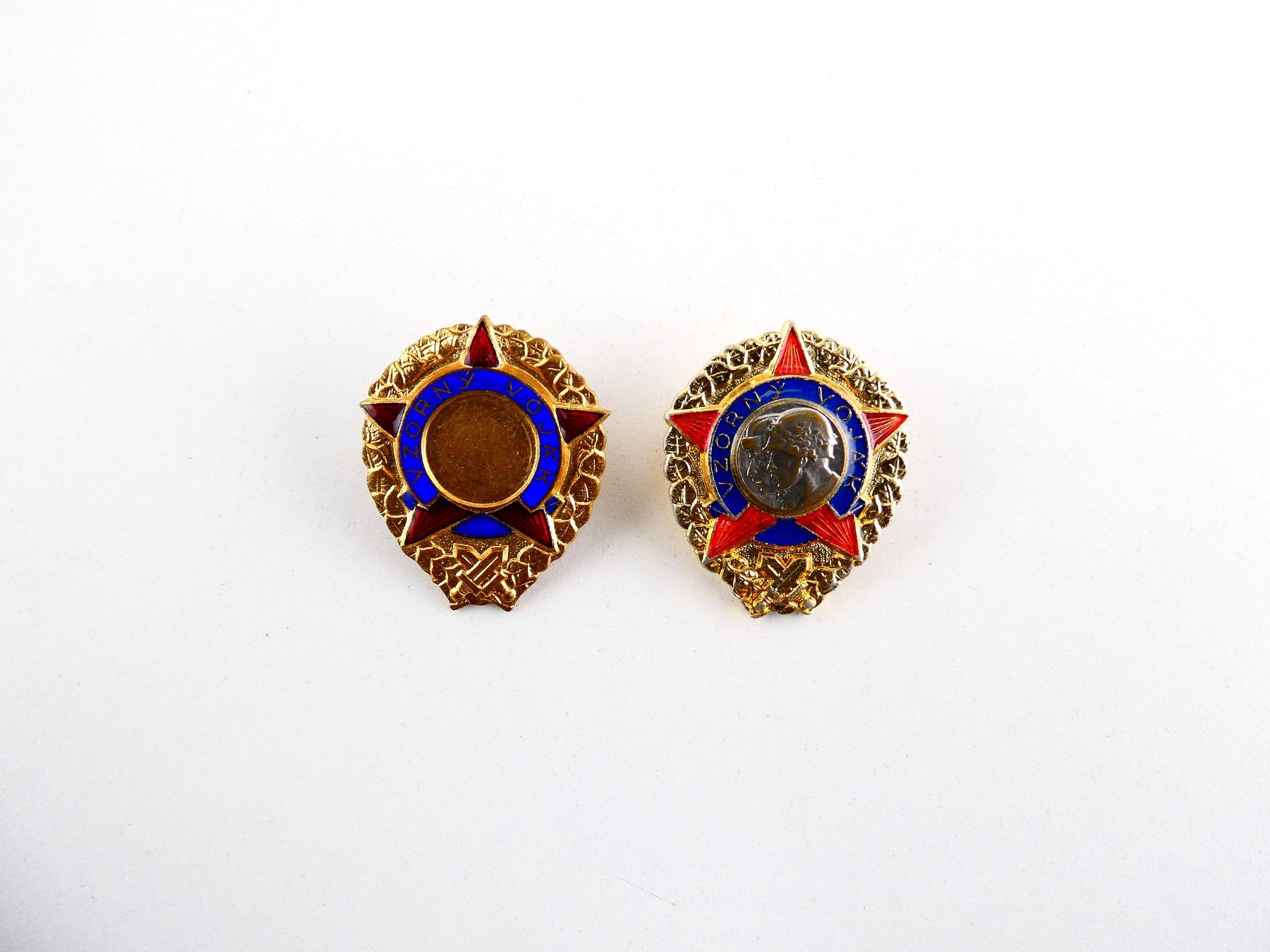 LOT INCLUDES; (2) EXCELLENT SOLDIER BADGES MARKED: "VZORNY VOJAK", ONE MISSING CENTER MEDALLION, WITH SCREW BACKINGS. SEE PHOTOS.