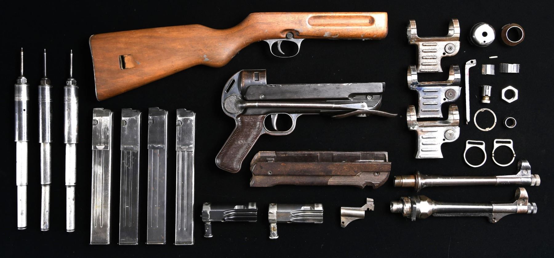 A very desirable collection of German MP40 & MP41 parts including the following: 1) MP40 Bakelite lower assembly w/ folding stock & trigger group. End cap marked "MP 40 bnz 43", w/ serial number 5766M. 2) Bakelite lower stripped. 3) MP40 barrel, complete w/ fiber resting bar, thread protector, front sight assembly, barrel nut & sling swivel. Barrel numbered "5702". Several German manufacturers marks # numbers Bright bore w/ strong rifling. 4) MP41 barrel, complete w. thread protector, front sight assembly. Barrel number "9971". Marked "COS" on front sight. there are some scattered German manufacturers marks. Bright bore w/ strong rifling. 5) 3 MP40 / MP41 magazine wells. All have ribbed outer surfaces. 2 appear to have lost most of the original finish, the remaining very this w/ scattered patina. 1 appears to have been blued w/ more coverage than the others, though still exhibiting a lot of thinning & scattered patina. 1 has German Eagle w/ factory code WaA254 while the others appear unmarked. 6) German MP41 wooden stock w/ steel butt plate, trigger guard & trigger. 7) MP40 late barrel nut w/ 2 flat surfaces. 8) MP41 Receiver end cap. 9) 3 MP40/41 firing pin / recoil rod mechanisms. 10) 2 MP40/41 Bolts, complete w/ extractor & charging handles. 11) 4 blued 32 rd. magazines. 1 marked "M.P. 41" & "Haenel". The other 3 marked "MP38 u 40". 2 dated "42" & "gqm" while the last is marked "43" & "ayf". CONDITION: All parts appear removed from previously functioning guns and demonstrate used condition in various forms. (02-24014/JZ). $1,500-2,500.