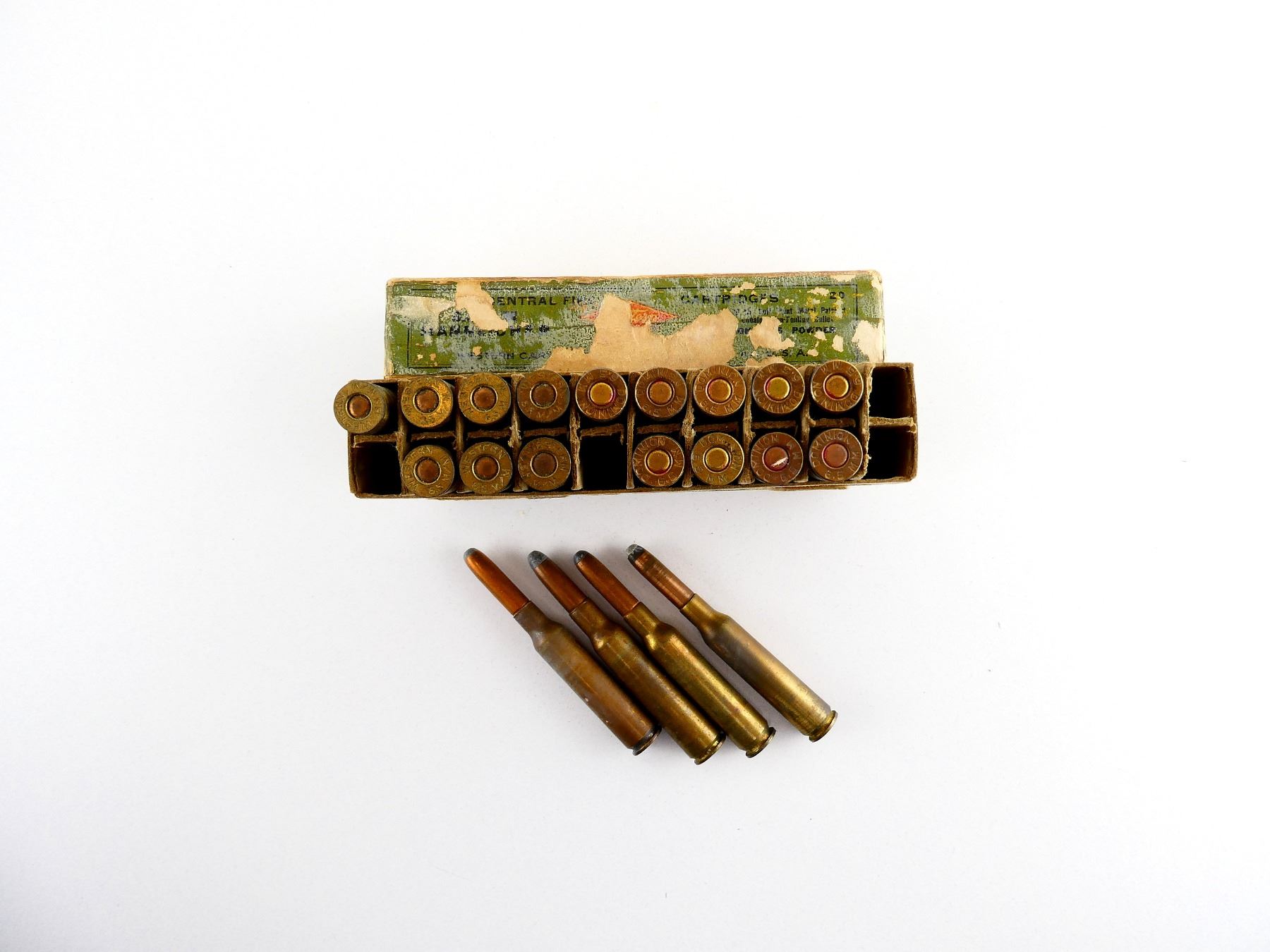 LOT INCLUDES; APPROX. (20) RNDS, VARIOUS MANUFACTURERS INCLUDING; DOMINION, WESTERN, ETC., IN COLLECTIBLE BOX, SHOWS SOME WEAR, SEE PHOTOS.