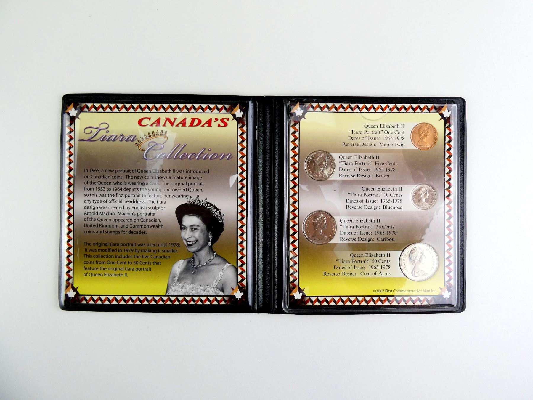 LOT INCLUDES; (1) QUEEN ELIZABETH II "TIARA PORTRAIT" PENNY, DATED 1978, (1) QUEEN ELIZABETH II "TIARA PORTRAIT" NICKEL, DATED 1965, (1) QUEEN ELIZABETH II "TIARA PORTRAIT" DIME, DATED 1974, (1) QUEEN ELIZABETH II "TIARA PORTRAIT" QUARTER, DATED 1974 & (1) QUEEN ELIZABETH II "TIARA PORTRAIT" HALF DOLLAR COIN, DATED 1968, ALL IN PROTECTIVE CASE WITH VARIOUS INFORMATION ABOUT COINS / SET. SEE PHOTOS.