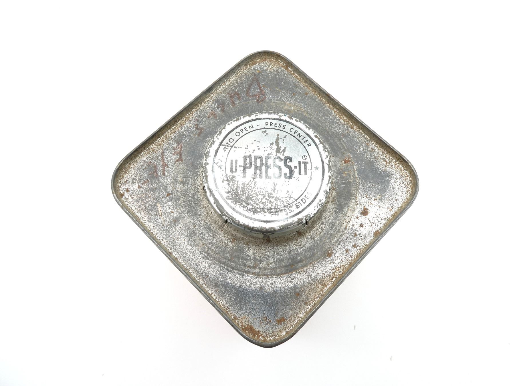 (1) EMPTY ORANGE PAINTED POWDER TIN, FRONT LABEL MARKED: "HERCULES, SMOKELESS BULLSEYE PISTOL POWDER", VARIOUS OTHER MARKINGS, APPROX. 3 5/8" X 3 5/8" X 4". SEE PHOTOS.