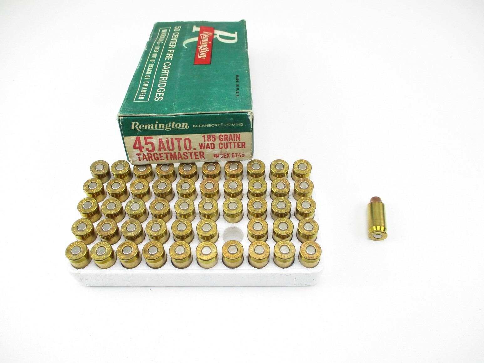 COLLECTIBLE REMINGTON .45 AUTO AMMO. 50 RNDS, 185 GRNS (STATED ON BOX, NOT CONFIRMED), WAD CUTTER TARGET MASTER, IN COLLECTIBLE AMMO BOX. THERE ARE NEW SHIPPING RESTRICTIONS, PLEASE MAKE SURE YOU HAVE READ AND CONFIRMED WE CAN SHIP TO YOU BEFORE BIDDING ON THIS LOT. PLEASE SEE LOT 0 IN THIS SESSION. NO REFUNDS WILL BE ISSUED, OR BIDS RETRACTED