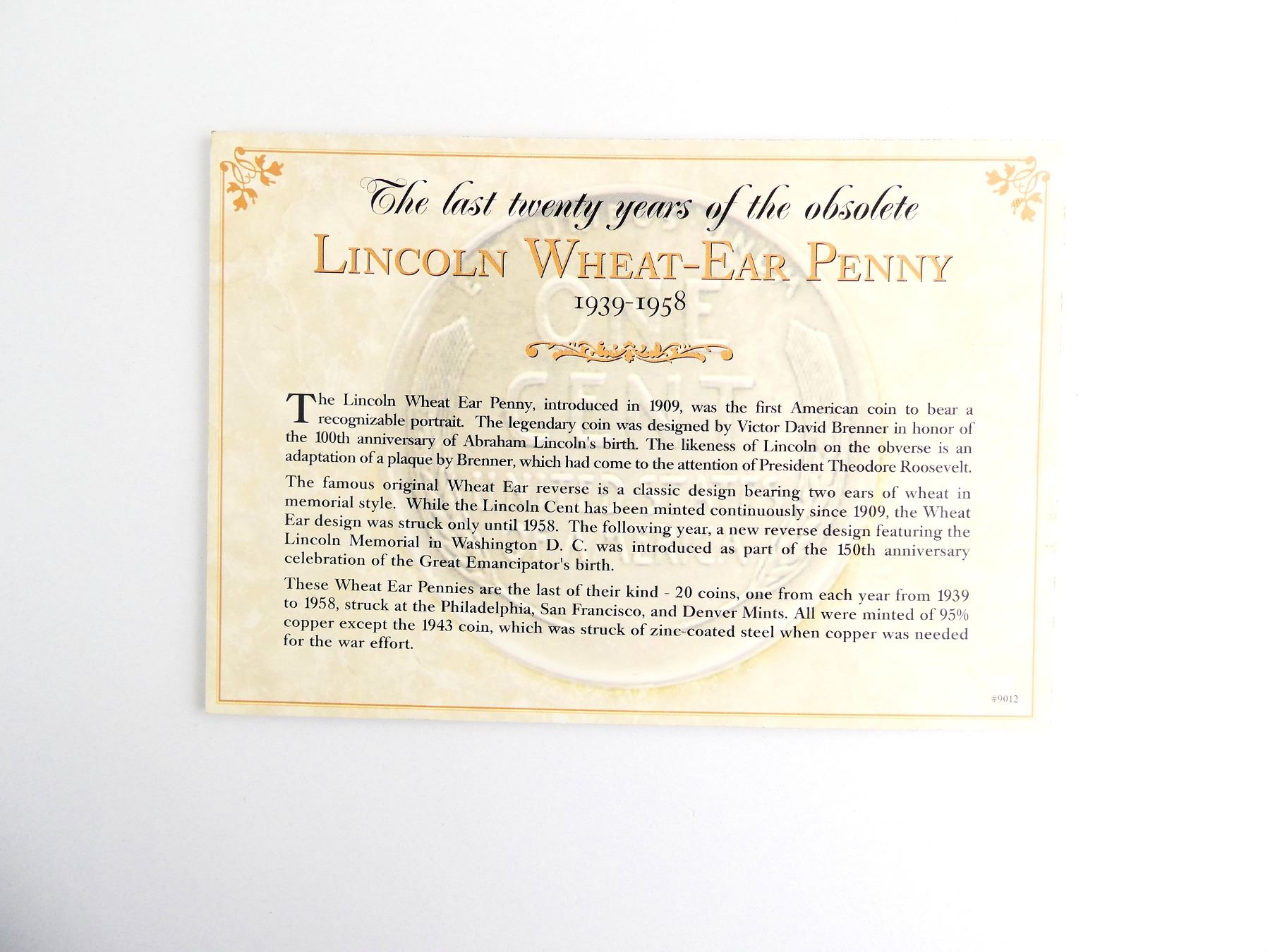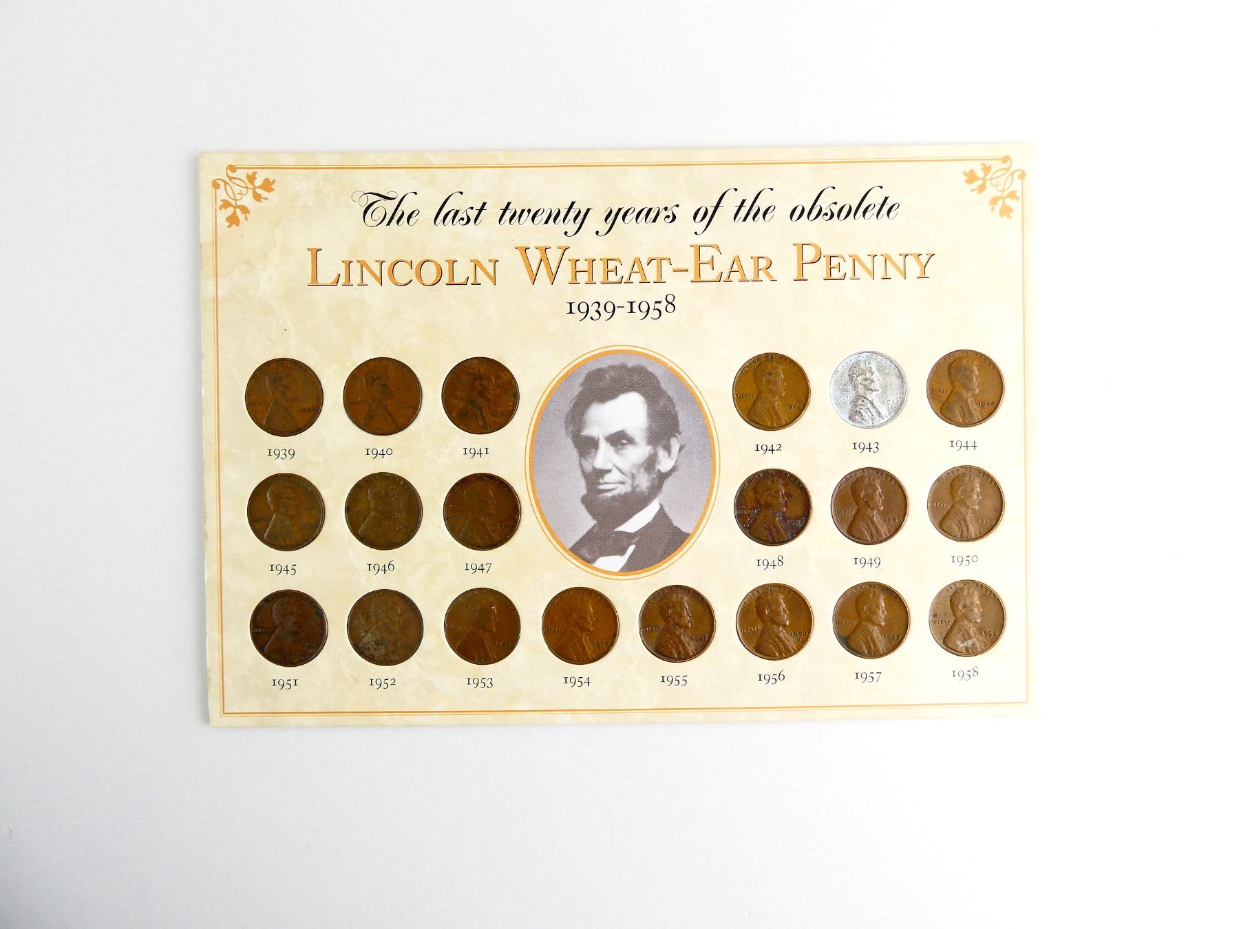LOT INCLUDES; APPROX. (20) LINCOLN WHEAT-EAR PENNIES, DATED 1939 TO 1958, SET IN CARDBOARD WITH VARIOUS INFORMATION ABOUT THE SET. SEE PHOTOS.