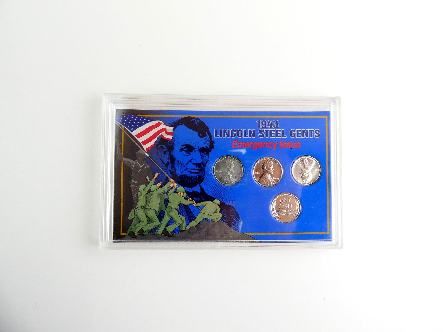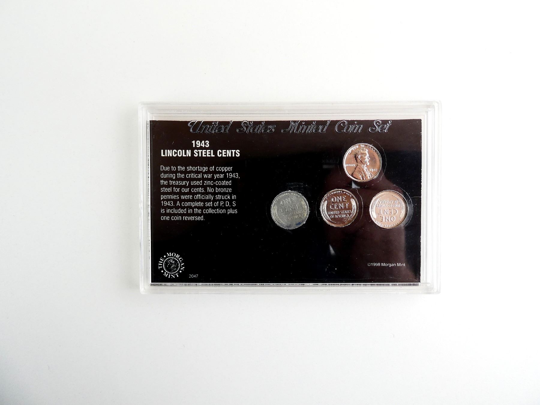 LOT INCLUDES; (4) 1943 LINCOLN STEEL CENTS, EMERGENCY ISSUE, DUE TO COPPER SHORTAGES IN 1943 THE TREASURY USED ZINC-COATED STEEL, NO BRONZE PENNIES WERE OFFICIALLY STRUCK, A COMPLETE P, D & S MINTED COIN COLLECTION, WITH INFORMATION ON CARBOARD THE COINS ARE SET IN. SEE PHOTOS.