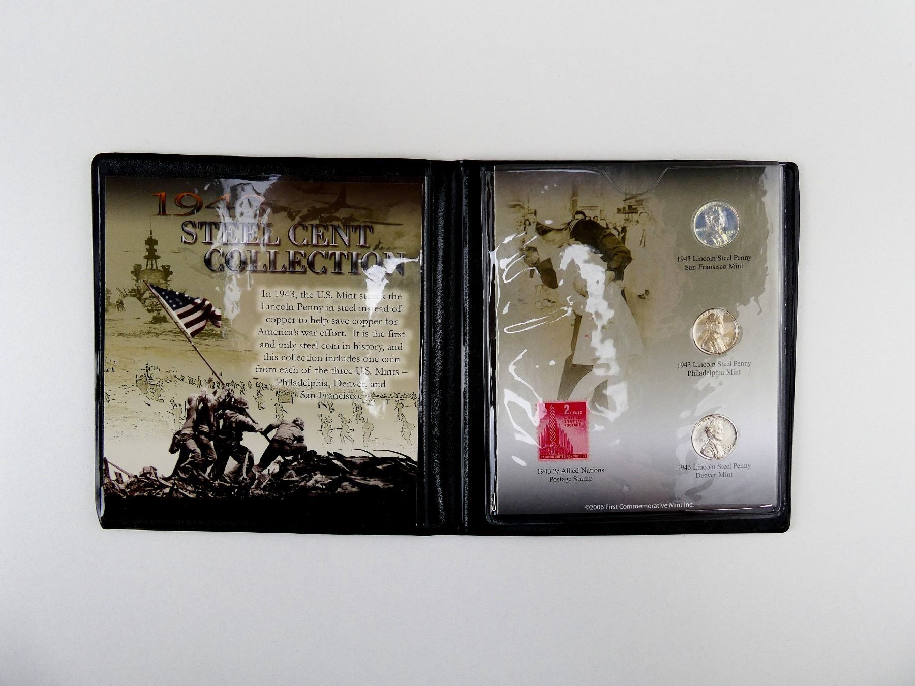 LOT INCLUDES; (3) 1943 DATED STEEL PENNIES, ONE SAN FRANCISCO MINT, ONE PHILADELPHIA MINT, ONE DENVER MINT & (1) 1943 2 CENT ALLIED NATIONS STAMP, ALL IN PROTECTIVE CASE, SET IN CARDBOARD WITH VARIOUS INFORMATION ABOUT COINS / SET & WITH CERTIFICATE OF AUTHENTICITY. SEE PHOTOS.