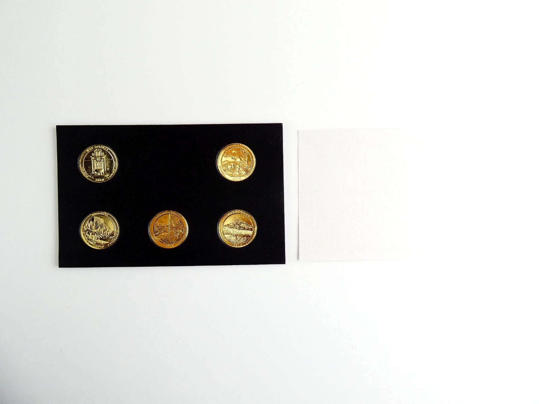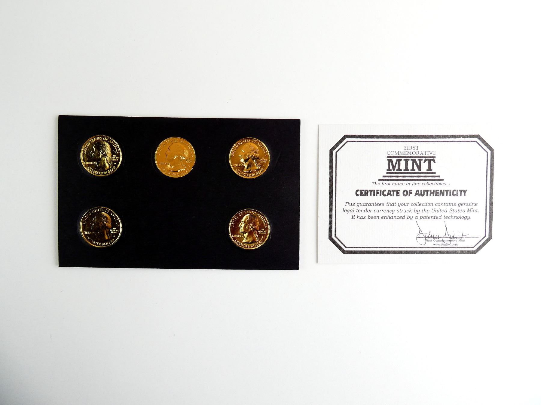 LOT INCLUDES; (1) ARKANSAS HOT SPRINGS QUARTER, DATED 2010, 24 KARAT GOLD PLATED, (1) WYOMING YELLOWSTONE QUARTER, DATED 2010, 24 KARAT GOLD PLATED, (1) CALIFORNIA YOSEMITE, DATED 2010, 24 KARAT GOLD PLATED, (1) ARIZONA GRAND CANYON, DATED 2010, 24 KARAT GOLD PLATED & (1) OREGON MOUNT HOOD, DATED 2010, 24 KARAT GOLD PLATED, WITH CERTIFICATE OF AUTHENTICITY. SEE PHOTOS.