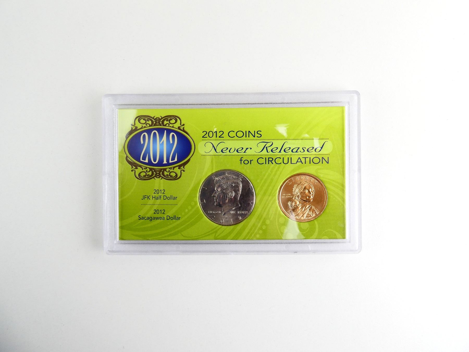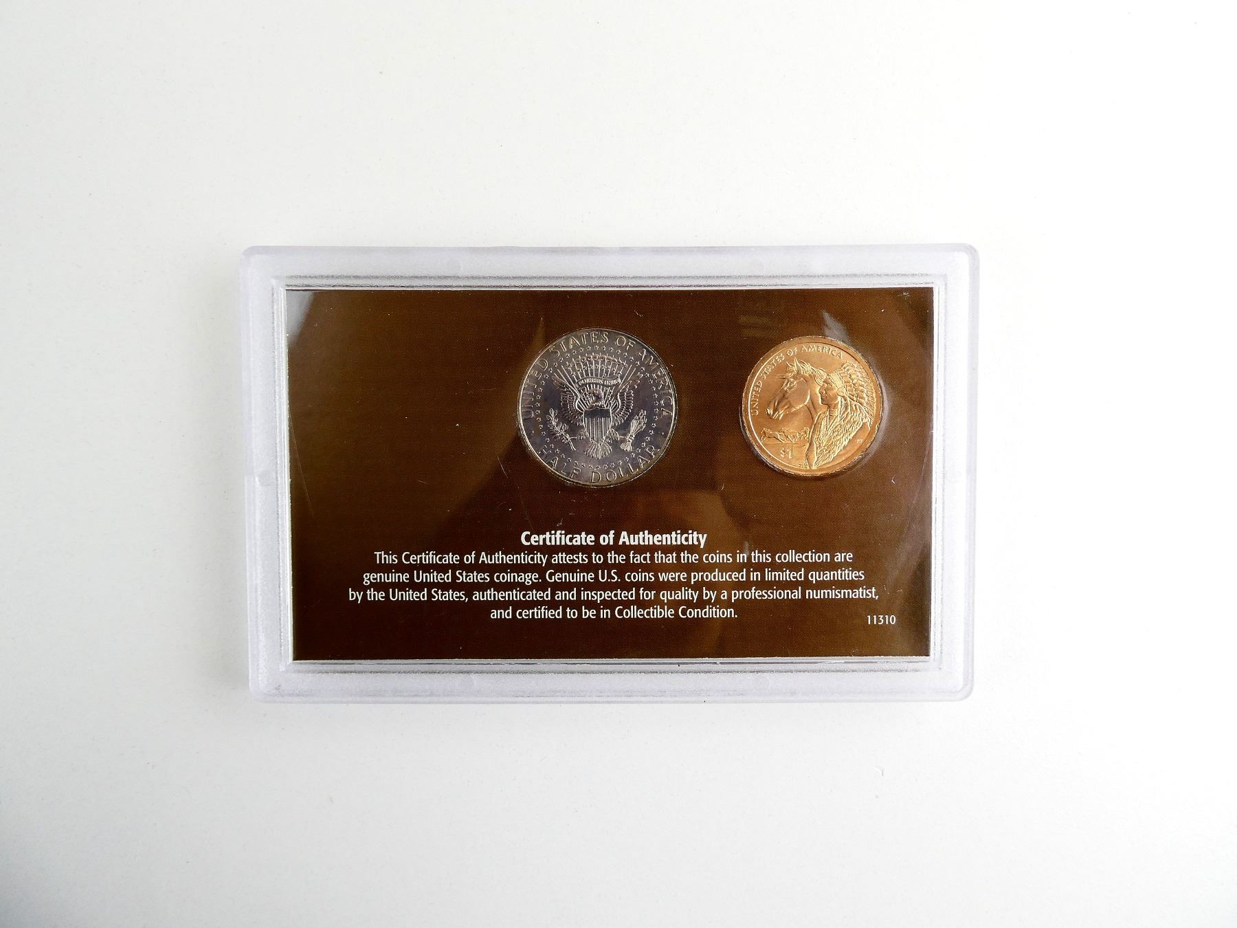LOT INCLUDES; (1) 2012 JFK HALF DOLLAR & (1) 2012 SACAGAWEA DOLLAR, BOTH IN PROTECTIVE CASE WITH CERTIFICATE OF AUTHENTICITY. SEE PHOTOS.