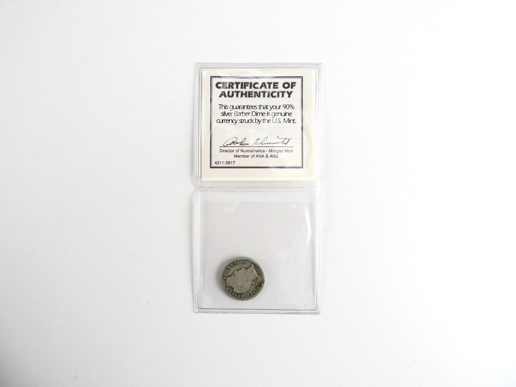 (1) BARBER SILVER DIME, DATED 1907, WITH CERTIFICATE OF AUTHENTICITY. SEE PHOTOS.