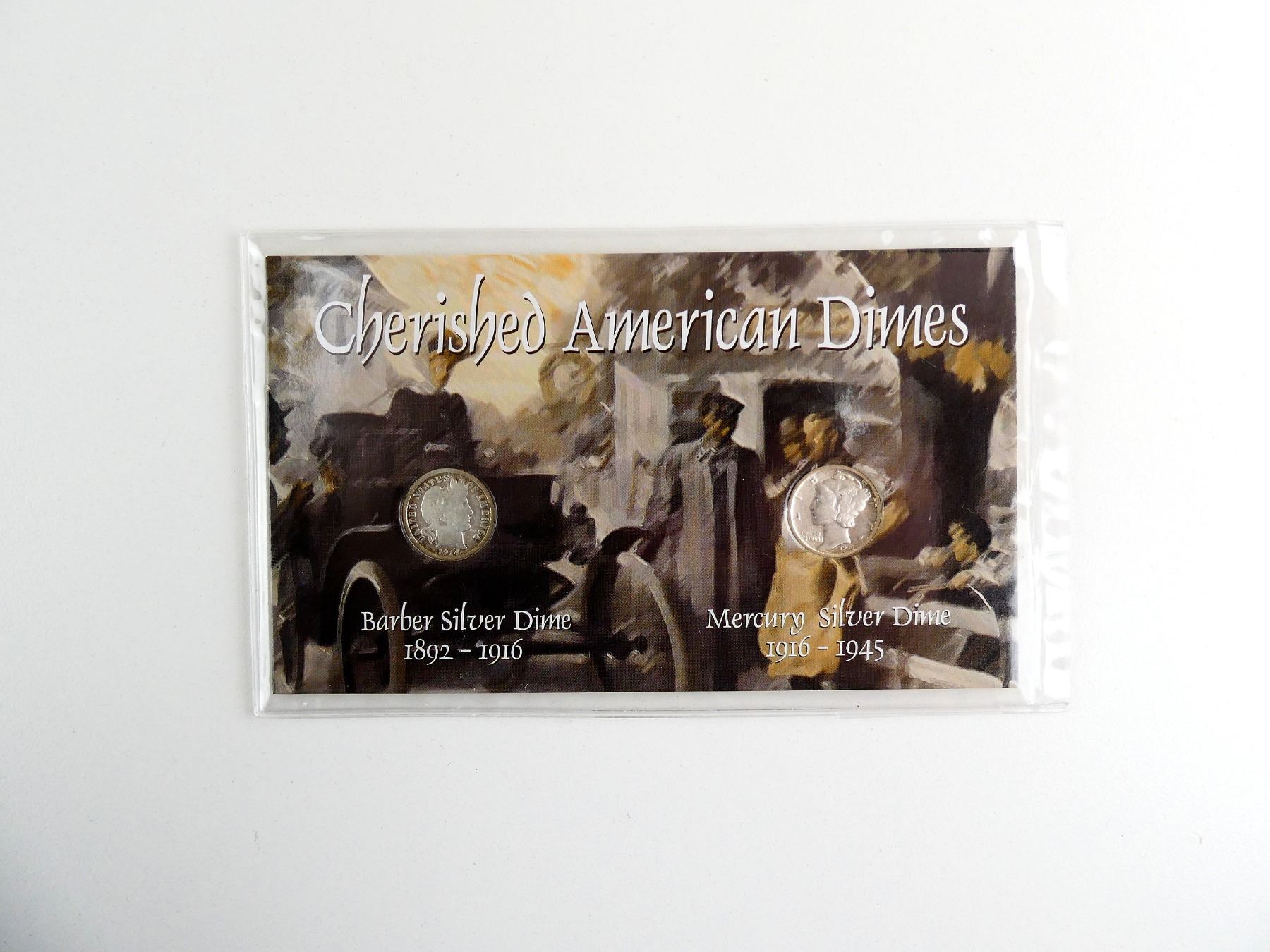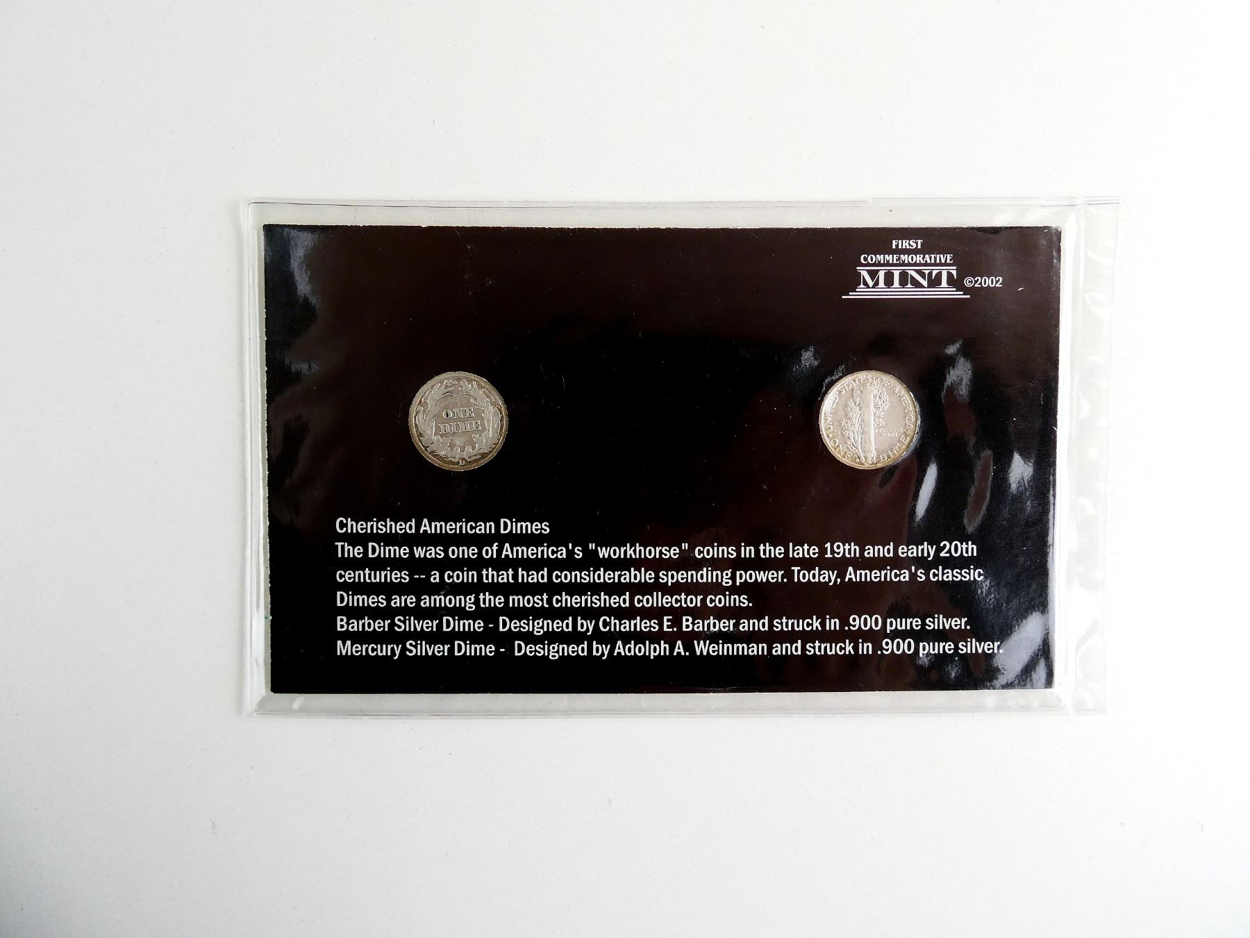 LOT INCLUDES; (1) BARBER SILVER DIME DATED 1914, .900 PURE SILVER & (1) MERCURY SILVER DIME DATED 1935, .900 PURE SILVER, BOTH SET IN CARDBOARD WITH VARIOUS INFORMATION ABOUT THE COINS. SEE PHOTOS.
