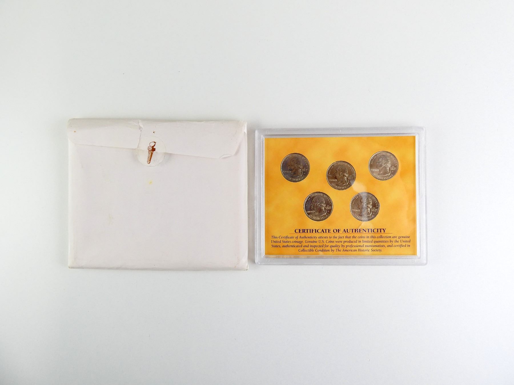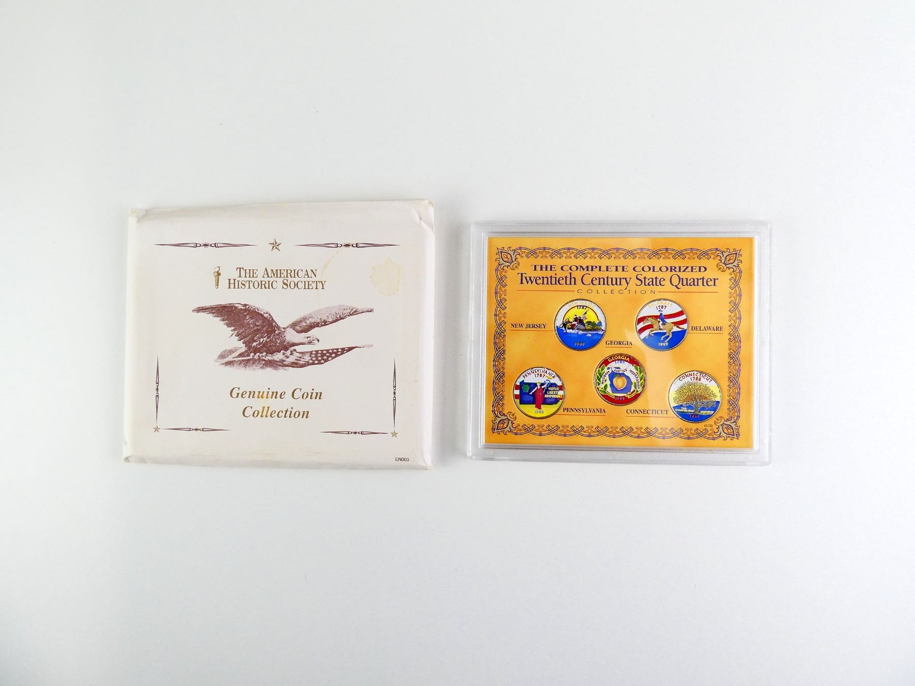LOT INCLUDES; (1) NEW JERSEY STATE QUARTER, IN FULL COLOUR, DATED 1787-1999, (1) DELAWARE STATE QUARTER, IN FULL COLOUR, DATED 1787-1999, (1) PENNSYLVANIA STATE QUARTER, IN FULL COLOUR, DATED 1787-1999, (1) GEORGIA STATE QUARTER, IN FULL COLOUR, DATED 1788-1999 & (1) CONNECTICUT STATE QUARTER, IN FULL COLOUR, DATED 1788-1999, ALL IN PROTECTIVE CASE WITH CERTIFICATE OF AUTHENTICITY. SEE PHOTOS.