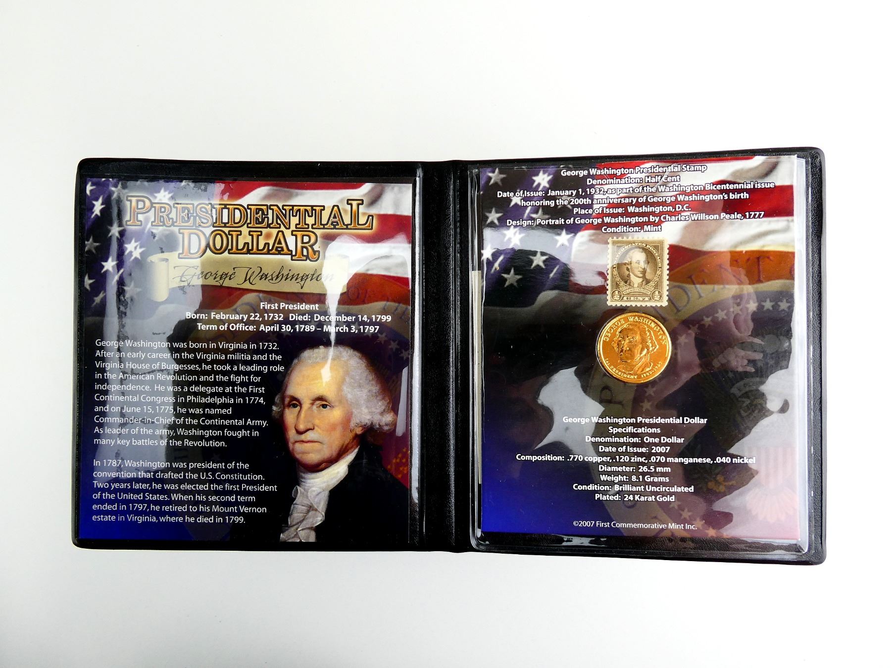 LOT INCLUDES; (1) GEORGE WASHINGTON PRESIDENTIAL STAMP, ISSUED JANUARY 1, 1932, AS PART OF THE WASHINGTON BICENTENNIAL ISSUE HONORING THE 200TH ANNIVERSARY OF GEORGE WASHINGTON'S BIRTH & (1) GEORGE WASHINGTON PRESIDENTIAL DOLLAR, ISSUED 2007, UNCIRCULATED, 24 KARAT GOLD PLATED, APPROX. 26.5MM DIA., ALL PIECES IN PROTECTIVE CASE, WITH INFORMATION ABOUT EACH PIECE & CERTIFICATE OF AUTHENTICITY. SEE PHOTOS.