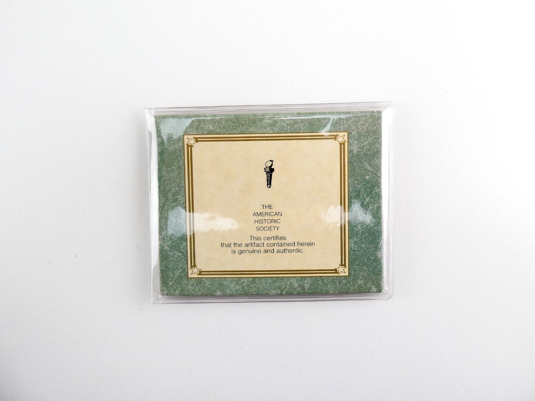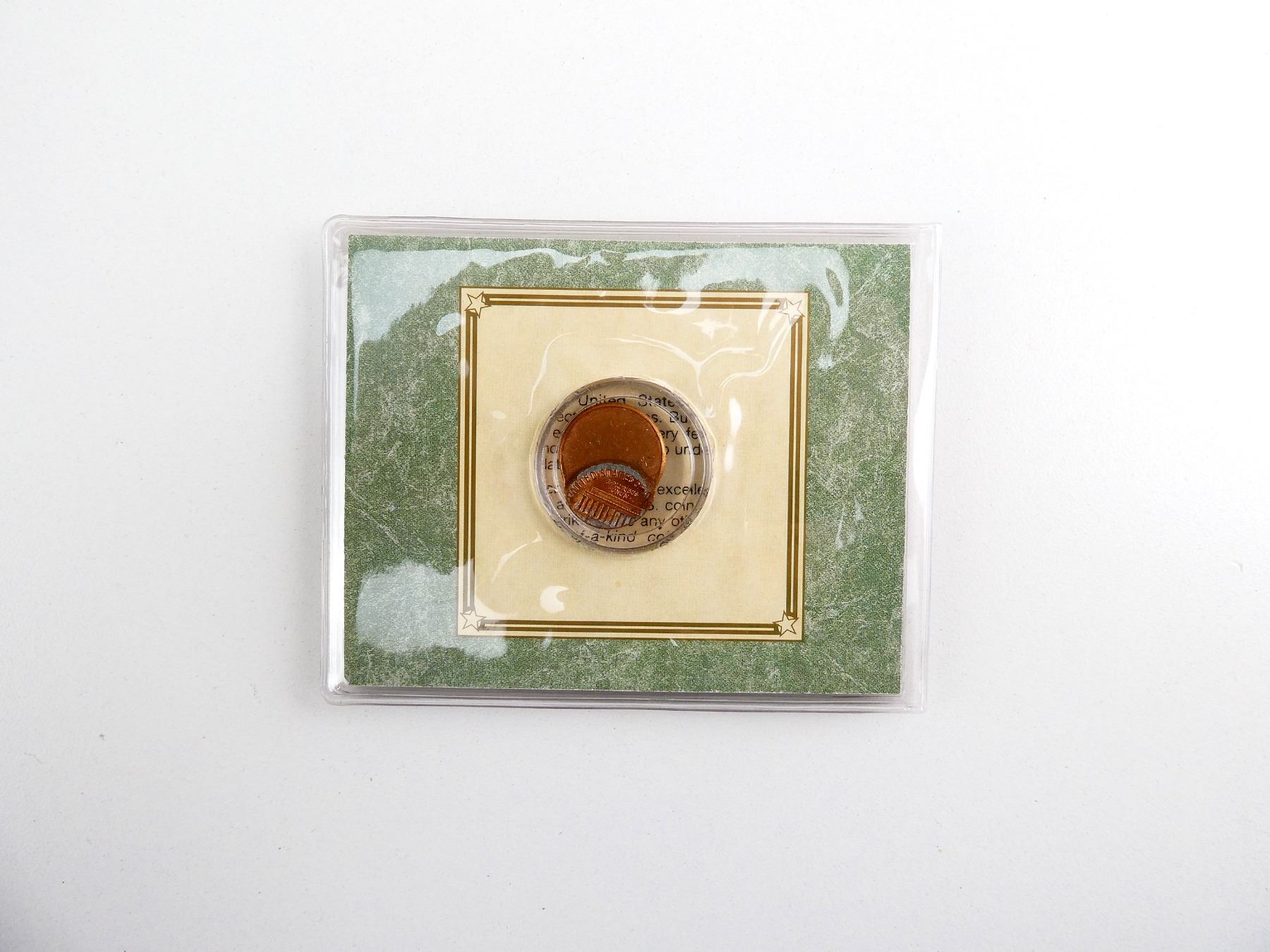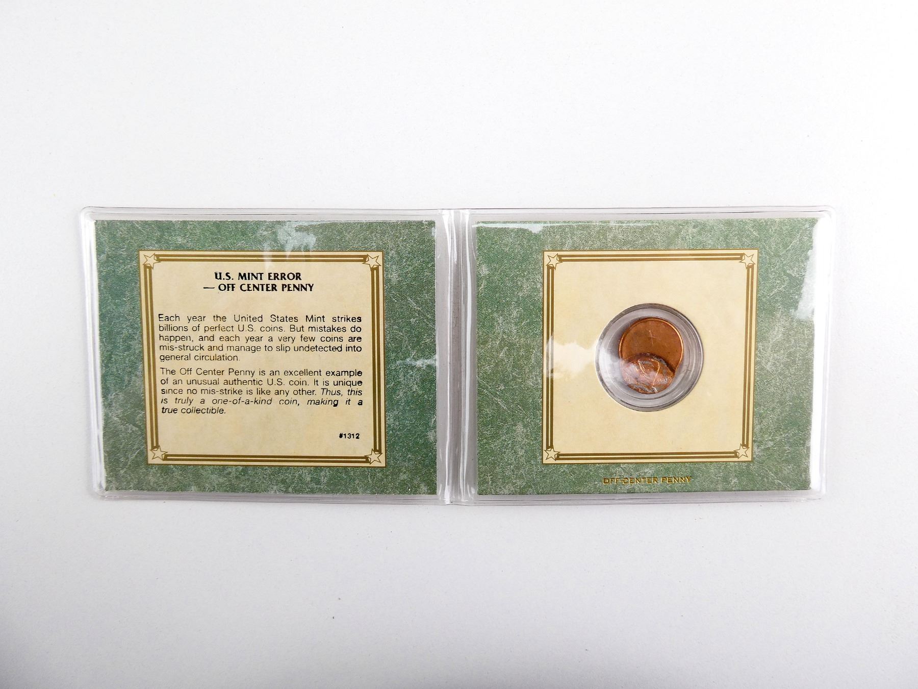 (1) MIS-STUCK OFF CENTER PENNY, IN HOLDER WITH INFORMATION CARD, CARD MARKED: "U.S. MINT ERROR, -OFF CENTER PENNY", ETC. & "THE AMERICAN HISTORIC SOCIETY, THIS CERTIFIES THAT THE ARTIFACT CONTAINED HEREIN IS GENUINE AND AUTHENTIC.". SEE PHOTOS.