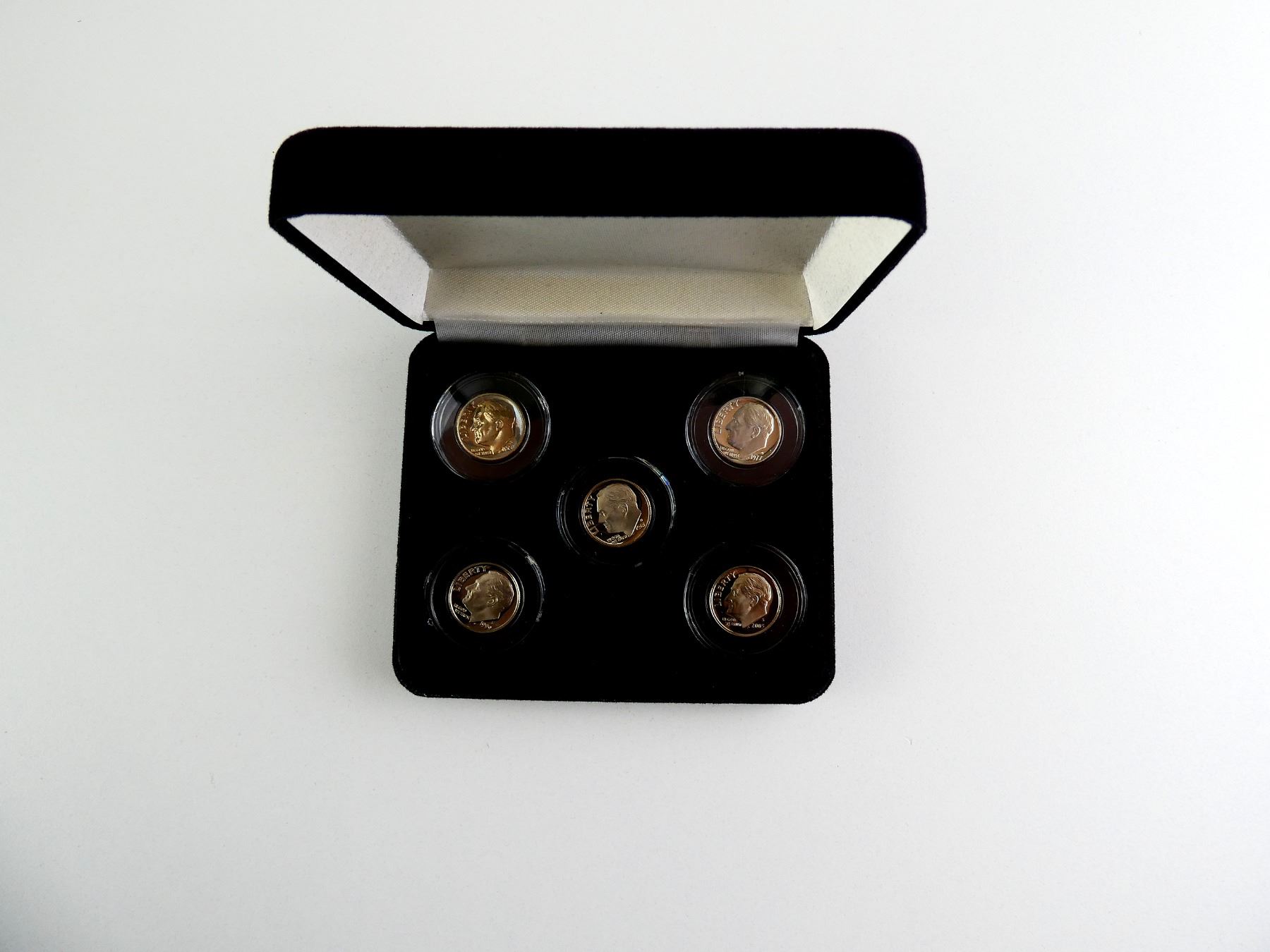 LOT INCLUDES; (5) ROOSEVELT DIMES, DATED 1968, 1977, 1981, 1999 & 2005, ALL MINTED BY SAN FRANCISCO MINT, WITH BLACK VELVET BOX. SEE PHOTOS.