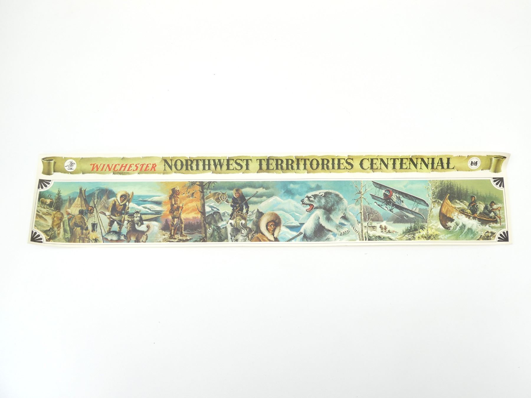 (1) COLOURED BANNER BY WINCHESTER, MARKED: "WINCHESTER NORTHWEST TERRITORIES CENTENNIAL", APPROX. 46.5" X 9.5"