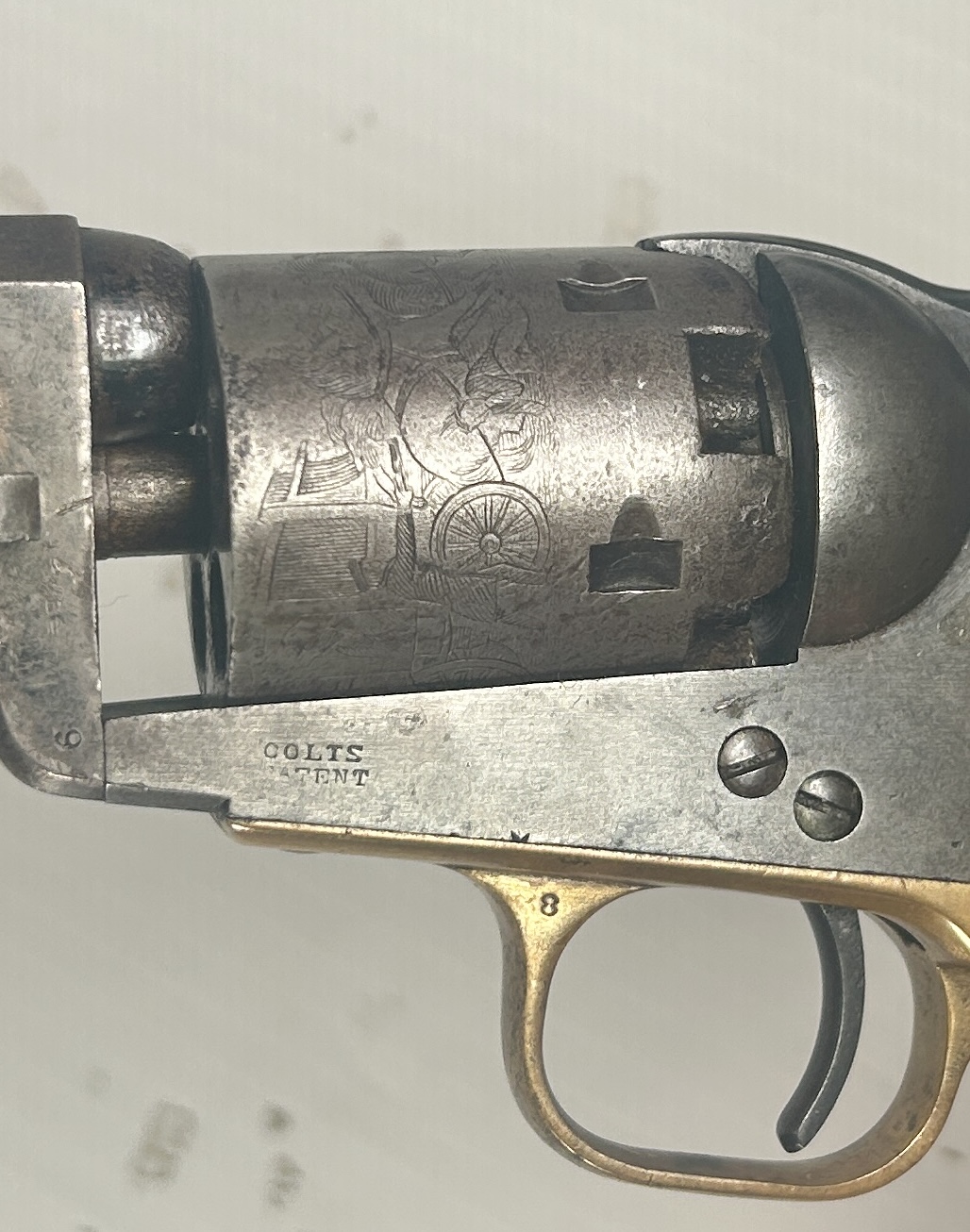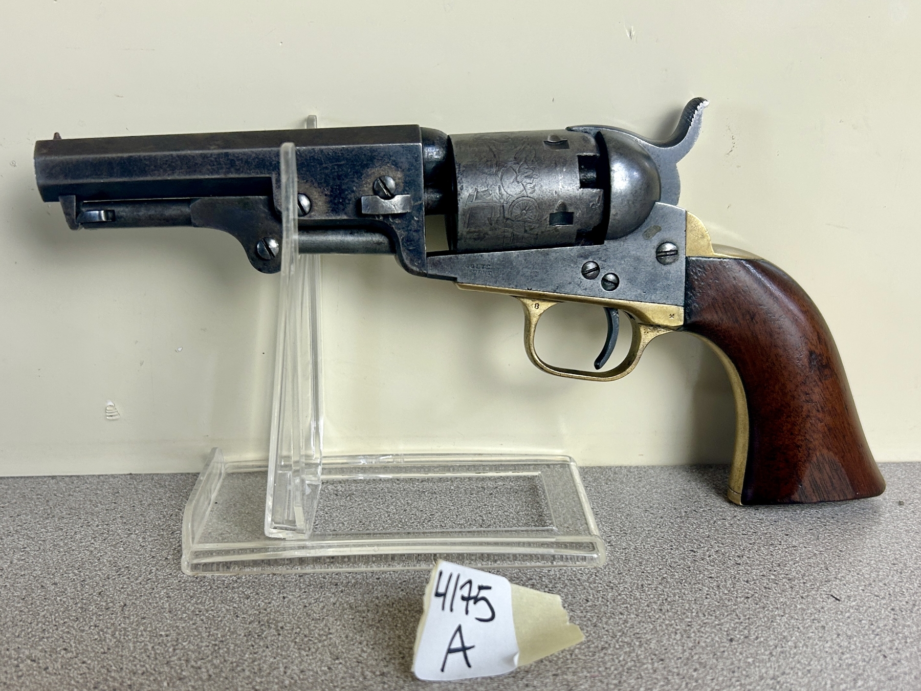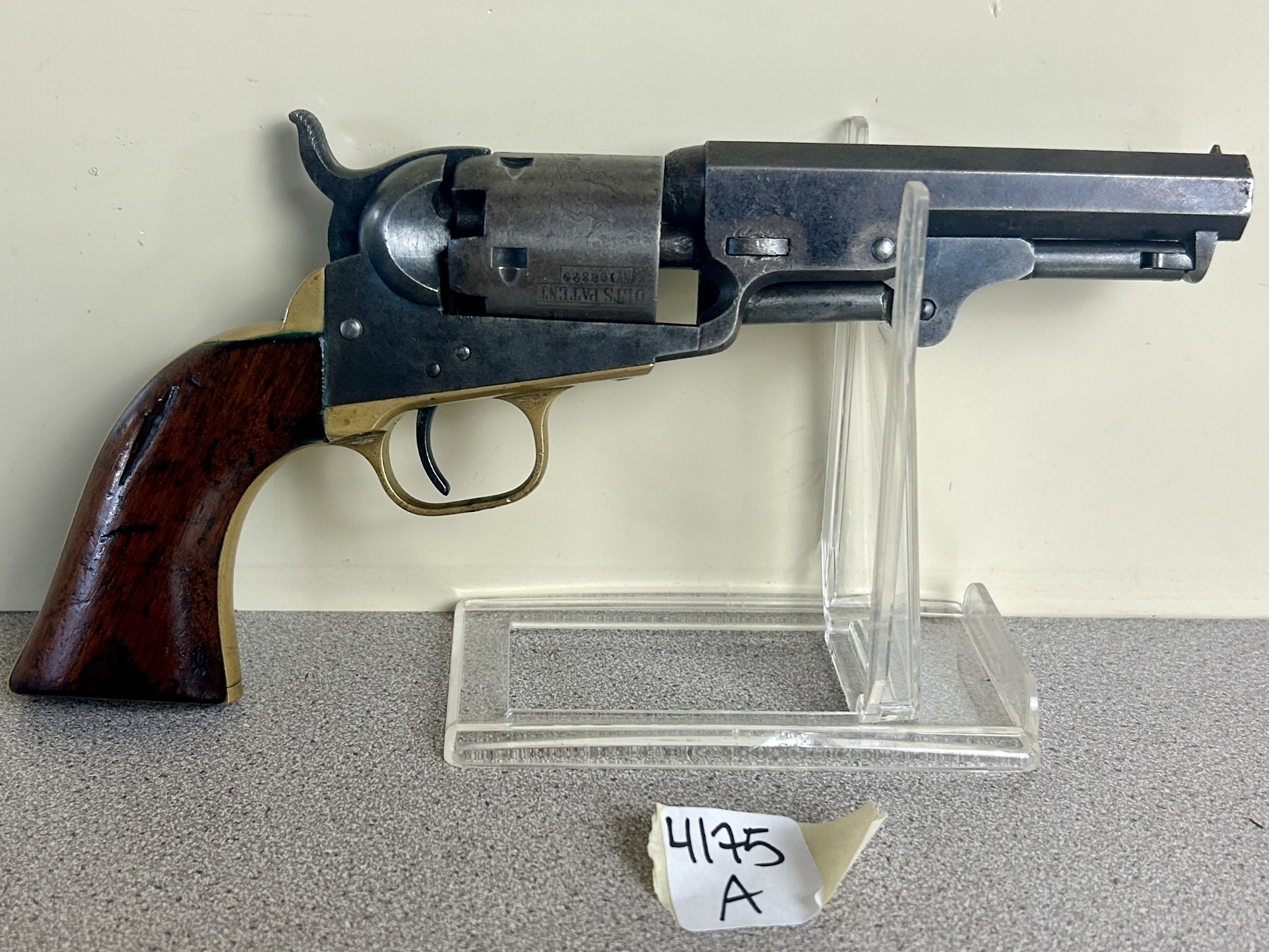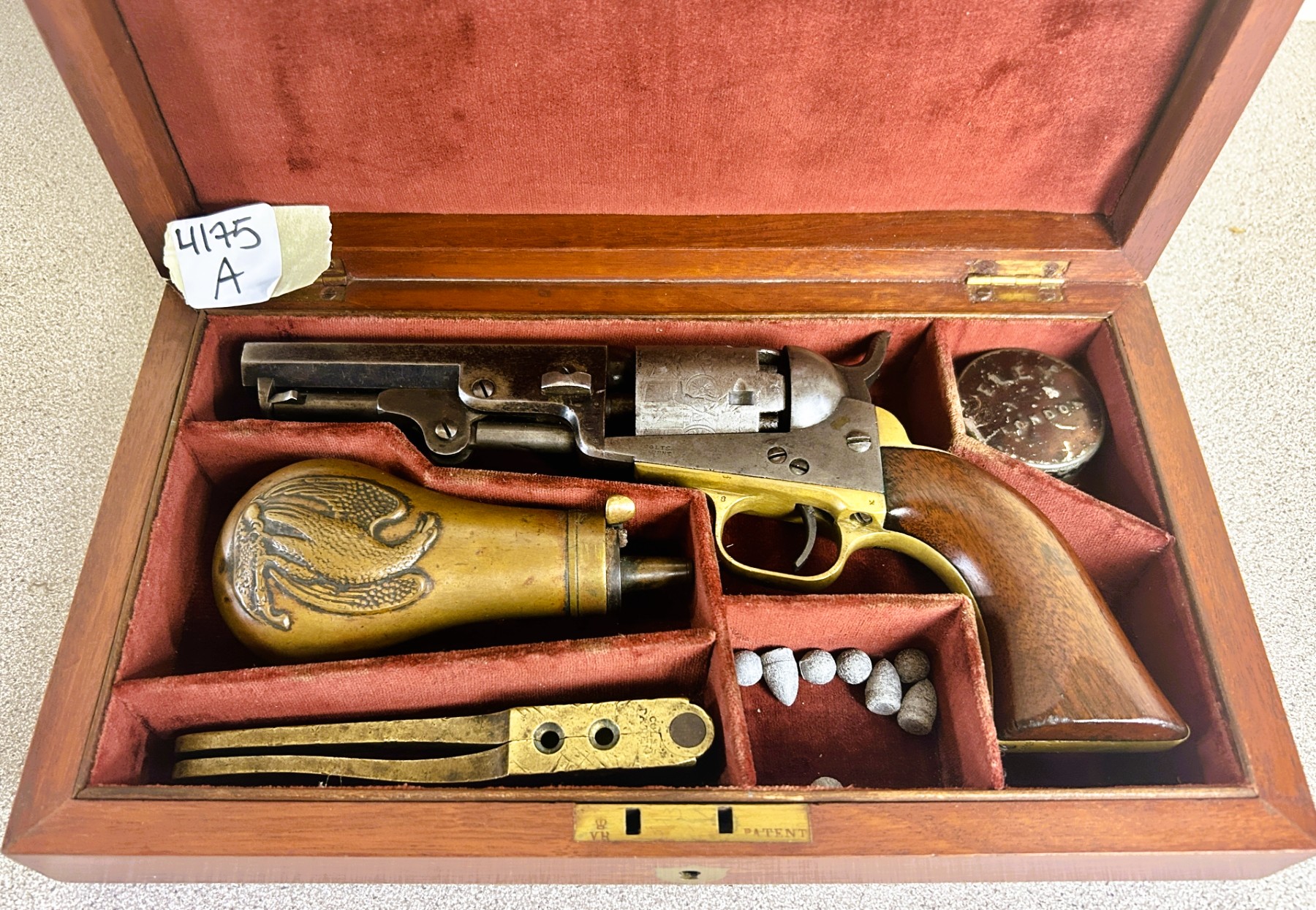 CONDITION: G-VG OVERALL FOR AGE. BORE IS G, CLEAN WITH STRONG RIFLING. INDEXES & LOCKS UP WELL. MINOR CYLINDER SLOP IN HALF COCK. SPECS: 4 IN BARREL. .31 CAL SINGLE ACTION CAP & BALL REVOLVER. CANADIAN ANTIQUE CLASS, NO PAL REQUIRED. CYLINDER ENGRAVED WITH STAGECOACH SCENE. EXTRAS: WOOD CASE (NO KEY), CAPS, BULLETS & BALLS, EMPTY POWDER FLASK & DUAL CAVITY ROUND BALL & CONICAL BULLET MOULD. SERIAL: 108329, ALL MATCHING.