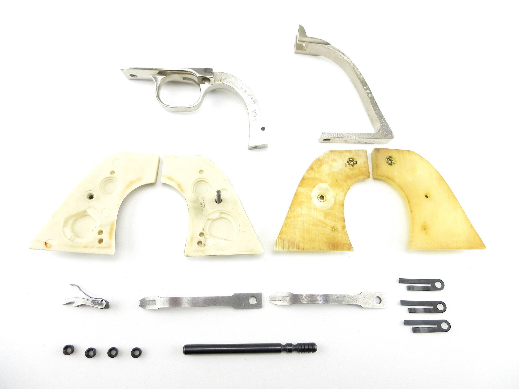 LOT INCLUDES; (1) SET OF COLT SMOOTH GRIPS, NO SCREW, (1) SET OF GROOVED POLYMER GRIPS, WITH SCREW, SEAR / HAND SPRINGS, MAIN SPRINGS, TRIGGER GRAD & BACK STRAP, ETC. MAY REQUIRE FITTING. SEE PHOTOS.