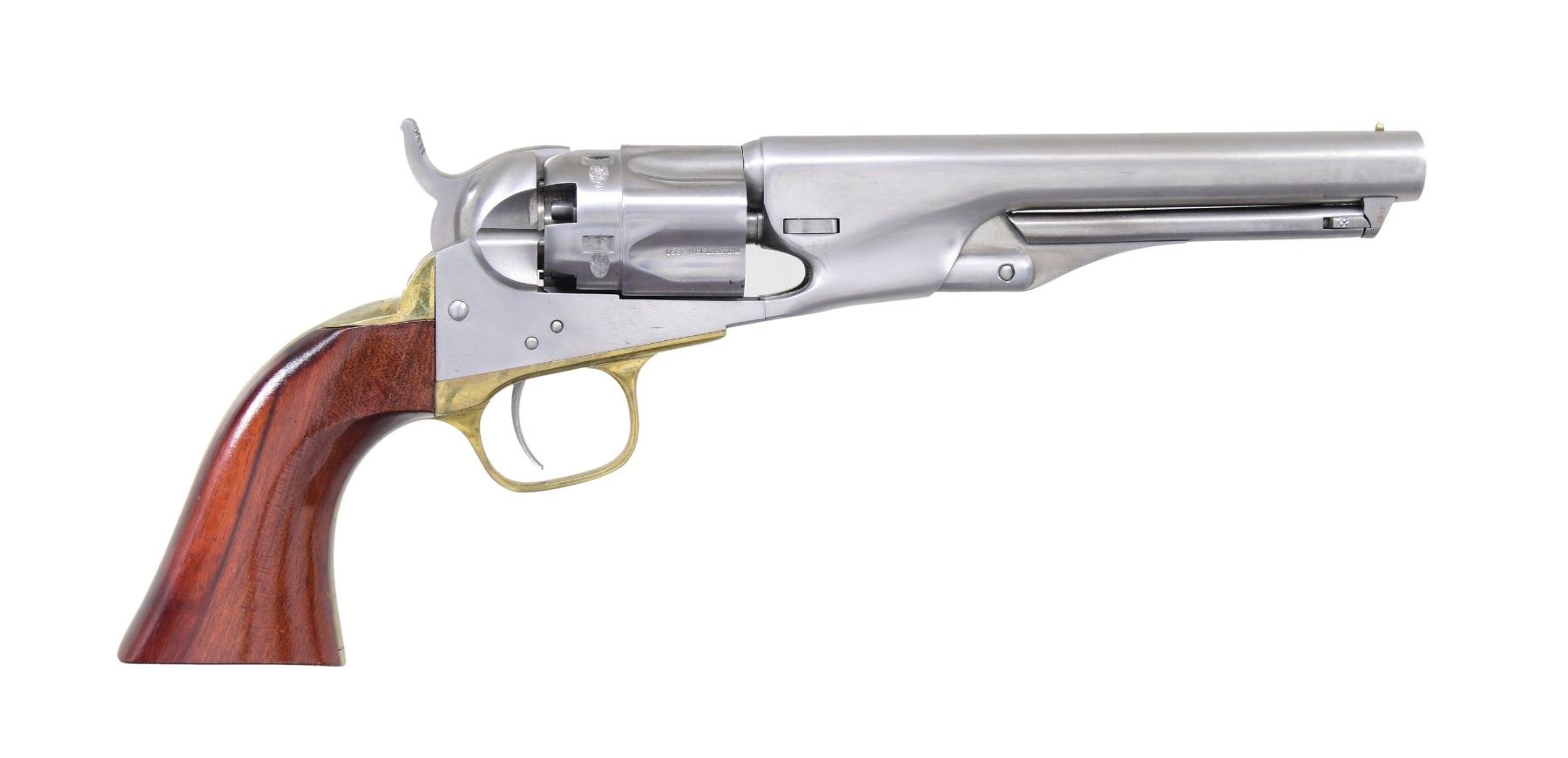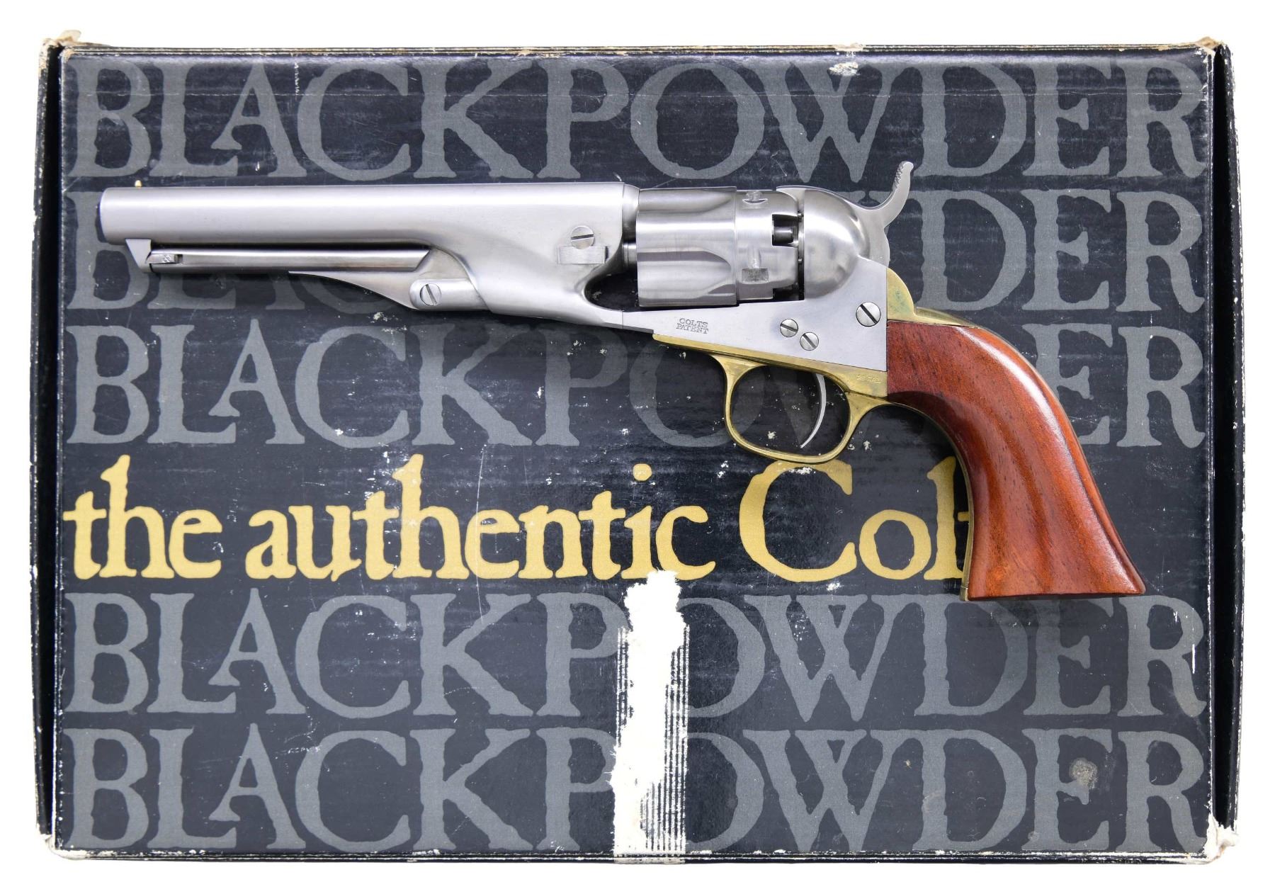 STAINLESS STEEL REVOLVER. Cal. 31. S# 49018. Bbl. 5 1/2" round w/ brass cone type sight. Five shot fluted rebated cyl. Stainless steel construction w/ brass grip straps. 1 piece walnut grip. Mfg. 1979-1981. UNATTACHED ACCESSORIES: original foam-lined box containing owner's manual packet. CONDITION: appears unfired. Brass grip straps are starting to acquire a very mild patina. Very good grips. Bright near excellent bore. PROVENANCE: from the renowned collection of quality sporting arms from Lewis Drake together with inventory of Lewis Drake Associates. (01-26146/DS). ANTIQUE. $450-650.