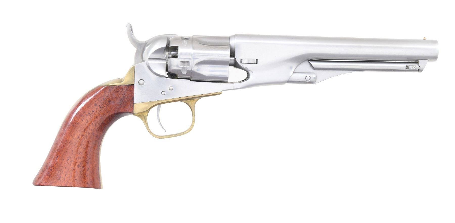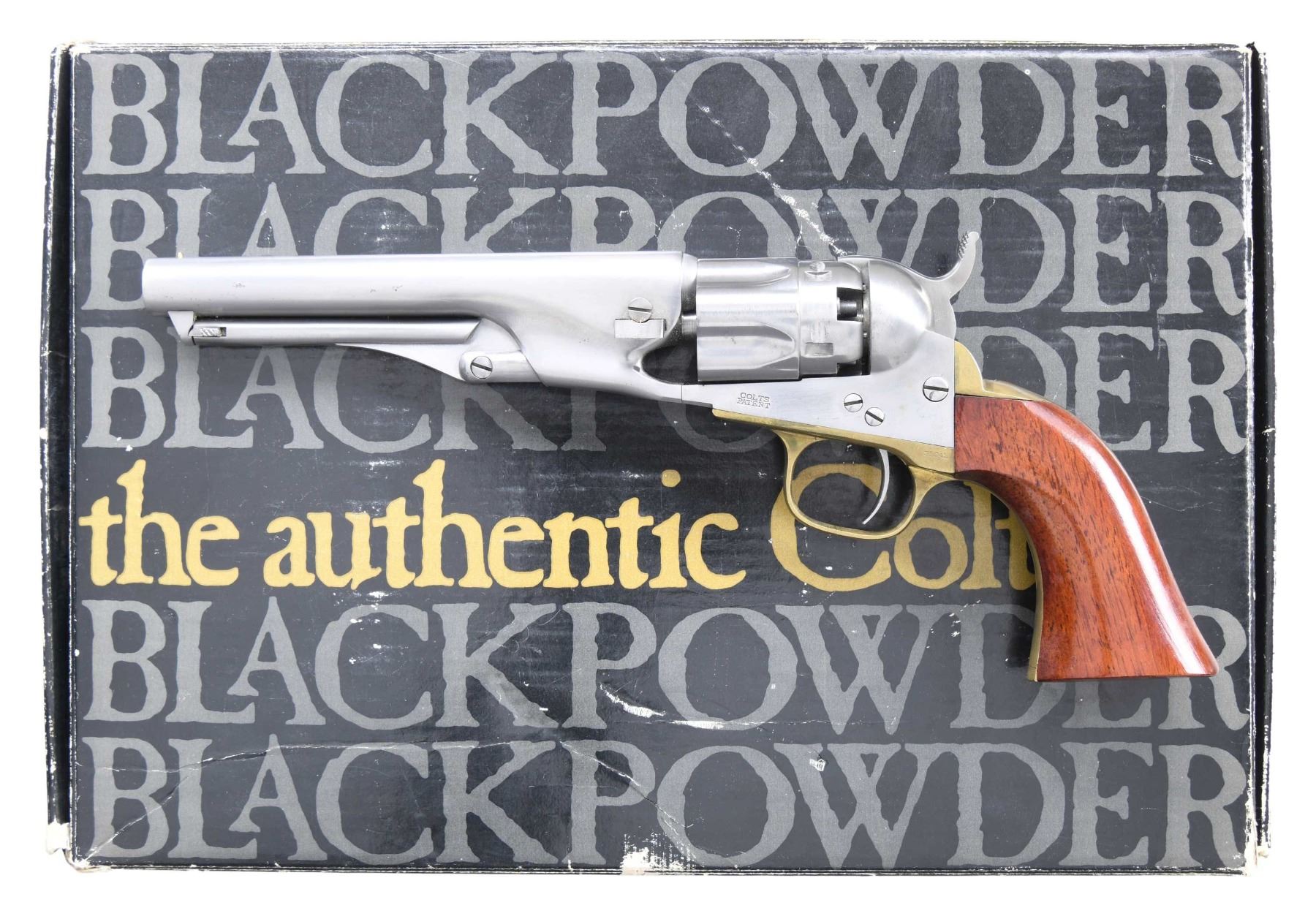 STAINLESS STEEL REVOLVER. Cal. 31. S# 49016. Bbl. 5 1/2" round w/ brass cone type sight. Five shot fluted rebated cyl. Stainless steel construction w/ brass grip straps. 1 piece walnut grip. Mfg. 1979-1981. UNATTACHED ACCESSORIES: original foam-lined box containing owner's manual packet. CONDITION: appears unused, bbl. & action show small spots of corrosion. Brass grip straps are starting to acquire a mild patina. Very good grips. Bright near excellent bore. PROVENANCE: from the renowned collection of quality sporting arms from Lewis Drake together with inventory of Lewis Drake Associates. (01-26147/DS). ANTIQUE. $450-650.