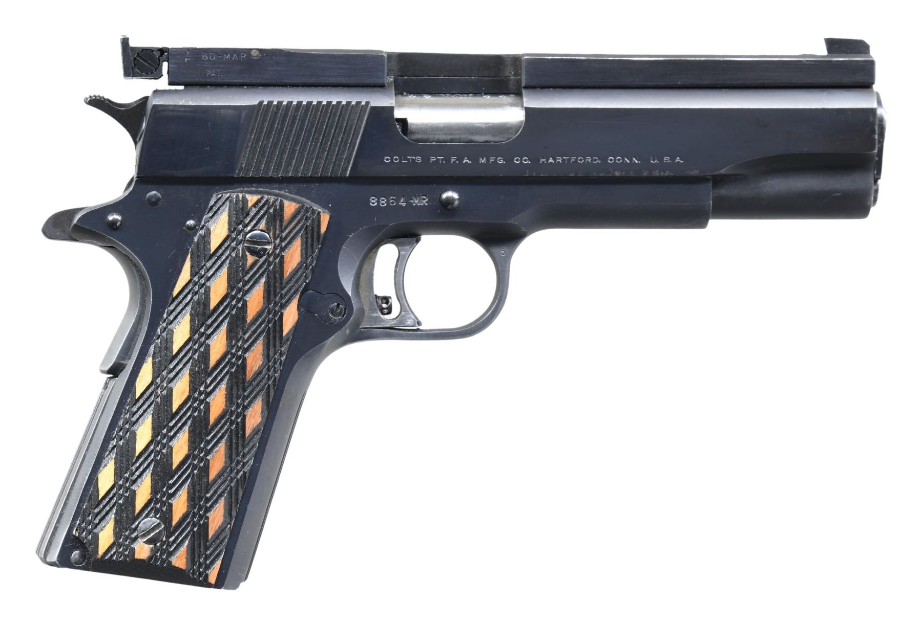 PISTOL. Cal. 38 Spl. Mid Range. S# 8864-MR. Bbl. 5" factory National Match. Mfg. 1971 (1960-1971) as bullseye target pistol that uses 38 Wadcutter ammo. Fitted with Bo-Mar rib intended for 45 ACP; port outline doesn't follow slide. Rib has undercut match front sight and fully adjustable rear. Standard controls to include grooved front strap and flat grooved mainspring housing. Checkered hardwood grips having checkered backgrounds and light colored raised diamonds; factory slotted grip screws. MAGS: NONE. CONDITION: very good overall appearance with slight high edge wear most notable on corners of rib and slide. Near excellent bore and grips. Thumb safety functions on safe position, but if trigger is pulled while on safe and then if safety is moved to the fire position, the hammer falls to its "safe" position rather than properly staying fully cocked; recommend gunsmith attention. The foregoing condition also allows hammer to follow slide when released by slide stop. (25-3312/NW). MODERN. $650-900.