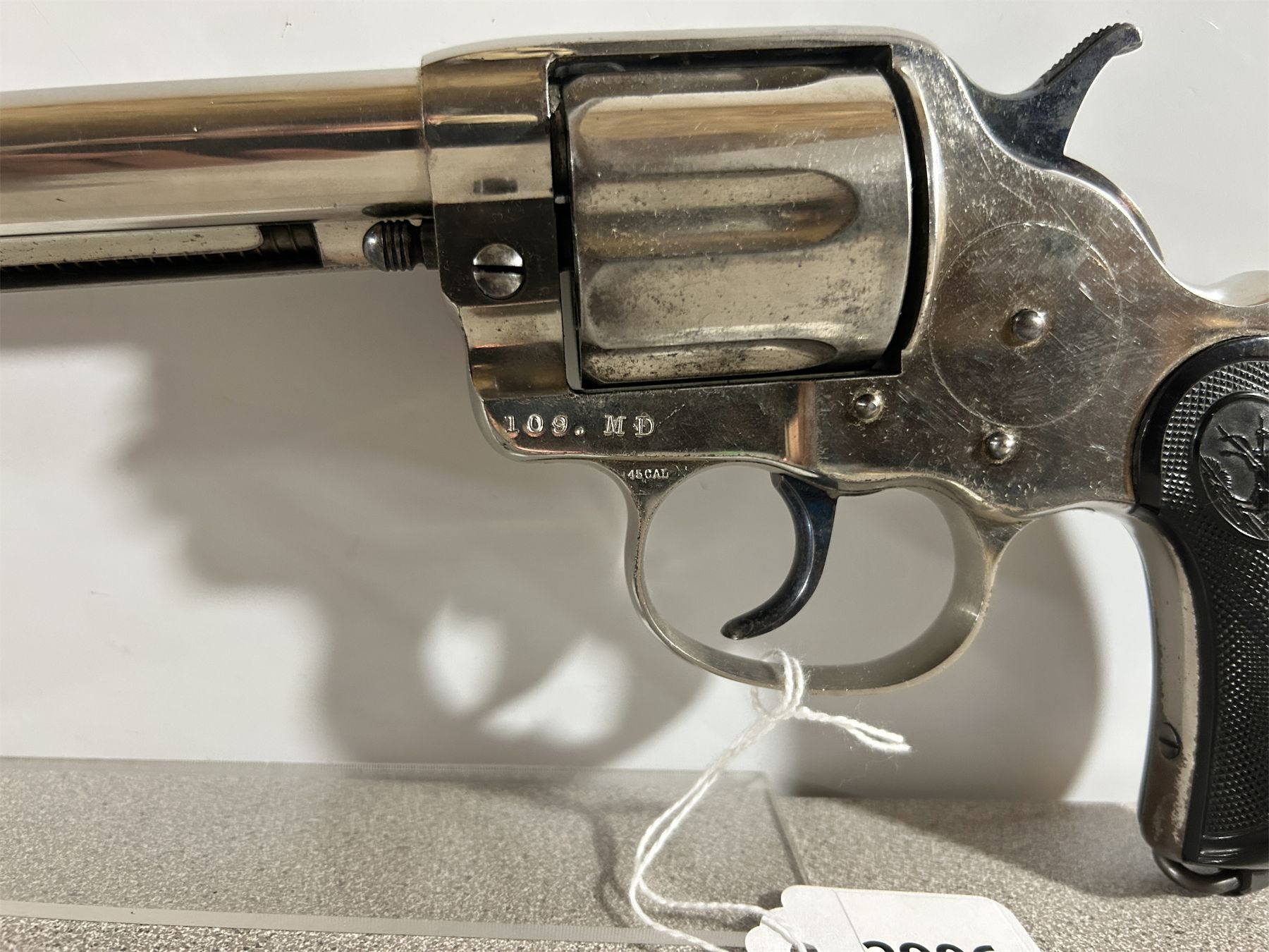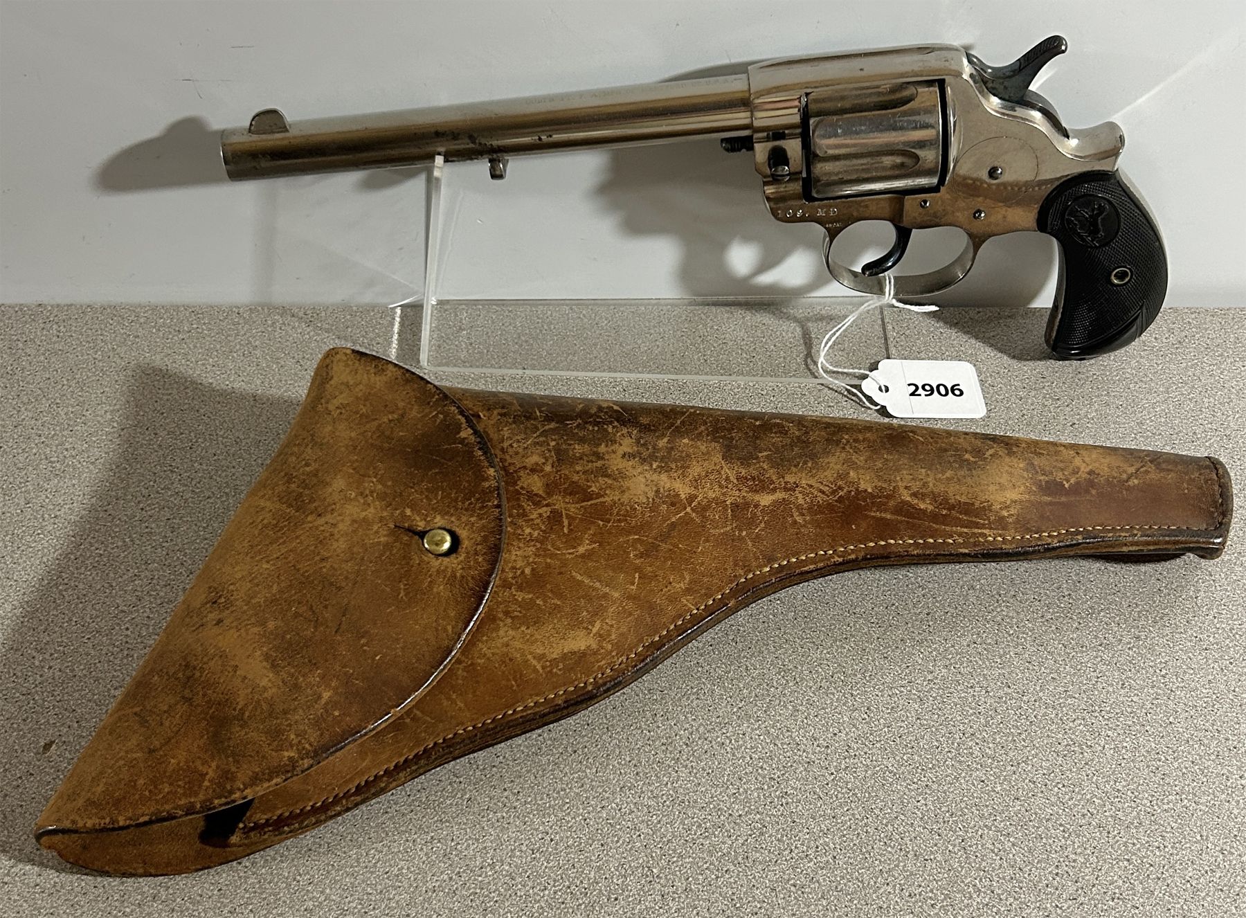 CONDITION: VG OVERALL INCLUDING BORE. ONE OF 1001 PURCHASED BY THE CND GOV'T AT THE OUTBREAK OF THE RIEL REBELLION. SPECS: 191 MM BARREL. 6 SHOT REVOLVER. NICKEL FINISH. EXTRAS: ORIG LEATHER HOLSTER. S/N: 14645.