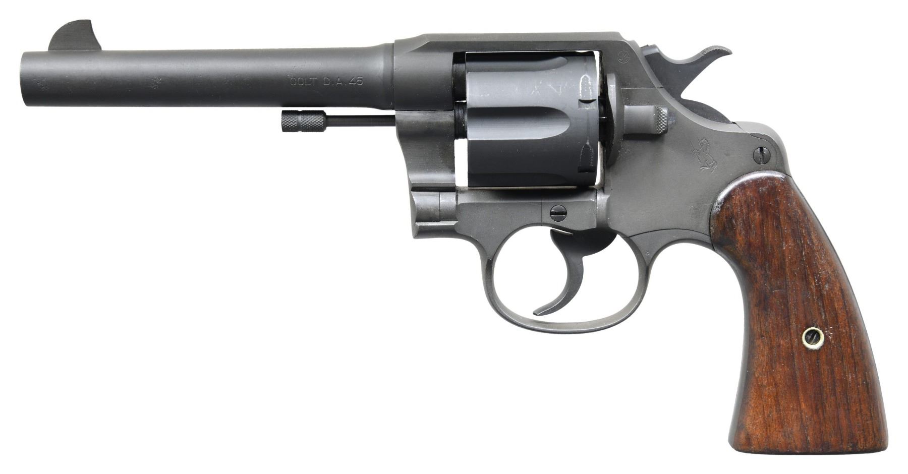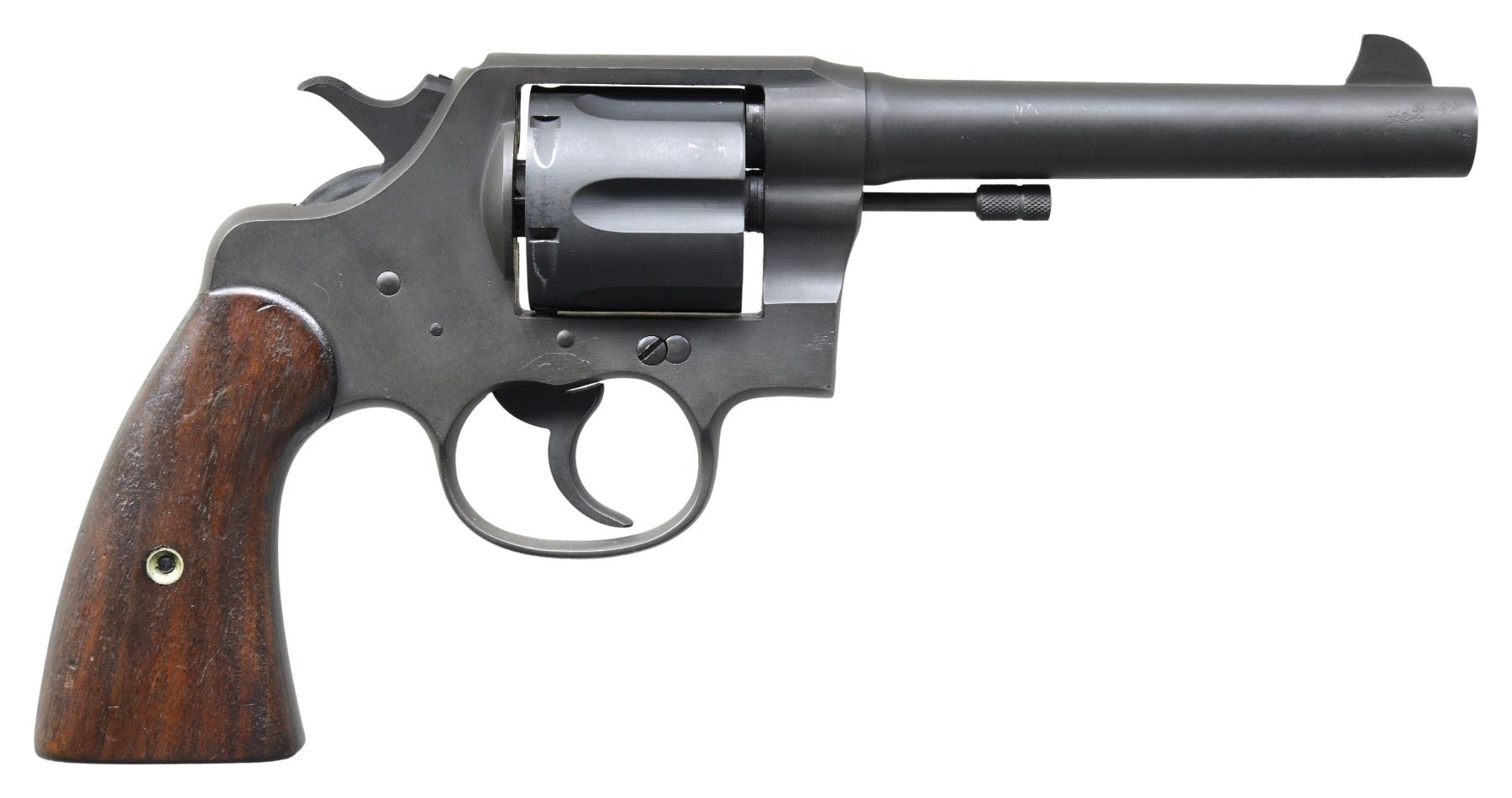Cal. 45 ACP. S# 205434. Bbl. 5 1/2" with blade sight and "UNITED STATES PROPERTY" on bottom; 1905 last patent date. Mfg. 1917-1919 as US Military service revolver using New Service frame. US Military butt markings and number are removed by shortening butt, but New Service number is on crane and yoke; these numbers were usually about 150,000 higher than butt markings yielding a prior butt number of about 55000 which matches the period of its JMG inspector mark. Finish appears from bead blasting and subsequent bluing giving a matte appearance; includes hammer and trigger. Varnished service grips are both pencil numbered "256332" on backs and proud at butt due to frame shortening. CONDITION: very slight cleaned oxidation on sides of frame under grips. Slight function wear to include cylinder turn line. Occasional faint rub marks on its satin finish. Good to very good grips with faint marks in butt area. Good to very good bore with hint of frosting in grooves. (25-3673/NW). CURIO. $450-600.