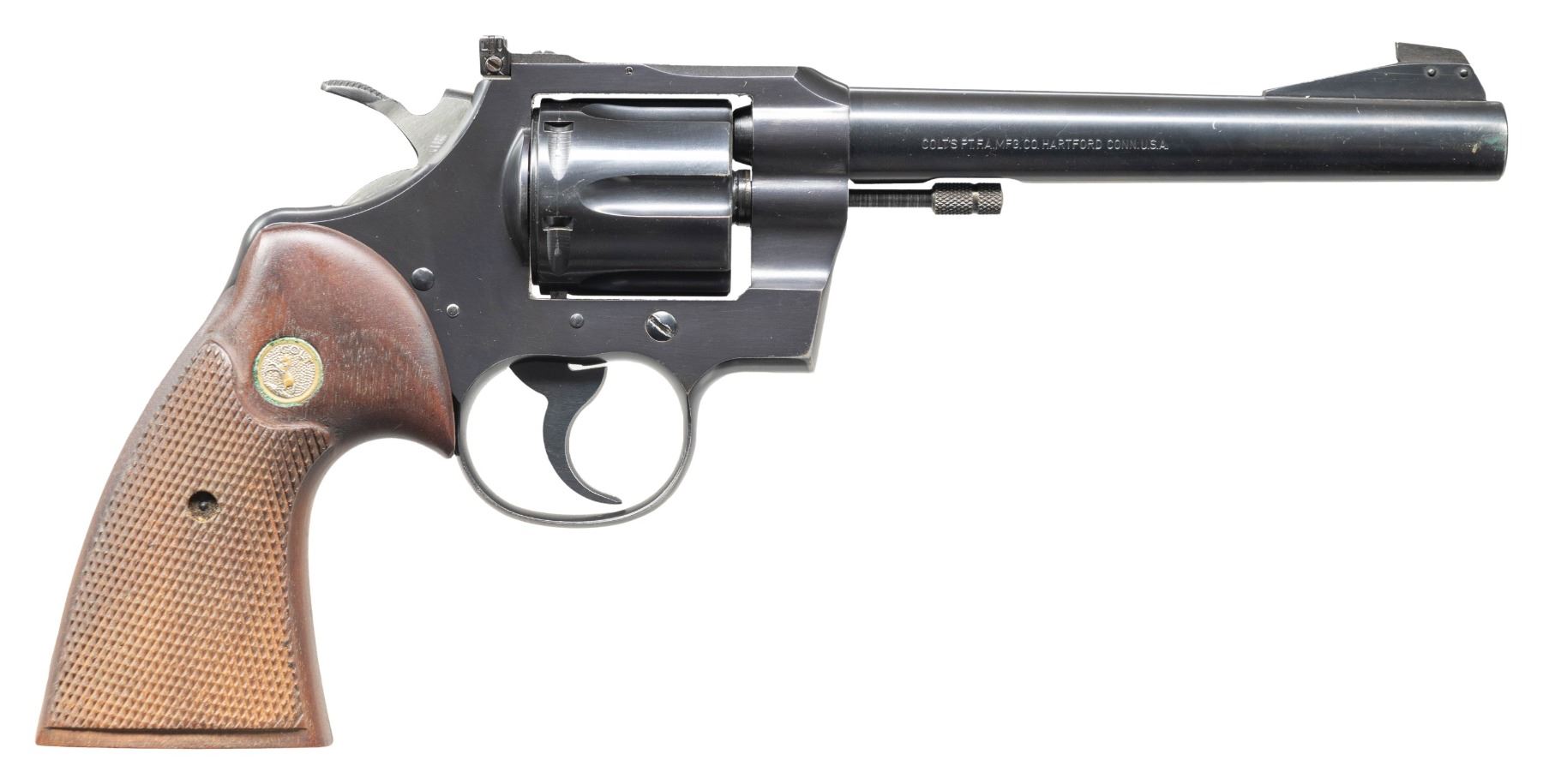 REVOLVER WITH FACTORY BOX. Cal. 22 LR. S# 80705. Bbl. 6". Officers Model Match double action revolver mfg. by Colt in 1961. Left side of the bbl. is marked "OFFICERS MODEL MATCH/ CAL. .22 LONG RIFLE", with Colt's single line address marked on the right. Left side of the frame is marked with the Rampant Colt logo. Metal components exhibit a blue finish overall, save for on the sides of the hammer, which are polished in-the-white. Frame is mounted with apparent custom 2-piece checkered wood grips, each inlaid with a silver Colt medallion on either side, and marked "5" on the butts. Ramped blade front sight with adj. square notch rear sight. Grooved trigger and back strap. Matching numbers are present on the frame and cyl. crane. UNATTACHED ACCESSORIES: matching factory wood grain cardboard box containing a non-matching factory test target, unused warranty card, as well as an envelope containing a spare cyl. bolt and bolt spring. CONDITION: metal components retain the majority of their original factory blue finish, showing some light to mild edge wear, as well as some superficial handling marks and scratches overall. Mirror bore, retaining well defined rifling throughout. Proper manual mechanics. Grips are very good overall. Box is in poor condition, exhibiting taped repairs along all edges. (25-6258/MLW). CURIO. $300-500.