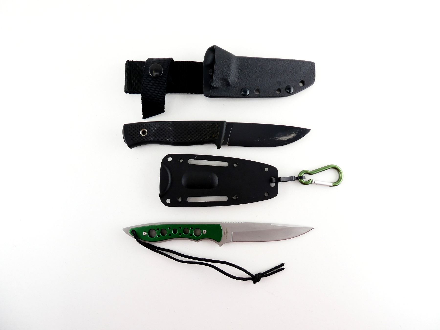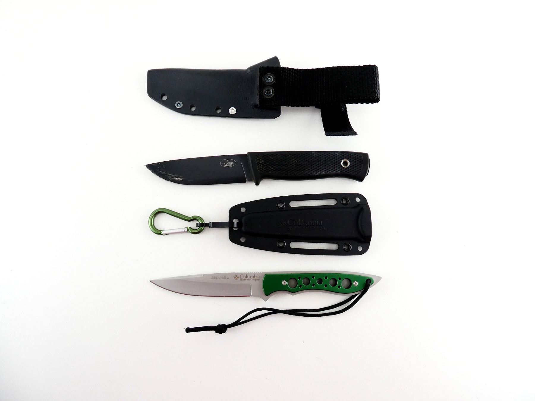 LOT INCLUDES; (1) COLUMBIA KNIFE, STAINLESS STEEL BLADE, MARKED "COLUMBIA", ETC., ALUMINUM HANDLE, UNMARKED, SHOWS WEAR & TEAR / USE MARKS, BLADE OVERALL LENGTH APPROX. 4", OVERALL LENGTH APPROX. 8.25", WITH BLACK POLYMER SHEATH, MARKED "COLUMBIA", ETC. & (1) FALLKNIVEN KNIFE, STEEL BLADE, MARKED "F1 FALLKNIVEN LAM VG10", HARD RUBBER HANDLE, UNMARKED, SHOWS WEAR & TEAR / USE MARKS, BLADE OVERALL LENGTH APPROX. 3 7/8", OVERALL LENGTH APPROX. 8.5", WITH BLACK POLYMER SHEATH, UNMARKED. SEE PHOTOS.