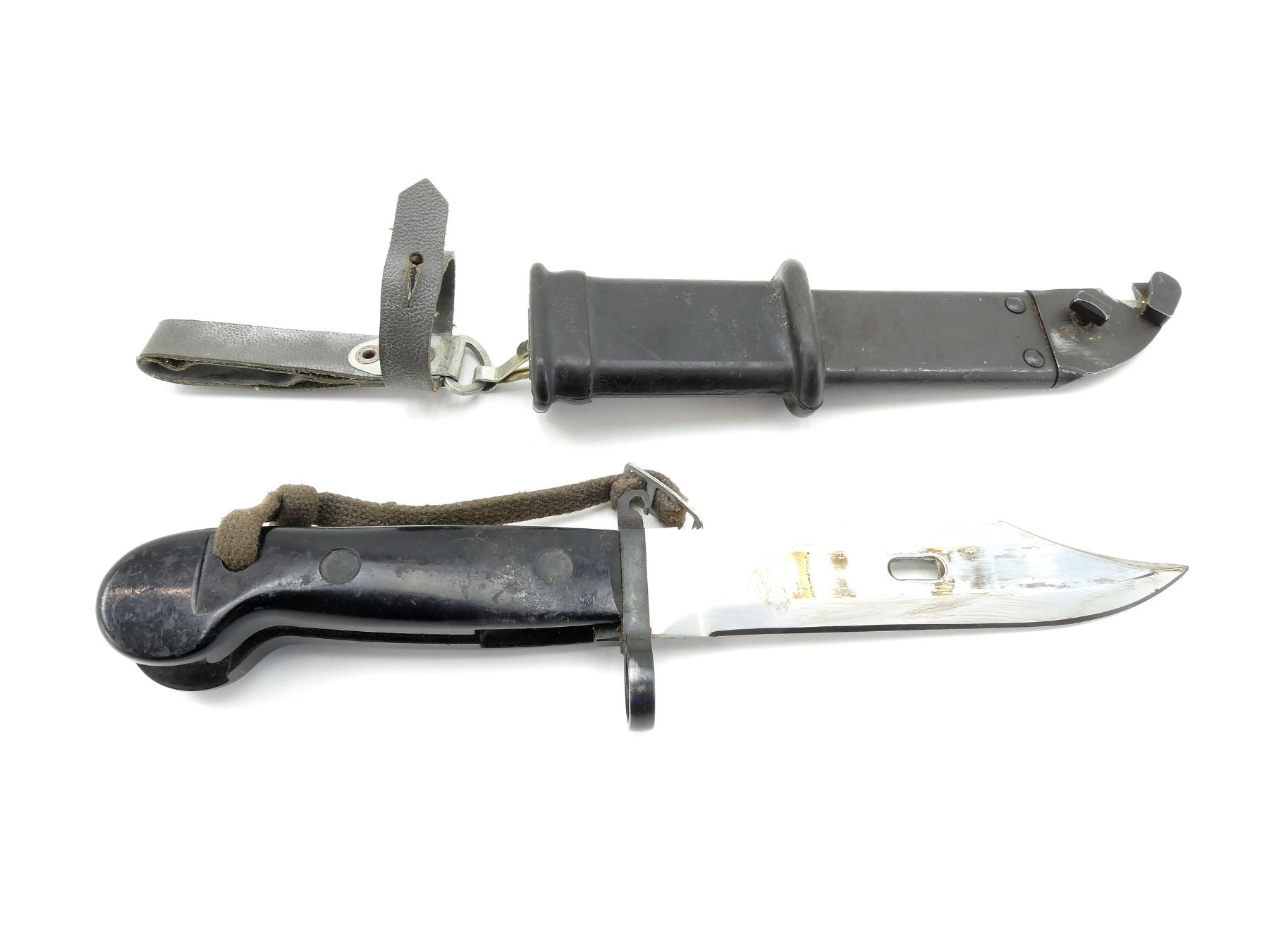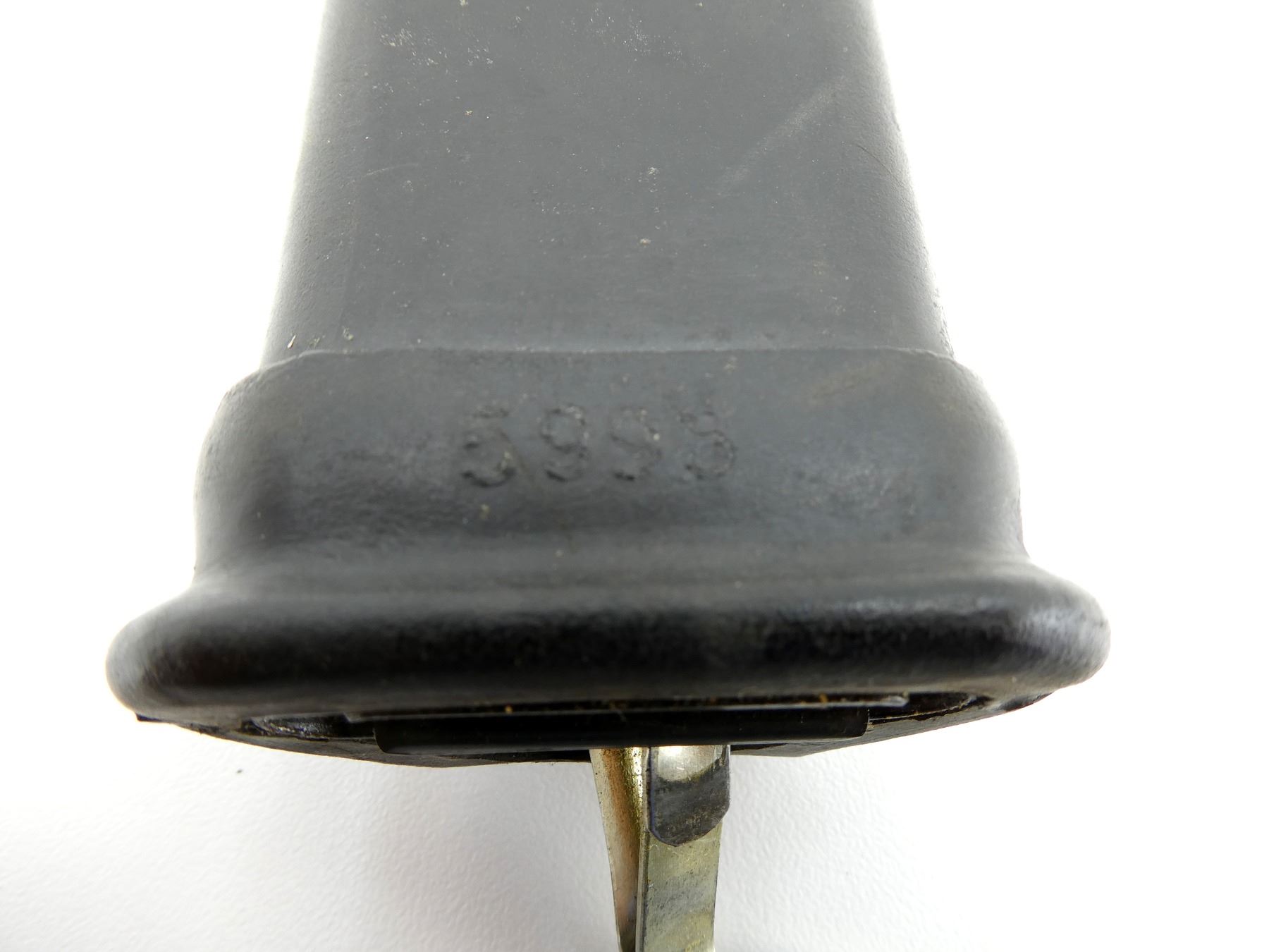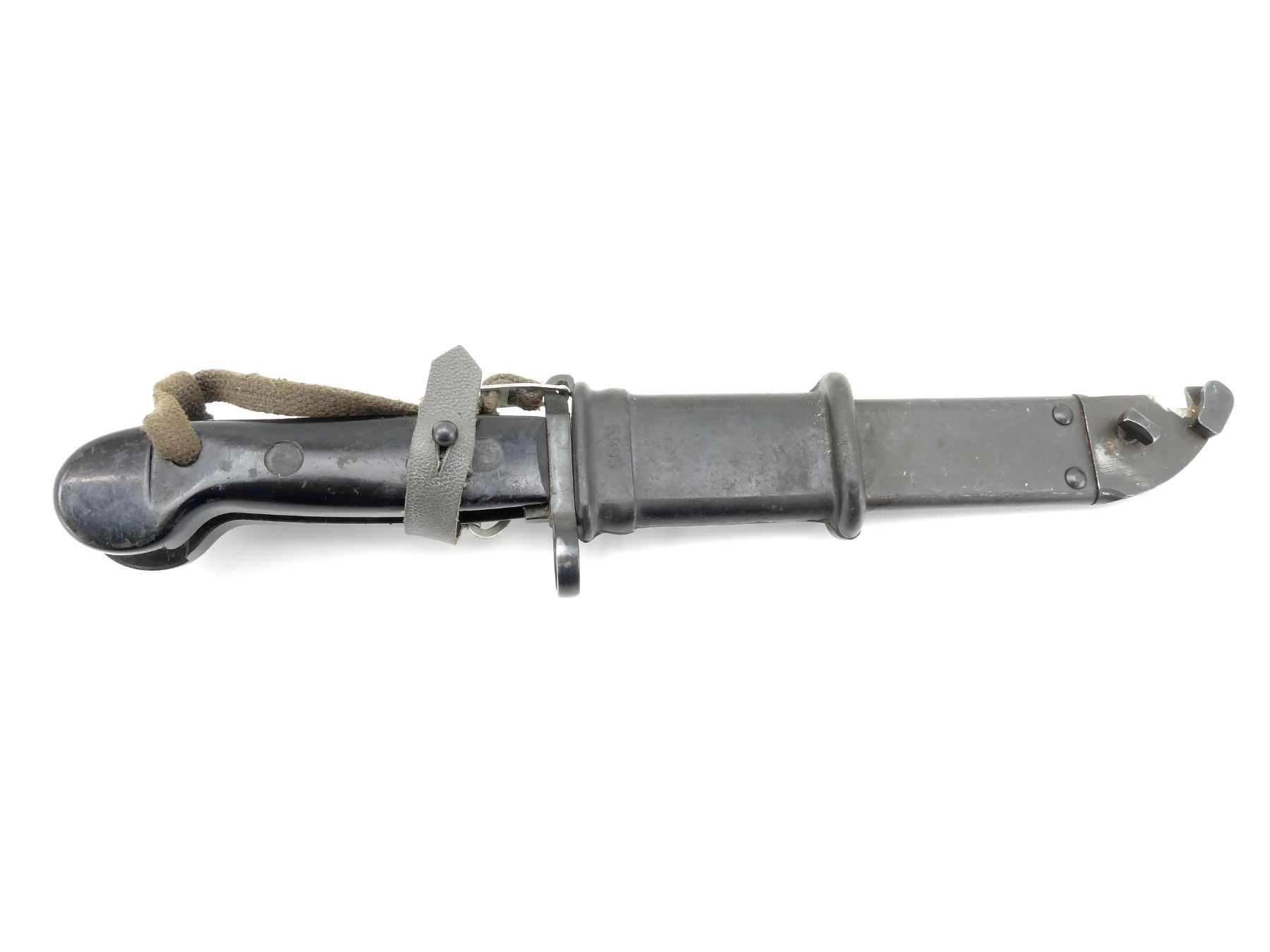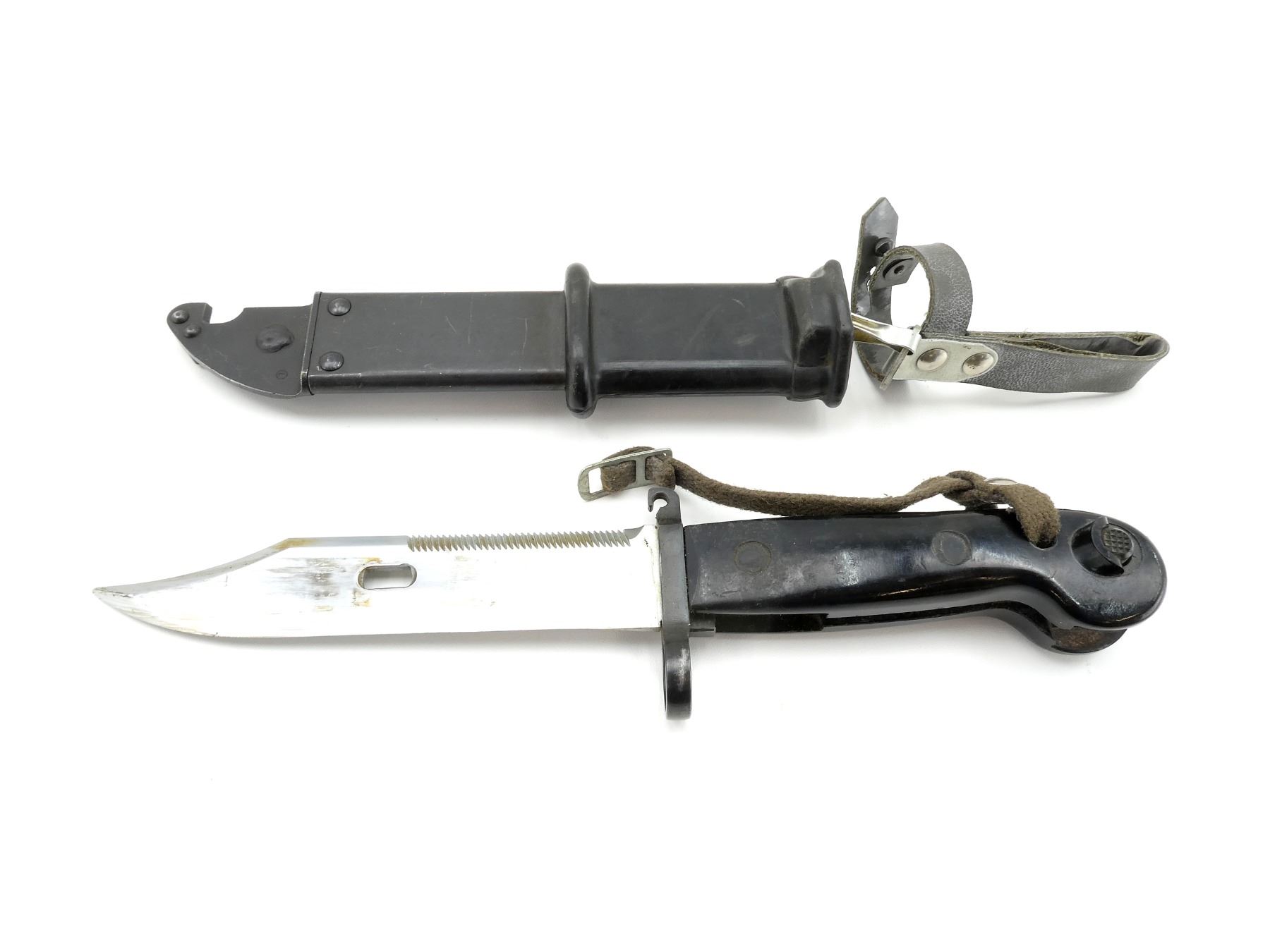 (1) FITS 7.62MM AKM & 5.45MM AK74 RIFLES, CROSS PIECE MARKED WITH PROOF MARK, METAL IN-BETWEEN BLACK POLYMER GRIPS MARKED: "??4409", METAL POMMEL, BLACK RUBBER / STEEL SCABBARD MARKED: "5998", WITH LEATHER / METAL TAB, SCABBARD & BLADE ALSO WORK AS WIRE CUTTERS, BLADE APPROX. 6" & OVERALL LENGTH APPROX. 11". SEE PHOTOS.