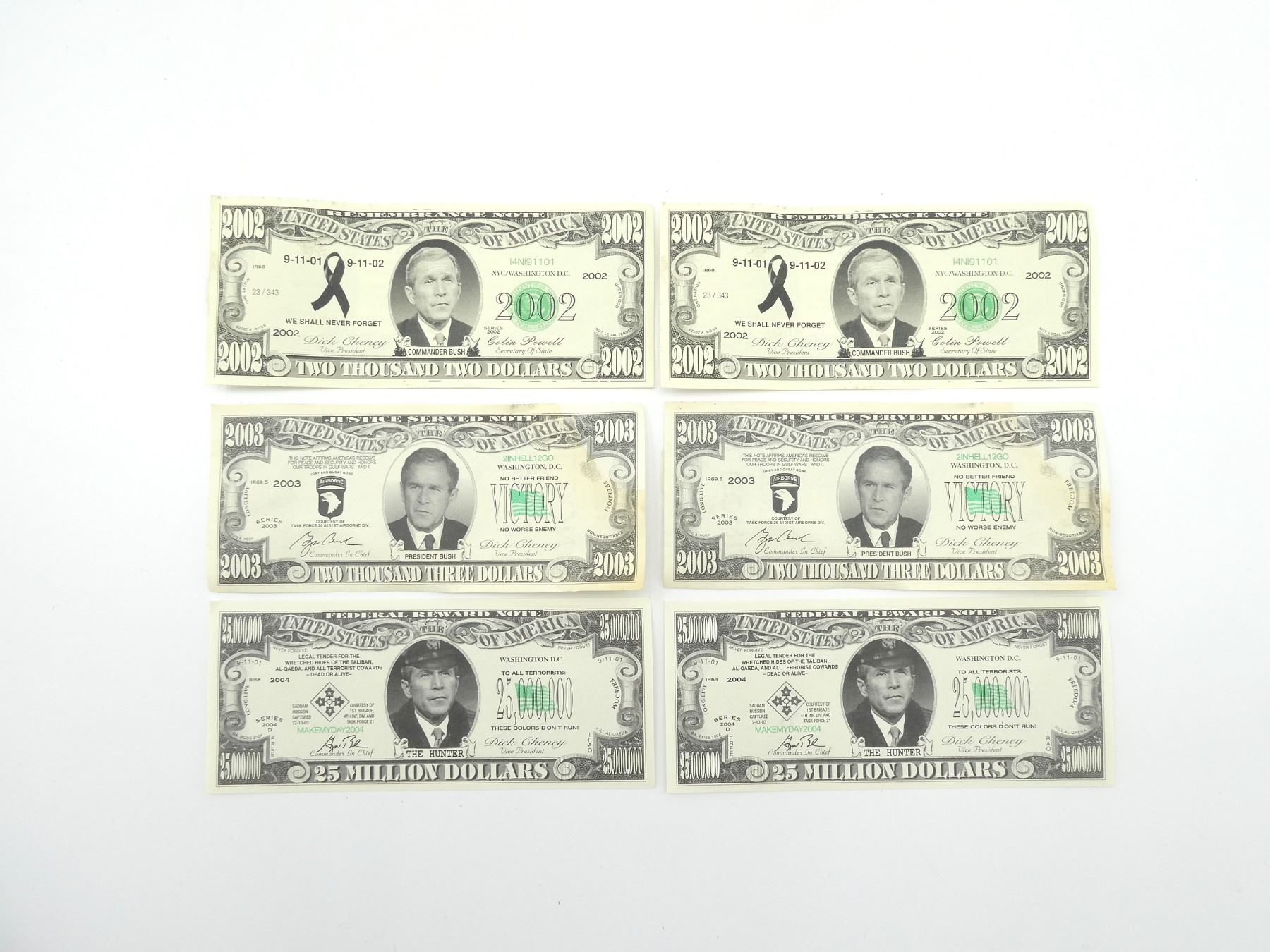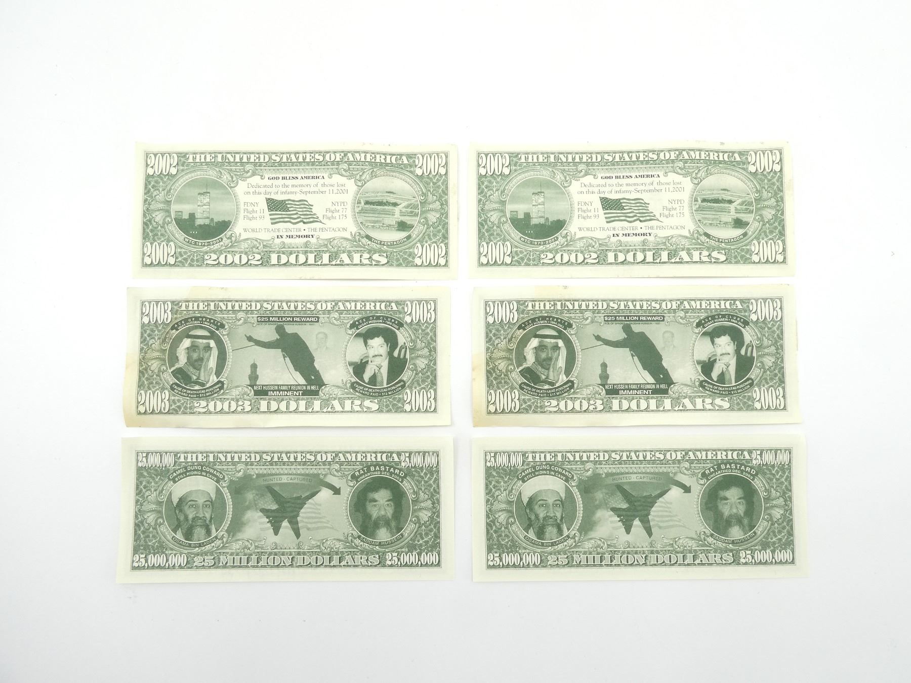 LOT INCLUDES; (2) TWO THOUSAND TWO DOLLAR BILLS, REMEMBRANCE NOTES, DEDICATED TO THE MEMORY OF SEPTEMBER 11, 2001, VARIOUS IMAGES / MARKINGS, (2) TWO THOUSAND TREE DOLLAR BILLS, JUSTICE SERVED NOTES, HONORING THE TROOPS IN GULF WARS I & II, VARIOUS IMAGES / MARKINGS & (2) 25 MILLION DOLLAR BILLS, FEDERAL REWARD NOTES, FOR CAPTURE OF THE ENEMY, VARIOUS IMAGES / MARKINGS. SEE PHOTOS.