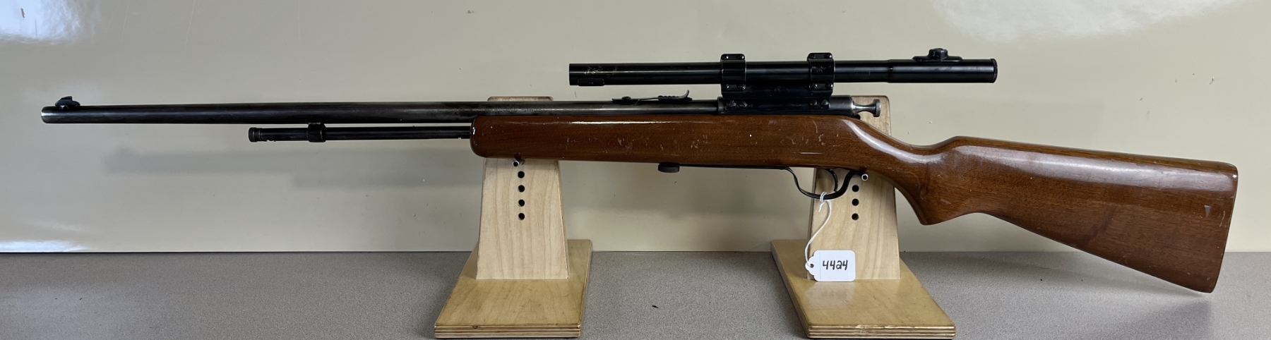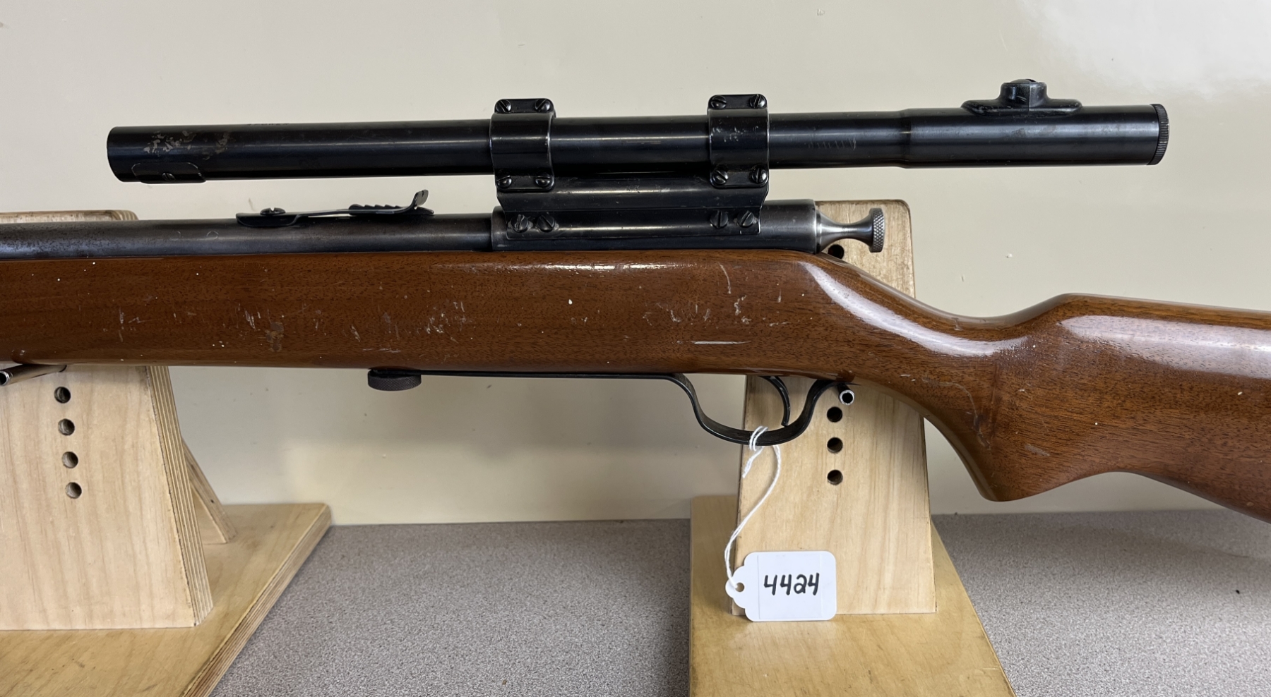 CONDITION: F OVERALL. BORE G. SPECS: 24IN BBL W/ IRON SIGHTS. EXTRAS: MOSSBERG NO.M4D 4 POWER SCOPE. CLEAR LENS. CROSSHAIR RETICLE. S/N: NONE.