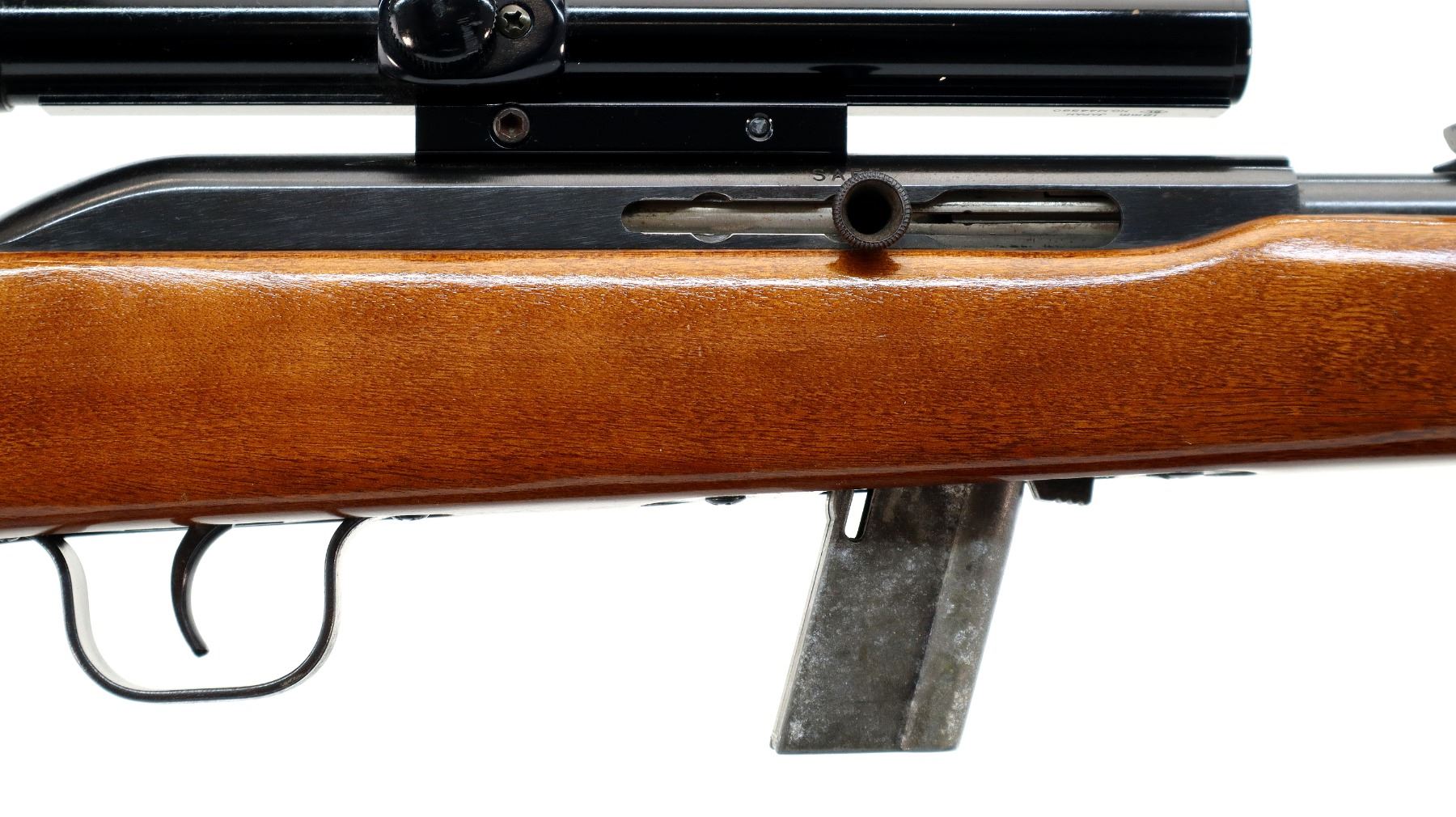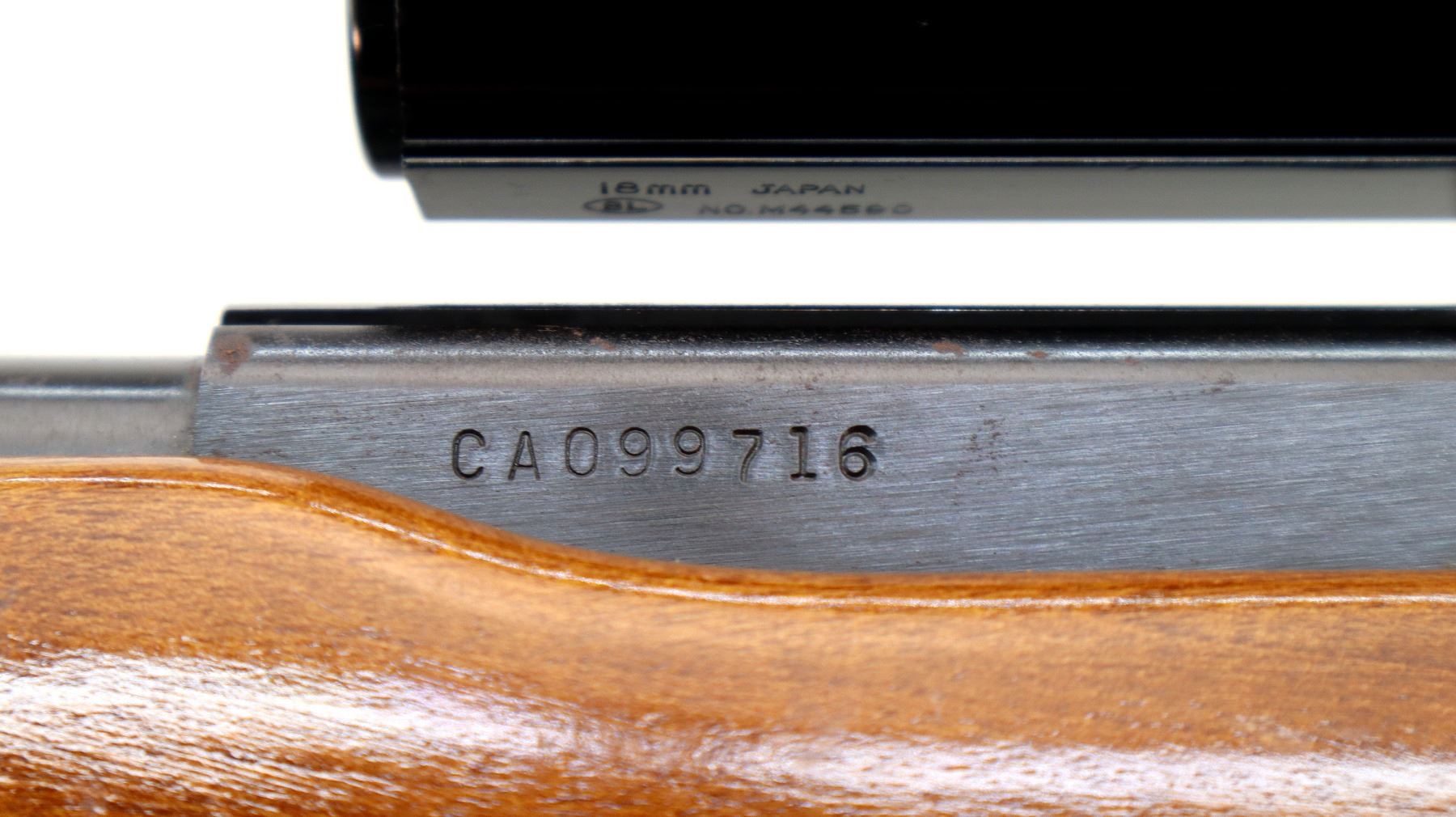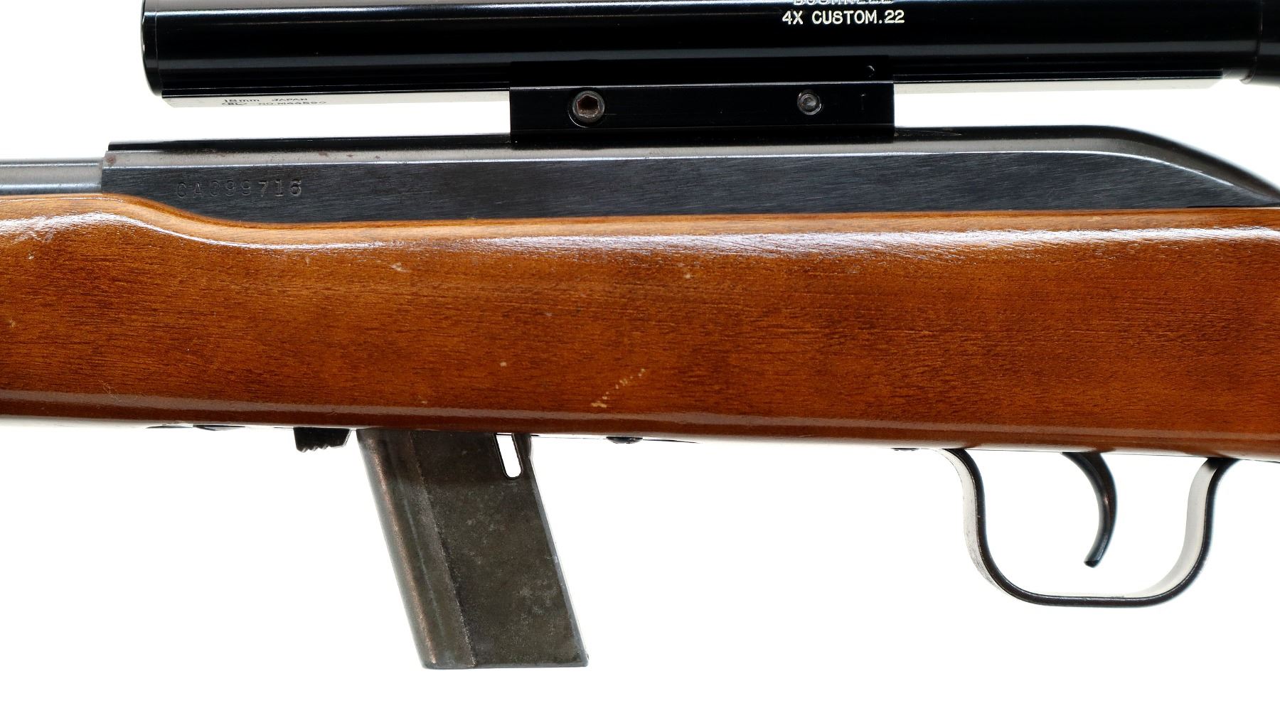 Main Description: Blade front sight, adjustable u notched rear sight, blued finish, grooved receiver with Bushnell 4x custom 22 scope installed, clear optics with fine crosshair. One piece wood stock, pistol grip, raised comb, checkered black polymer butt plate