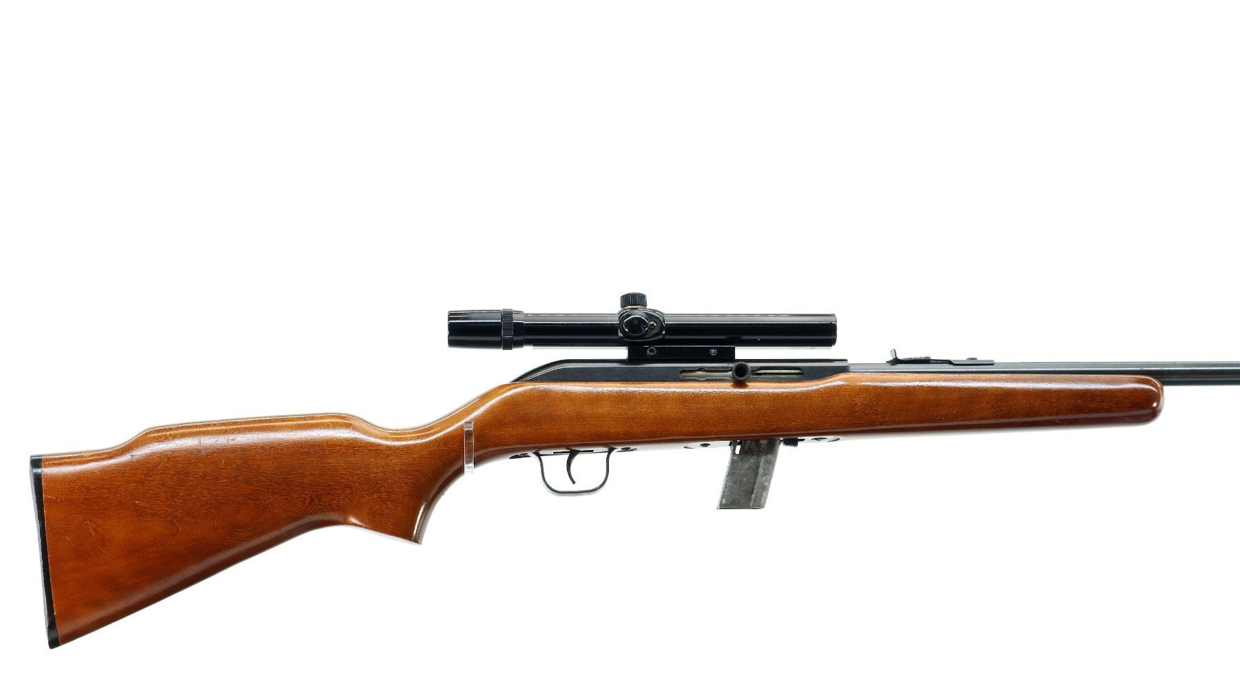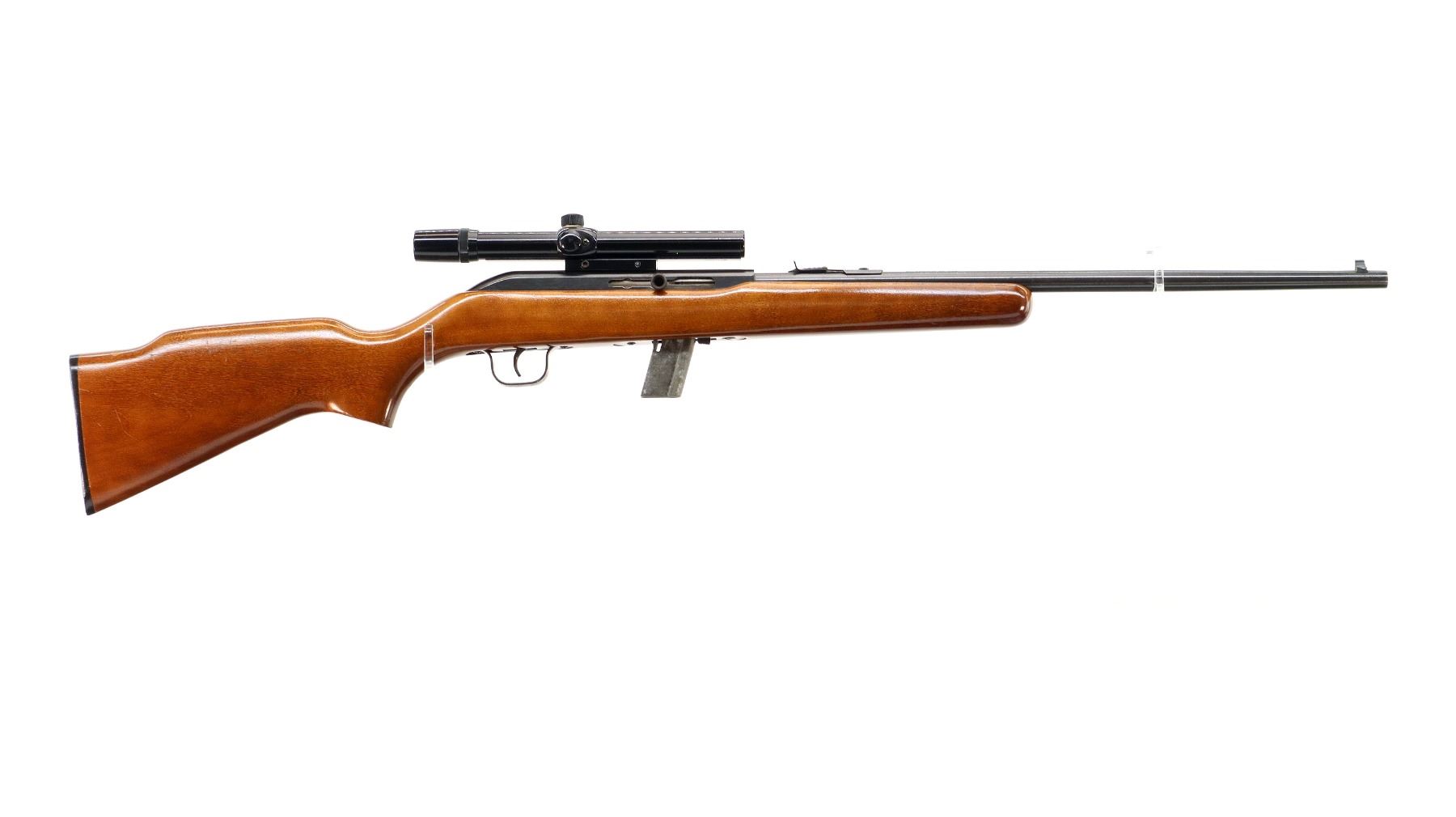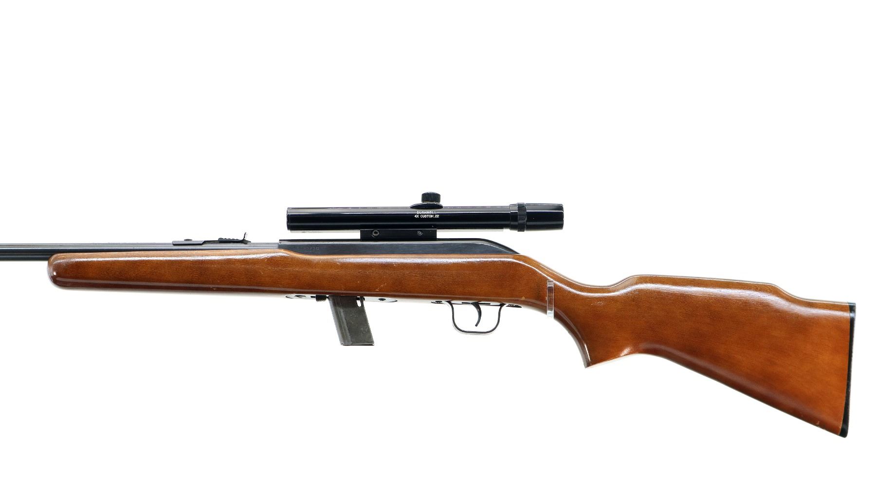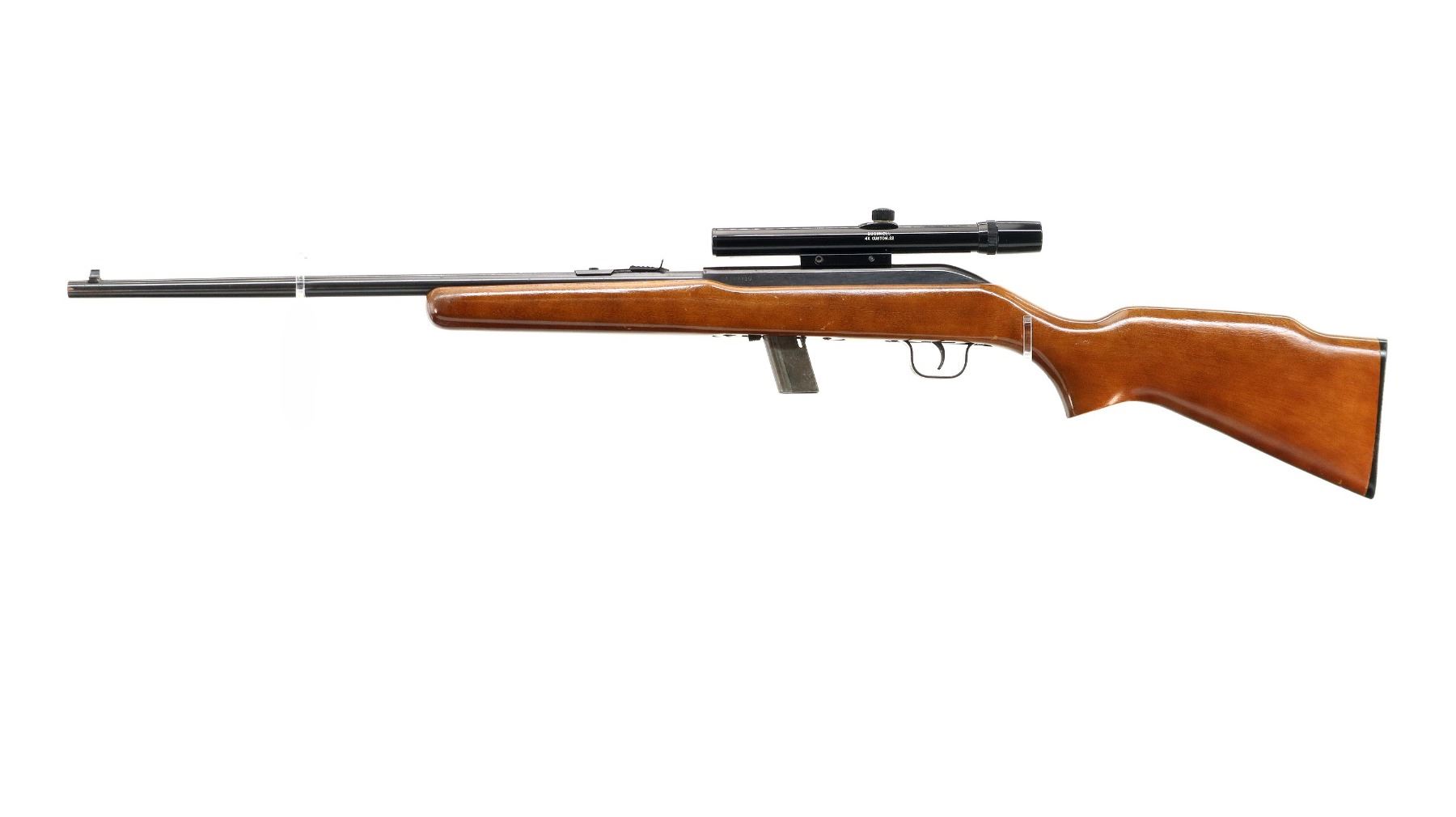 Main Description: Blade front sight, adjustable u notched rear sight, blued finish, grooved receiver with Bushnell 4x custom 22 scope installed, clear optics with fine crosshair. One piece wood stock, pistol grip, raised comb, checkered black polymer butt plate