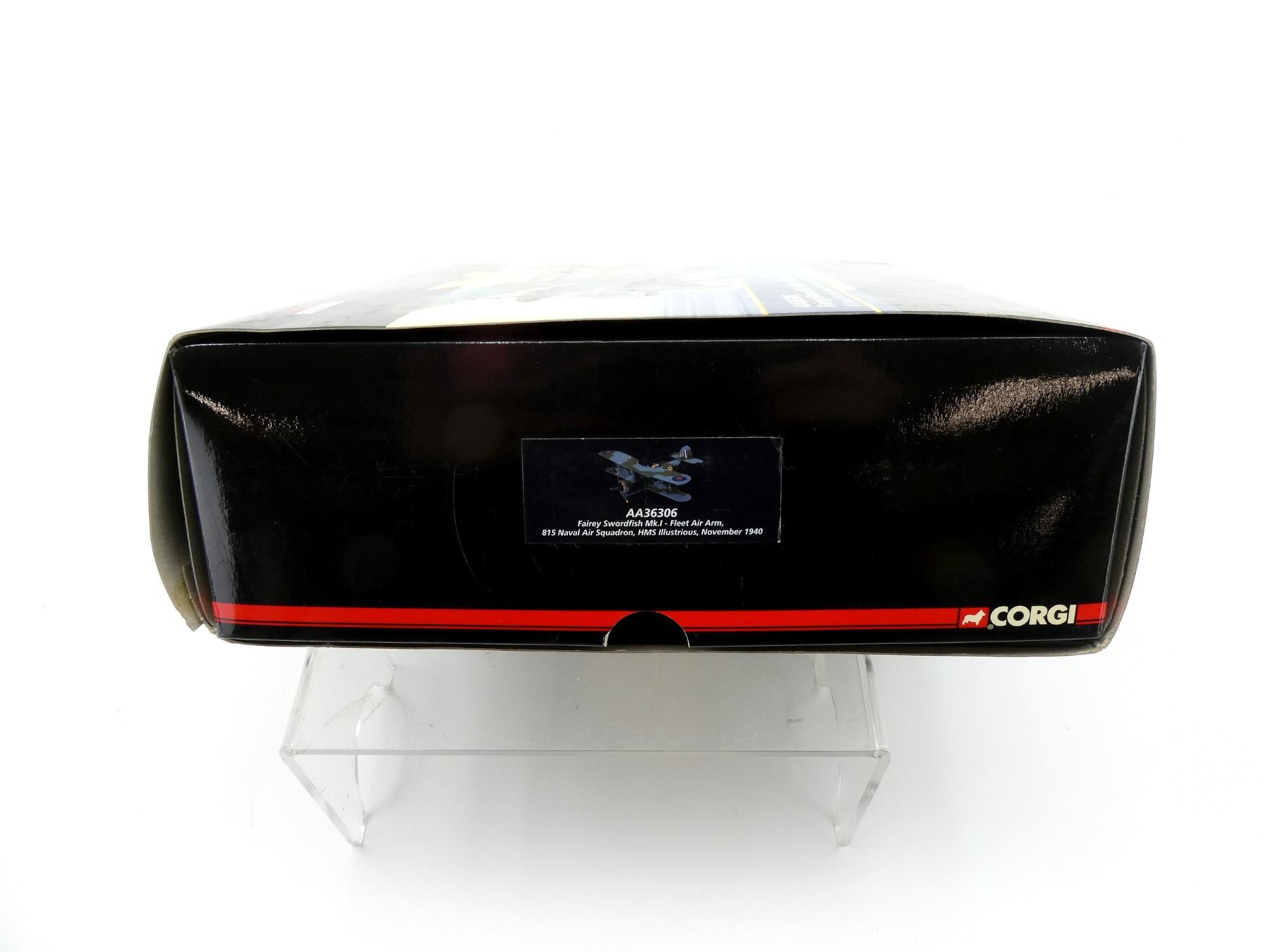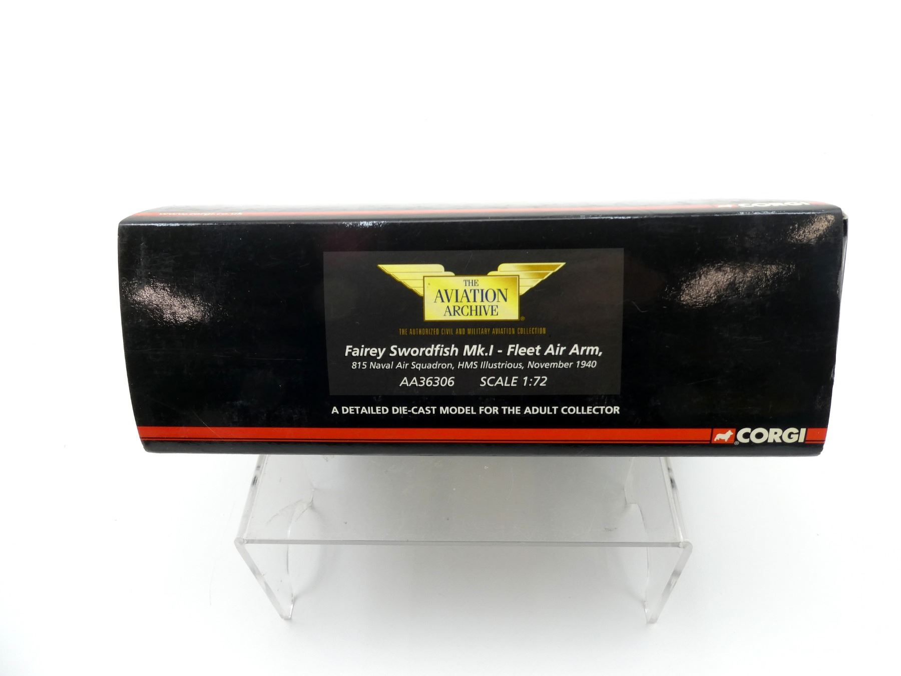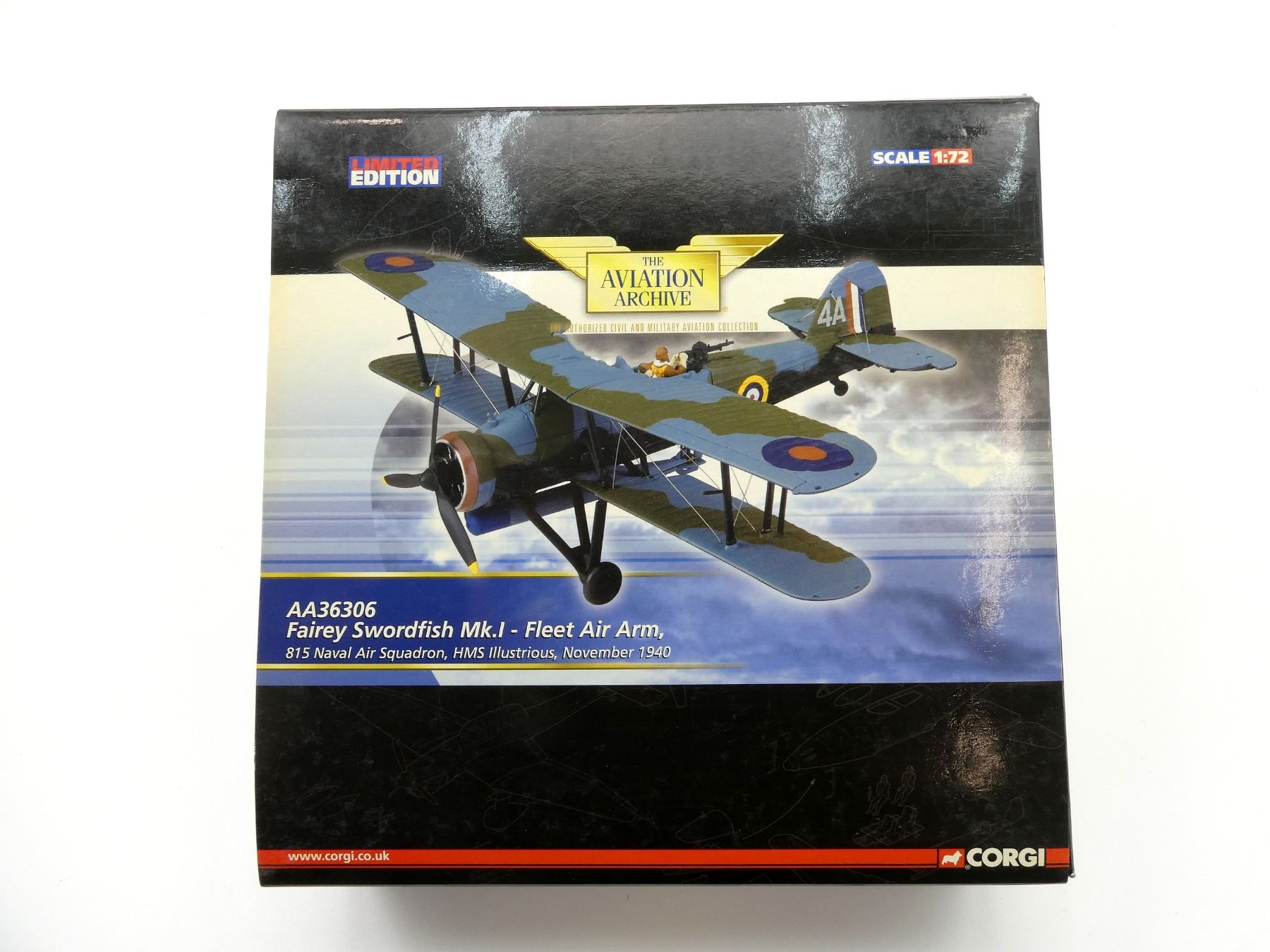 (1) CORGI FAIREY SWORDFISH MK.I-FLEET AIR ARM 815 NAVAL AIR SQUADRON, HMS ILLUSTRIOUS, NOVEMBER 1940 MODEL PLANE, LIMITED EDITION, NO. 1753 OF ONLY 2860 DISTRIBUTED WORLDWIDE, MADE BY CORGI / THE AVIATION ARCHIVE, 1:72 SCALE, APPEARS NEW OLD STOCK. SEE PHOTOS.