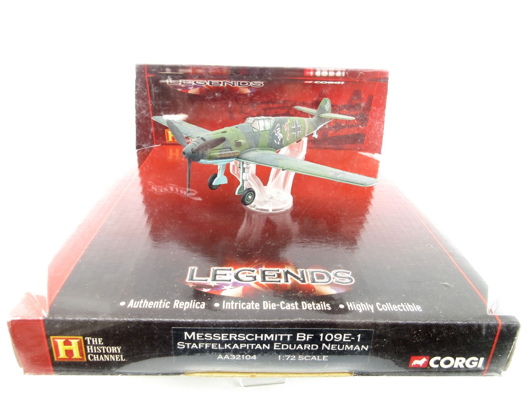 (1) CORGI LEGENDS OF FLIGHT: WWII ACES MESSERSCHMITT BF 109E-1 STAFFELKAPITAN EDUARD NEUMAN MODEL PLANE, MADE BY CORGI / THE HISTORY CHANNEL, 1:72 SCALE, APPEARS NEW OLD STOCK. SEE PHOTOS.