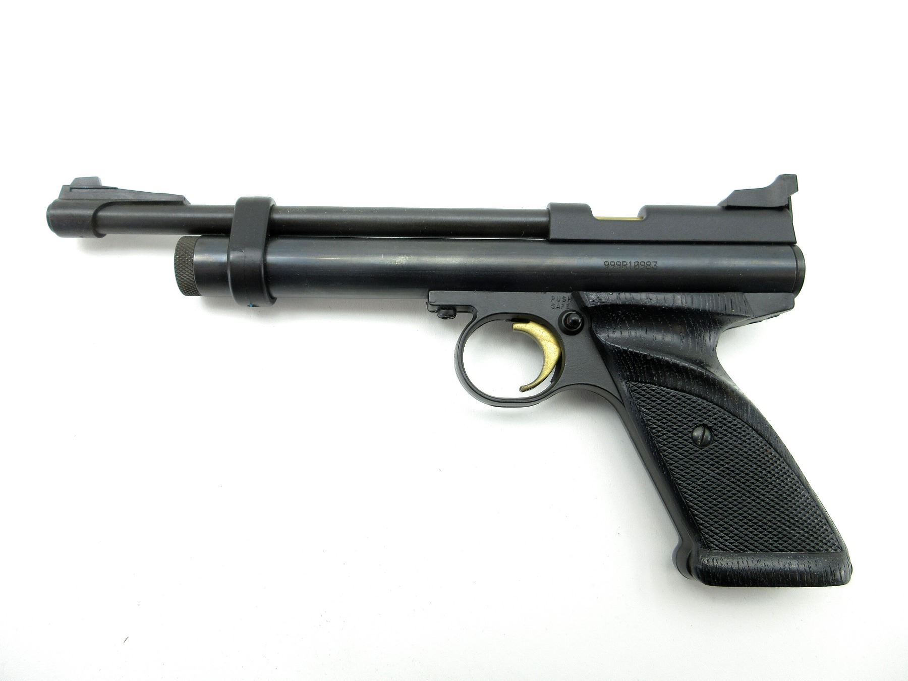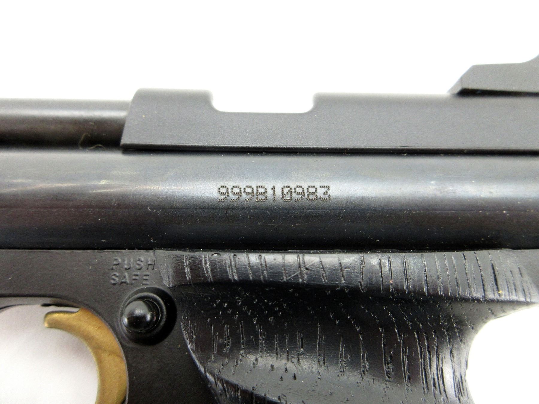 (1) .22 CAL. (5.5MM) PELLET, CO2, SINGLE SHOT, STEEL CONSTRUCTION, BLACK POLYMER GRIPS, MARKED: "999B10983", ETC., NOT FULLY TESTED, SHOWS WEAR & TEAR / USE MARKINGS. SEE PHOTOS.