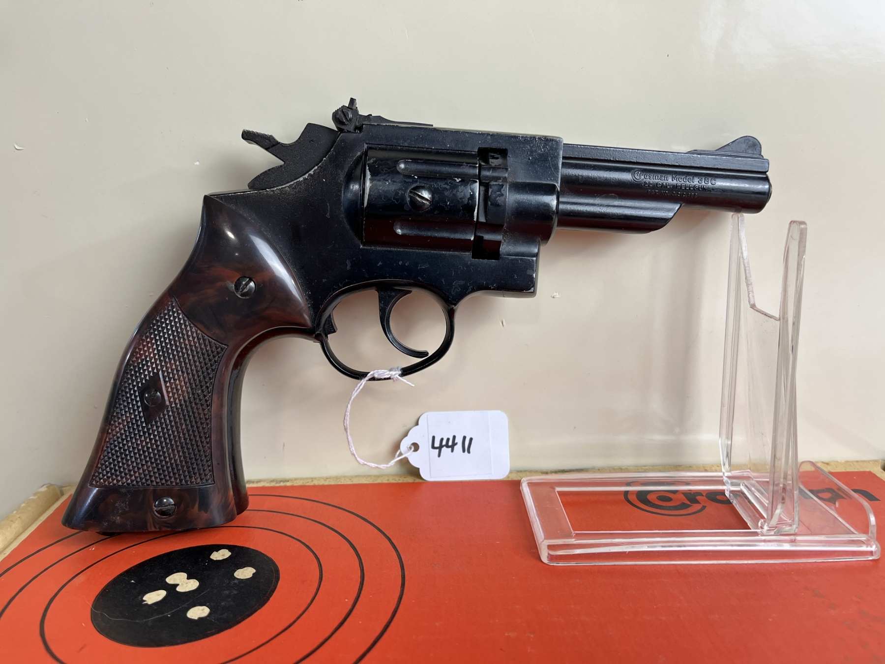 CONDITION: F-G OVERALL. SPECS: 3-3/4IN BBL. <500FPS. EXTRAS: ORIGINAL BOX, LEATHER HOLSTER, S/N: 930178