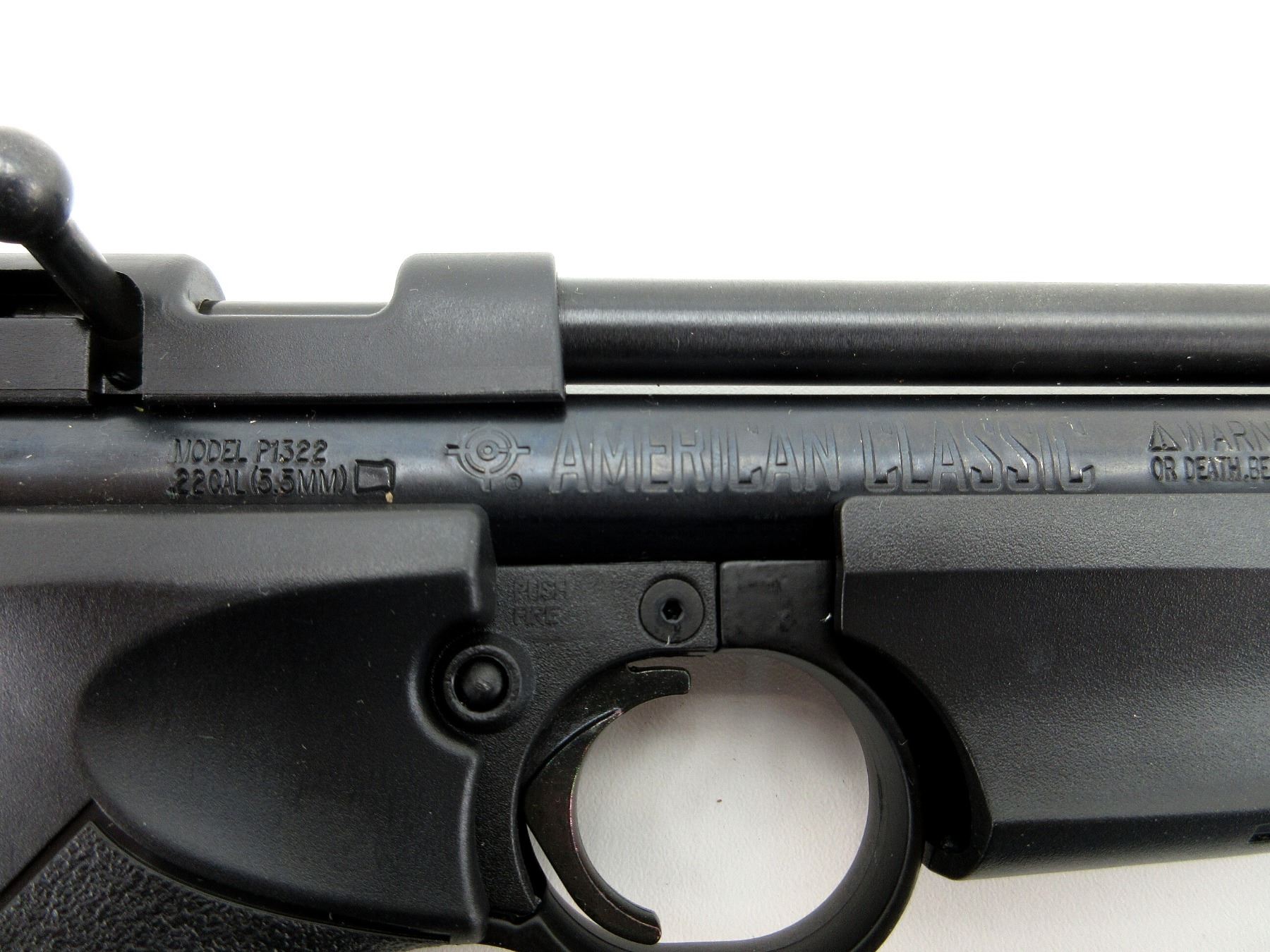 (1) .22 CAL. (5.5MM) PELLET, PUMP ACTION, SINGLE SHOT, UP TO 460 FPS, STEEL CONSTRUCTION, BLACK POLYMER GRIPS, MARKED: "AMERICAN CLASSIC", "MODEL P1322", "420B90078", ETC., NO COCKING ISSUES, NOT FULLY TESTED, WITH ORIGINAL PACKAGING, SHOWS LIGHT WEAR & TEAR / USE MARKINGS, MAY NOT BE COMPLETE / PIECES MAY BE MISSING. SEE PHOTOS.